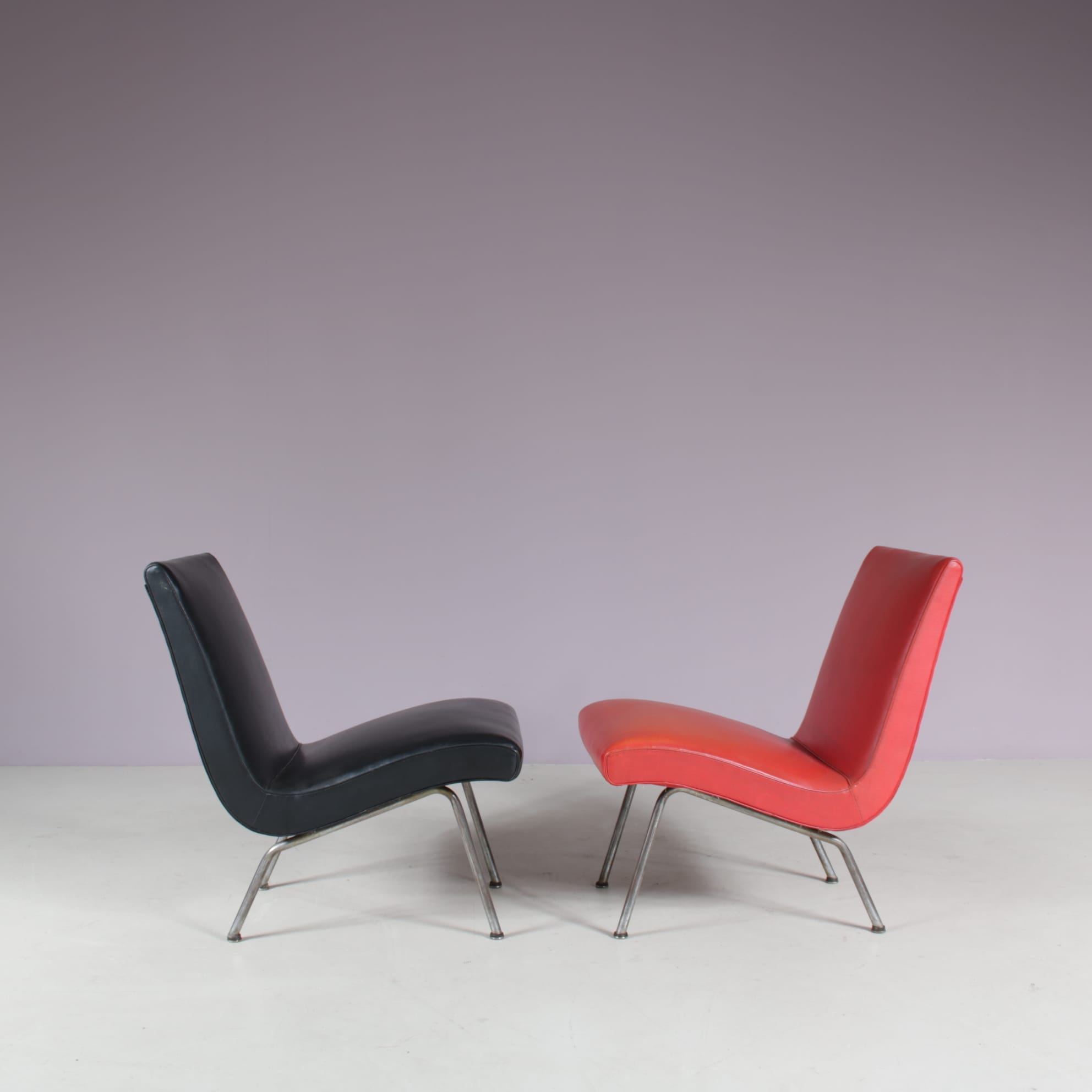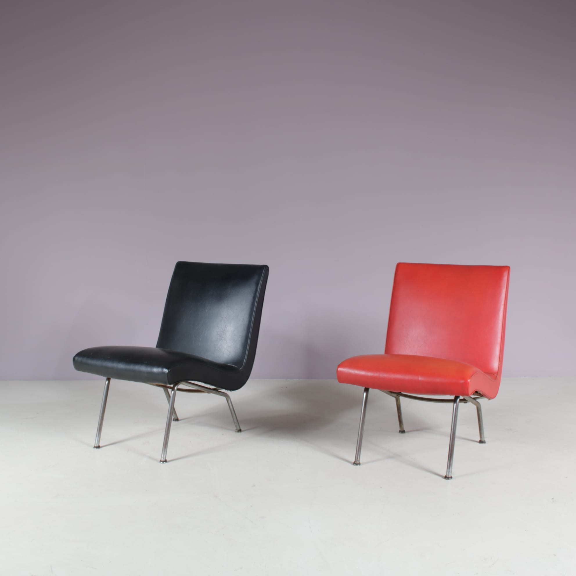 A highly recognizable chair after Jens Risom’s original design, redefined by the Walter Knoll Team. Designed to create a casual, modern style this version has a chrome plated metal base and one chair is upholstered in red skai (faux leather), the other chair in black skai. The chairs have a most comfortable seat, combining style with comfort. They combine really nicely and will definitely draw the attention in any interior!