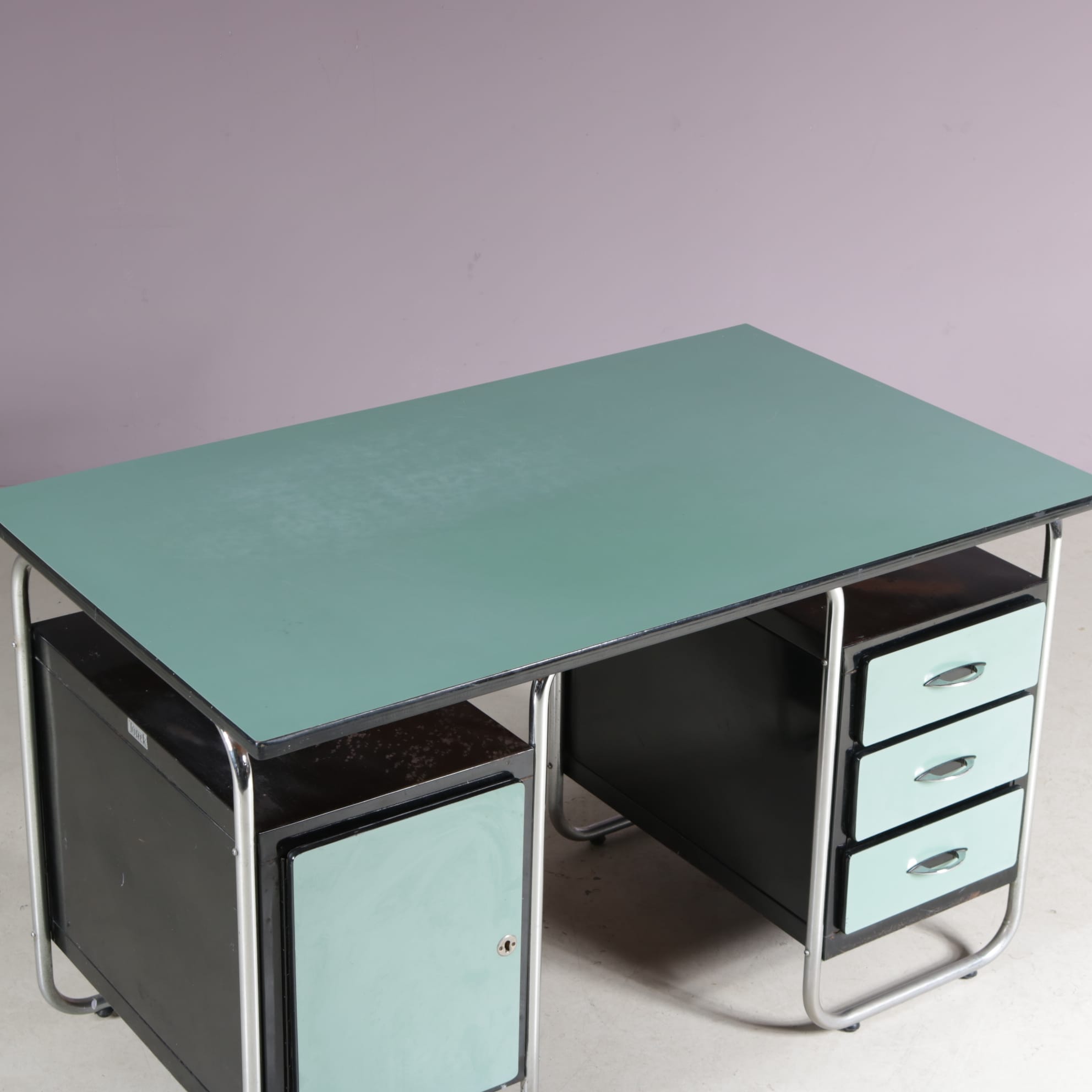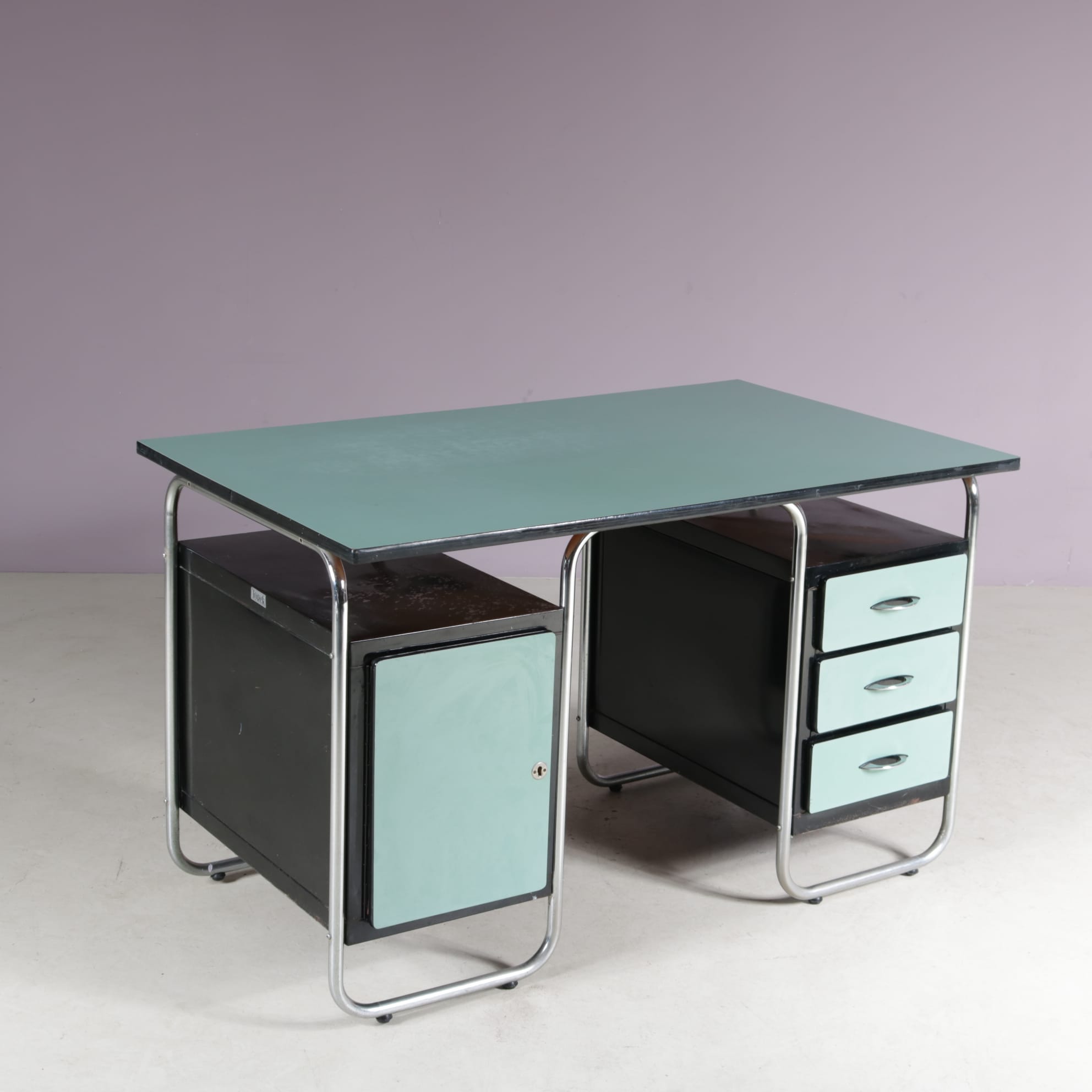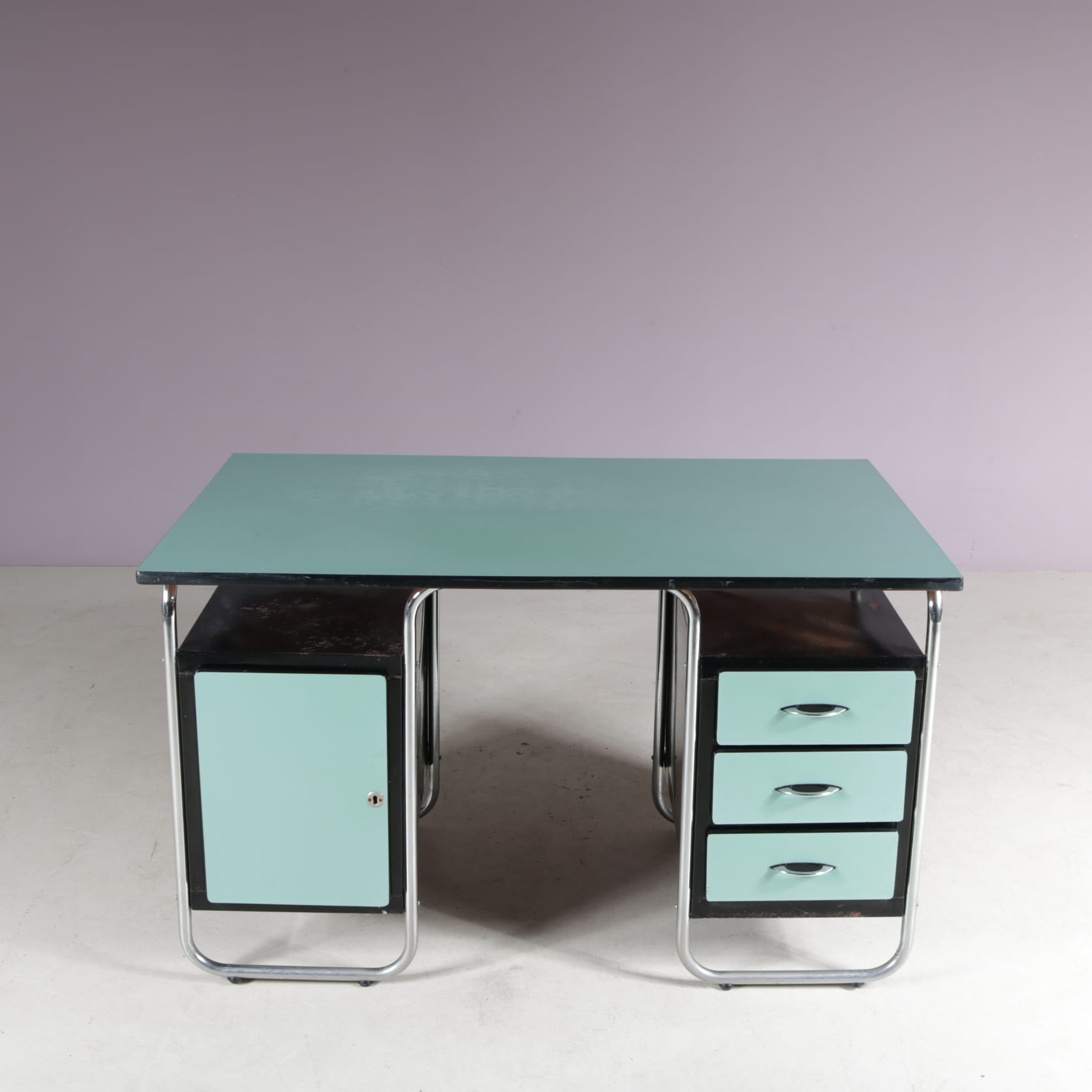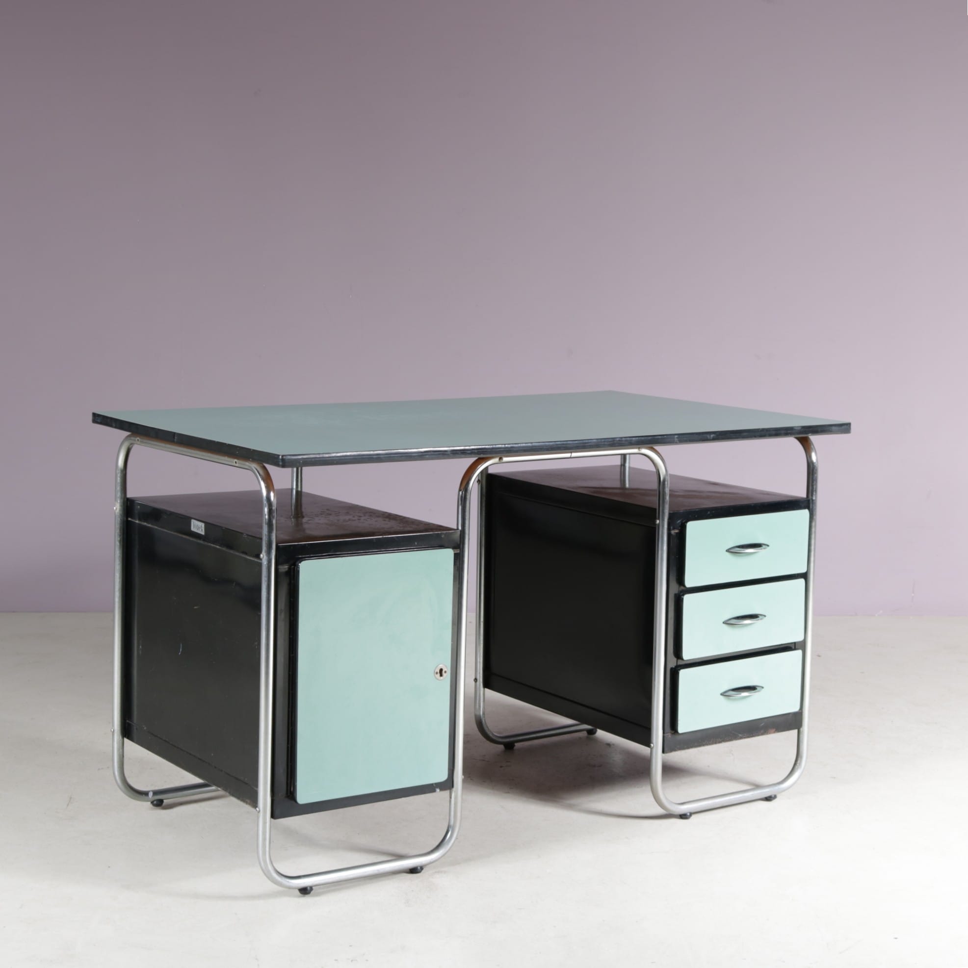 This stylish desk has a tubular, chrome plated metal frame supporting the green laminated wooden top and black drawer units with matching green laminated doors.The curved design of the frame combined with the straight features of the other elements combine really nicely, giving this piece that iconic Bauhaus style to it. It will add a very nice pop of colour to any decor!