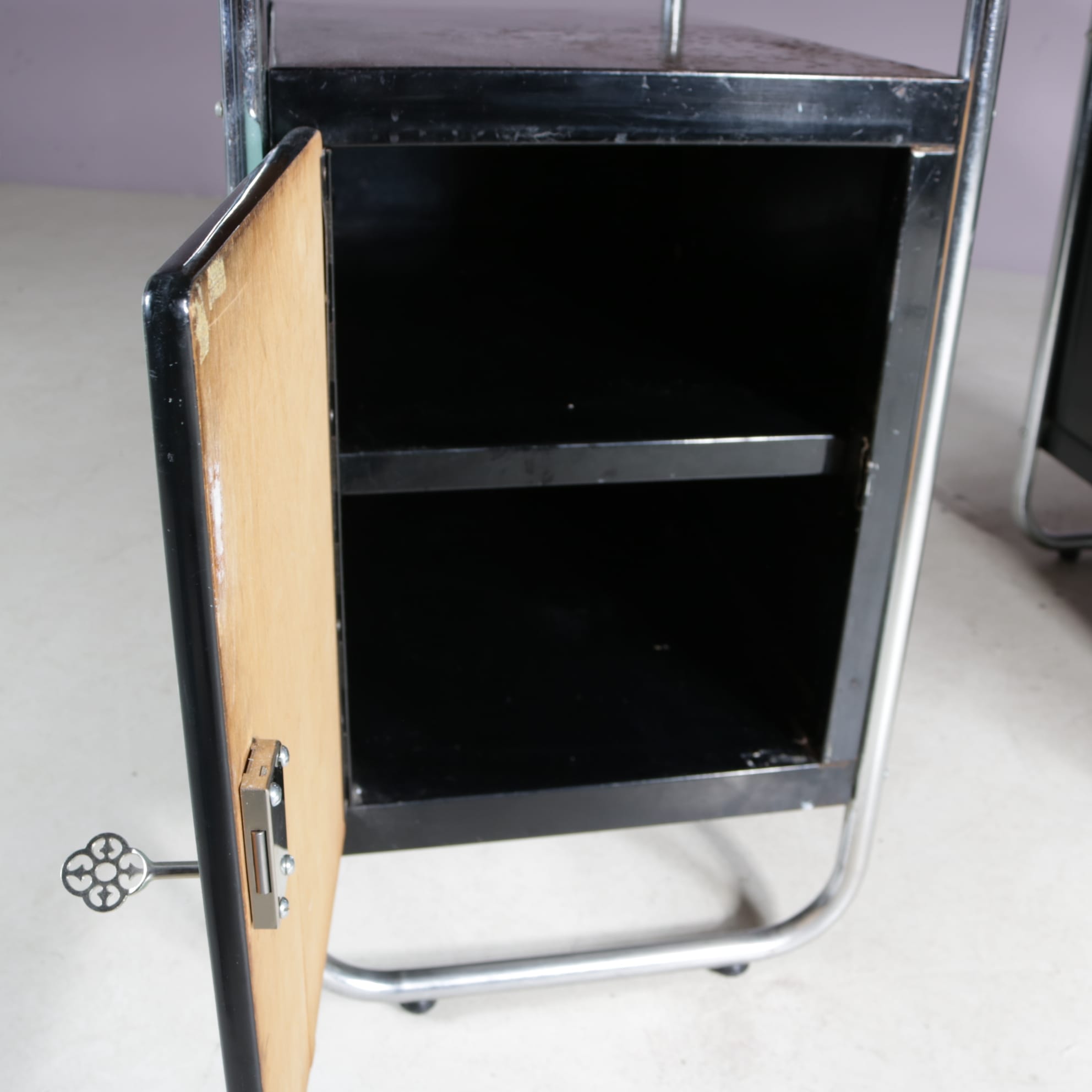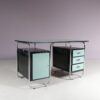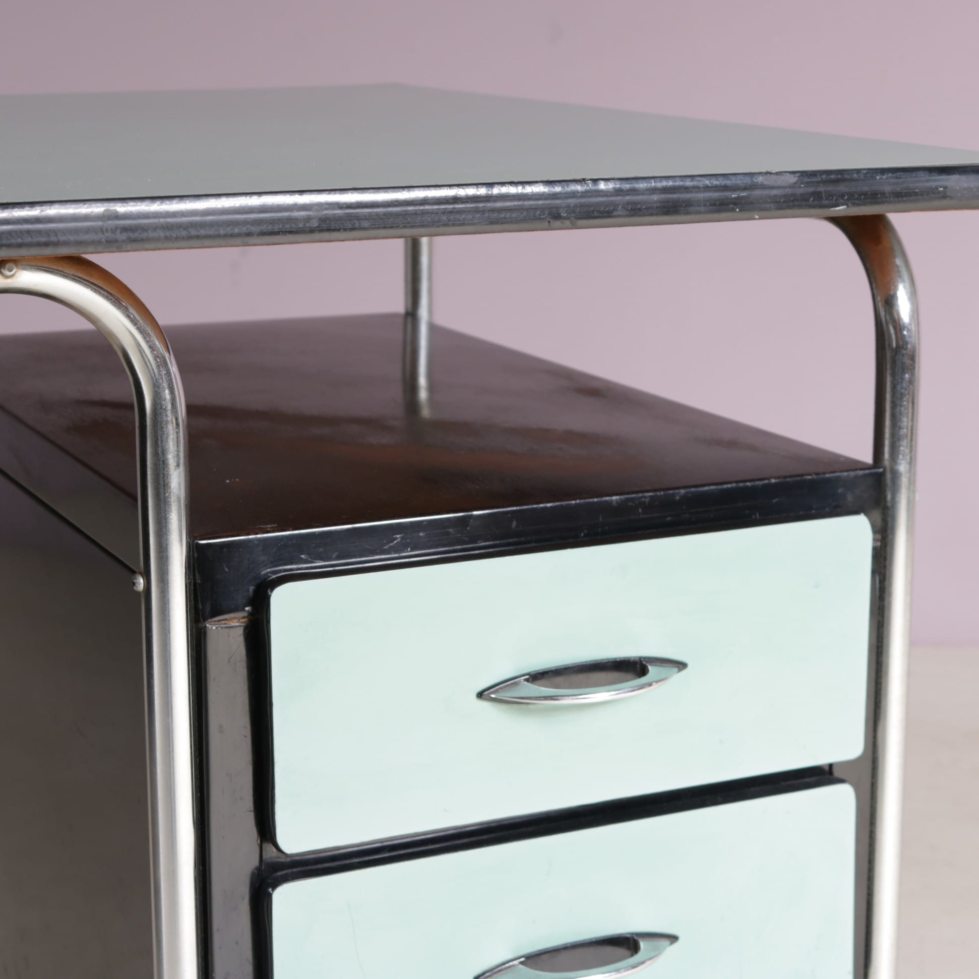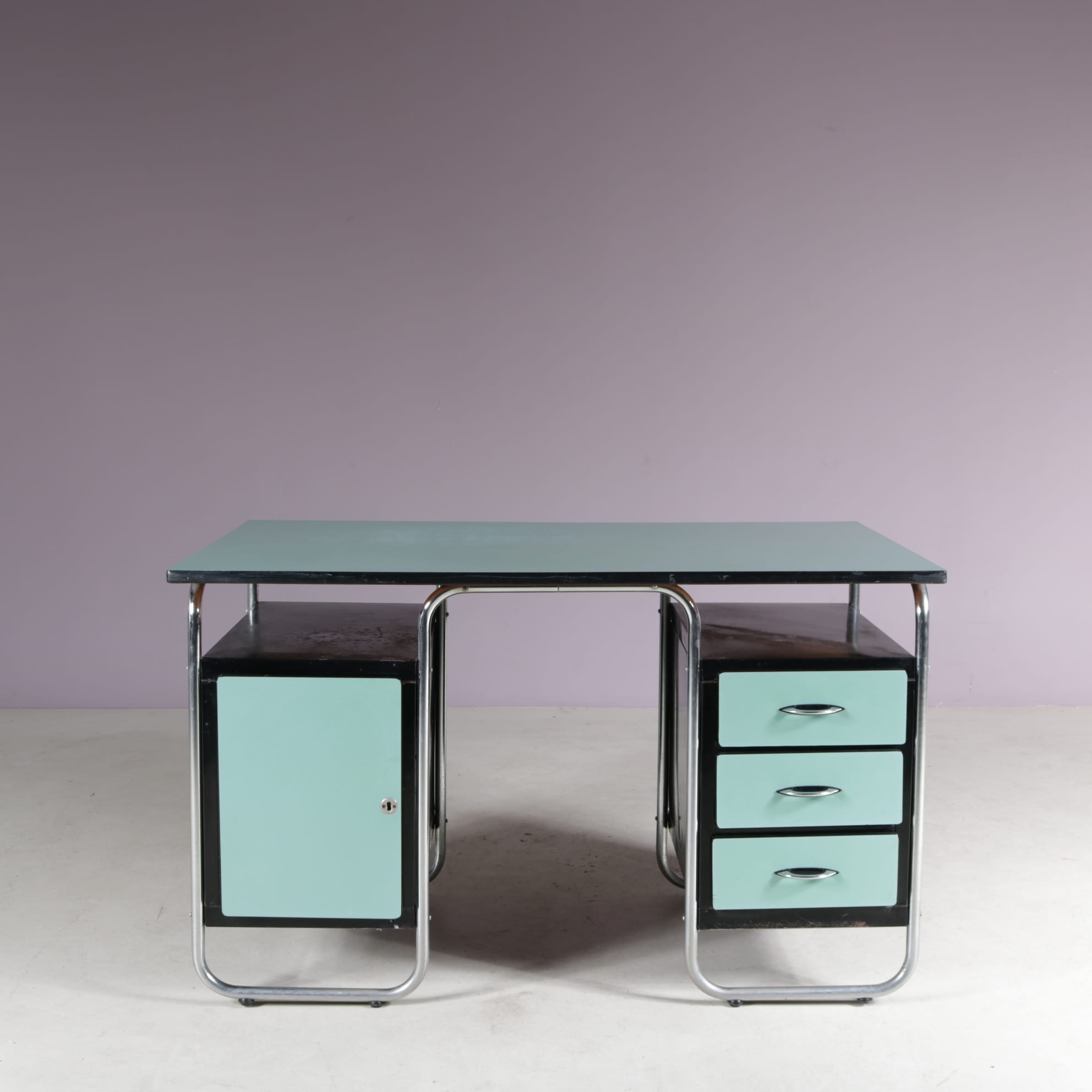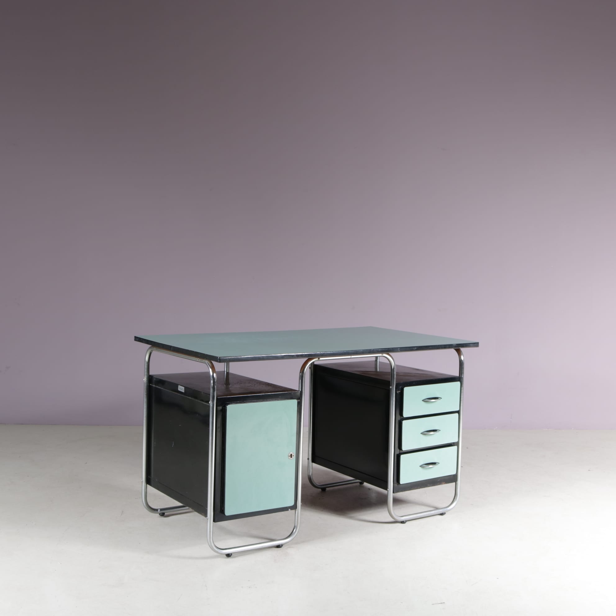 This stylish desk has a tubular, chrome plated metal frame supporting the green laminated wooden top and black drawer units with matching green laminated doors.The curved design of the frame combined with the straight features of the other elements combine really nicely, giving this piece that iconic Bauhaus style to it. It will add a very nice pop of colour to any decor!