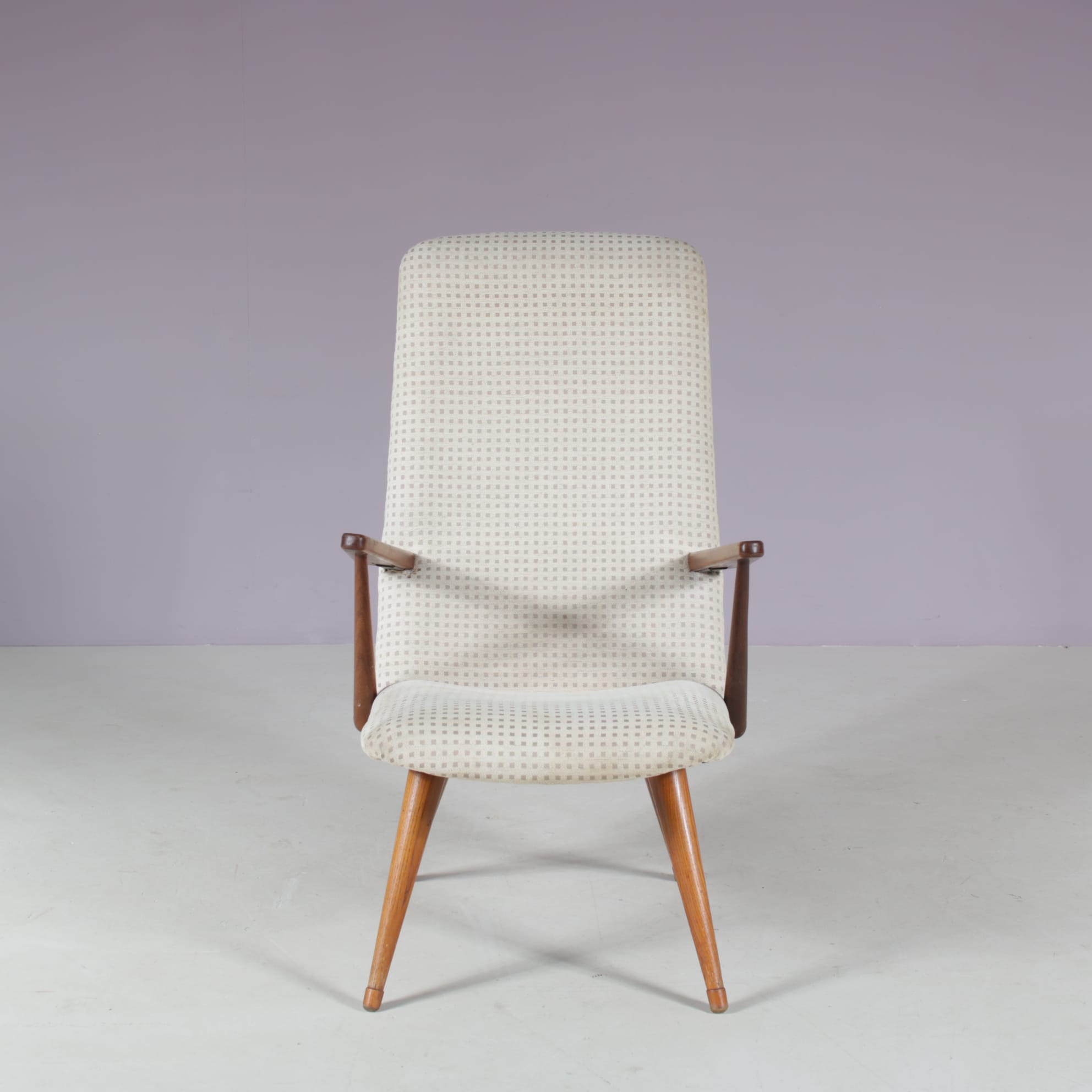 This elegant chair features a teak wood frame with nicely finished legs and armrests. The seat and back are upholstered in a lovely fabric with a two toned cream coloured pattern. All together this gives the piece a nice appeal, highly recognizable for mid-century Scandinavian design. The slightly tilted backrest add nicely to it’s seating comfort!