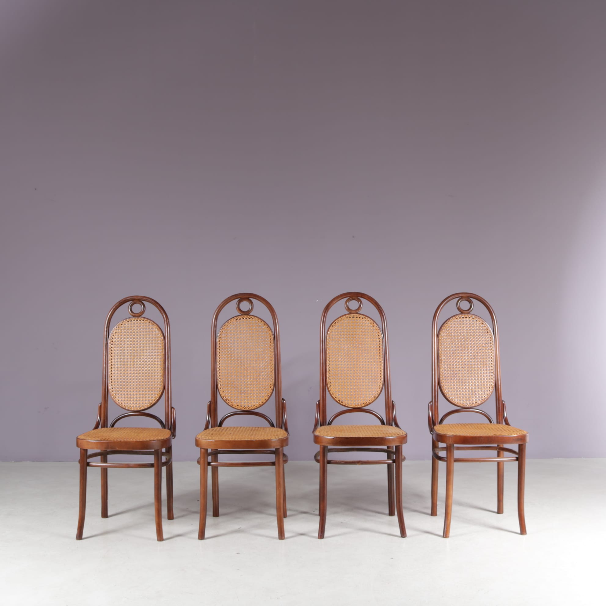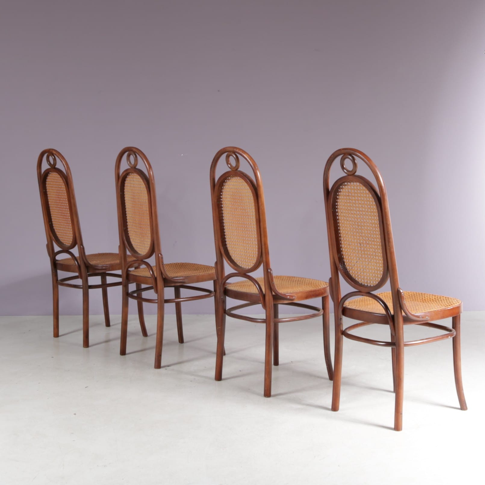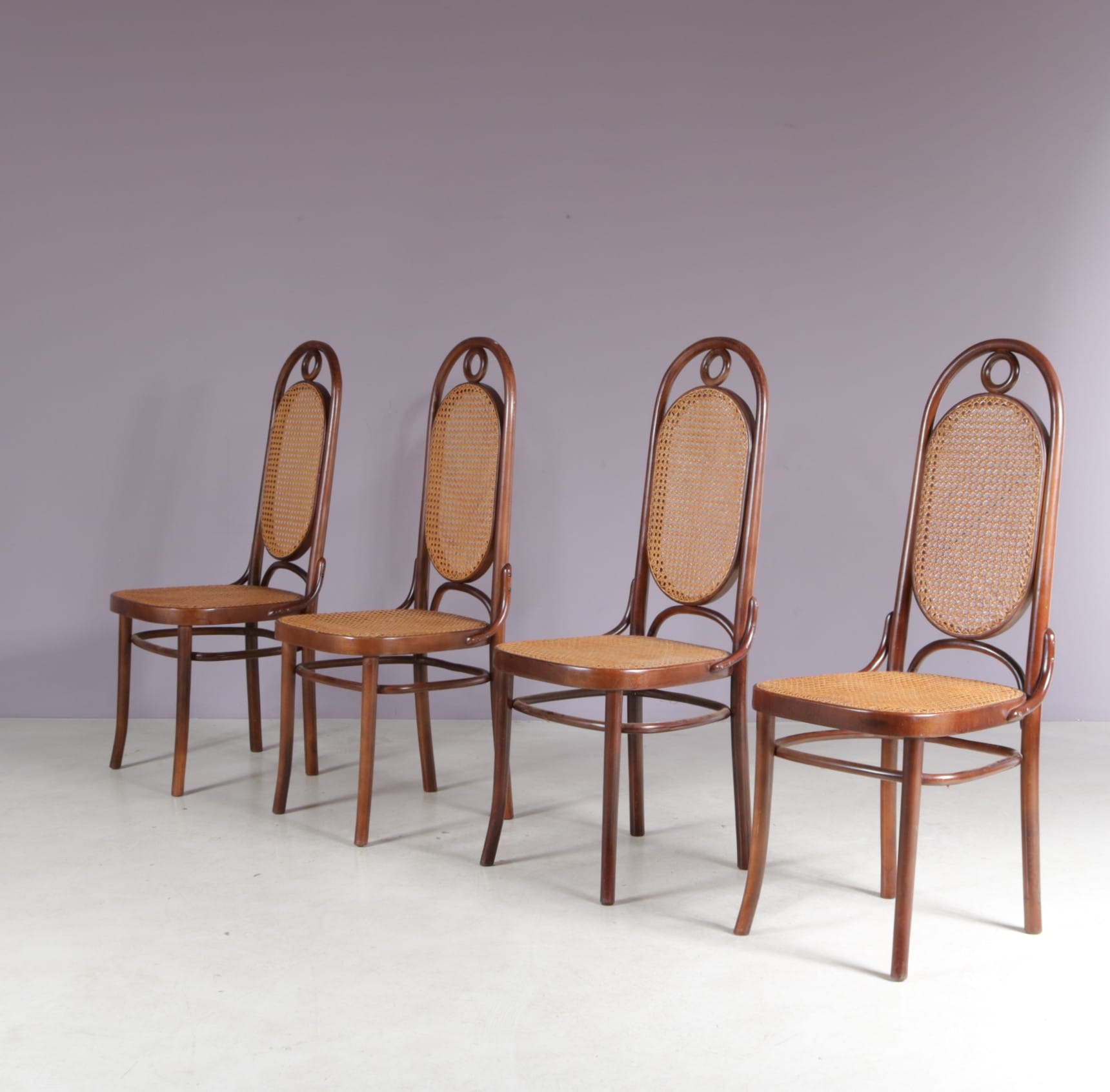 These elegant and highly recognizable chairs are made of high quality beech wood in a nice, warm brown colour with webbing seat and back in a lighter shade, adding a nice contrast. They have a beautiful style with a luxurious appeal, finished with curved shapes and details. The tall backrests provide additional seating comfort as well.