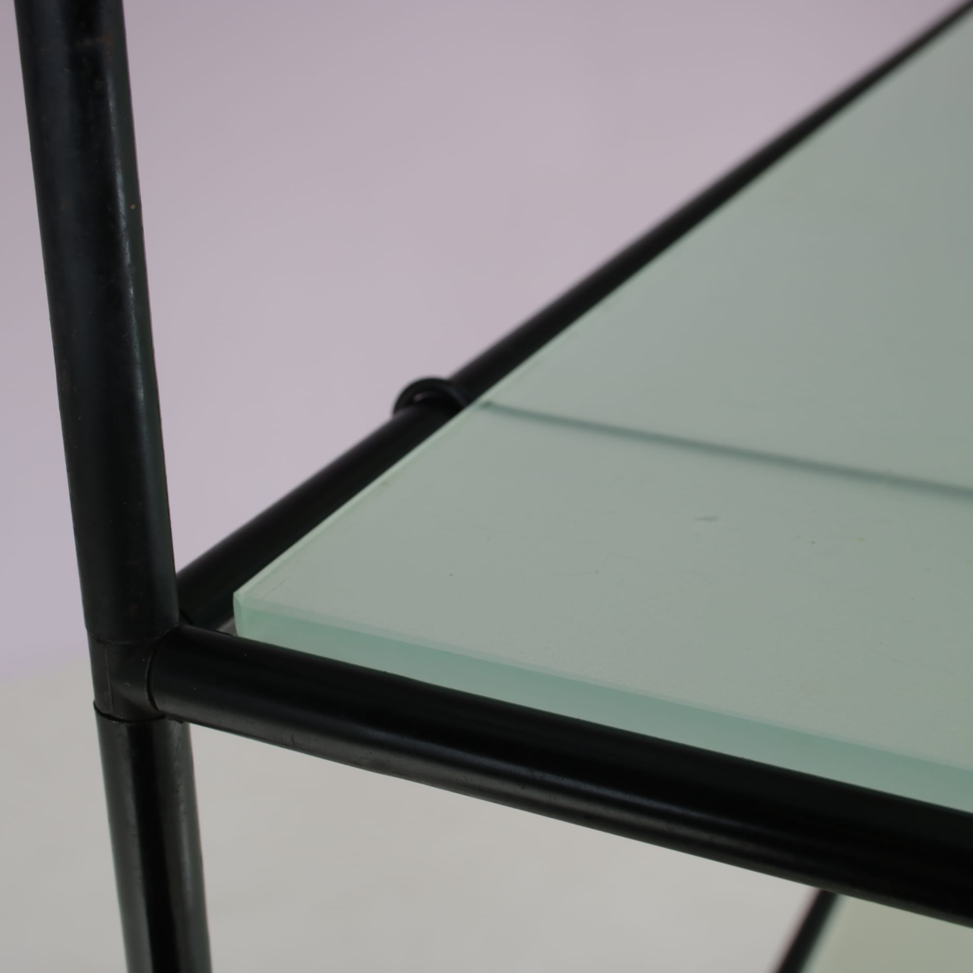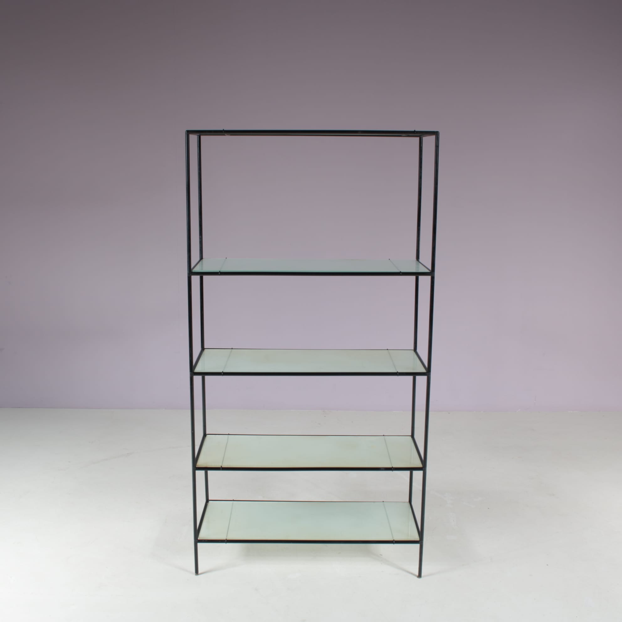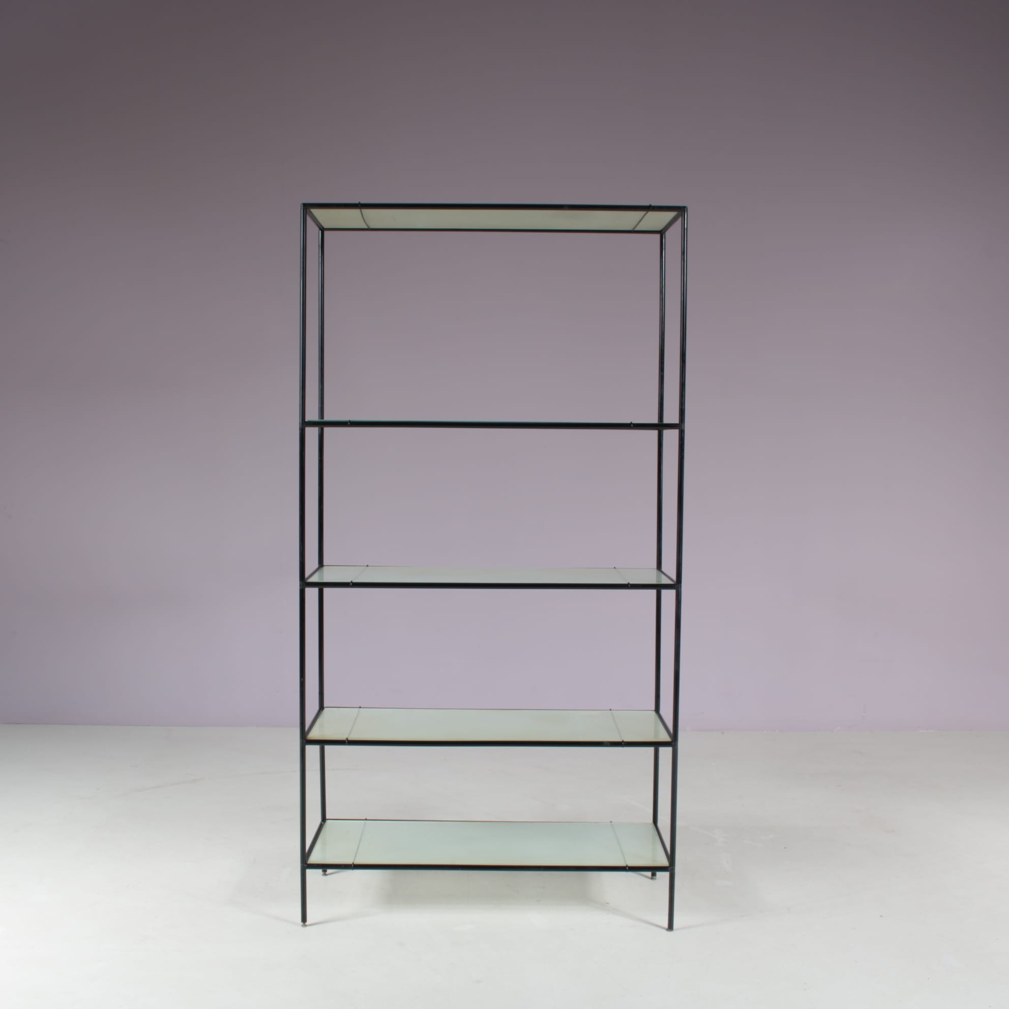 This elegant cabinet is made of high quality black lacquered metal. It has a thin, tubular metal frame with the connections in each corner allowing the piece to be built up and disassembled easily, but also be put in different settings and positions or even be extended with additional pieces. The blurred glass tops add nicely to it’s modern style and creates a sense of harmony to the overall design. It’s an iconic find of mid-century design that will allow for many different uses in different kinds of decors as a striking decorative piece, a storage unit or a display cabinet.
