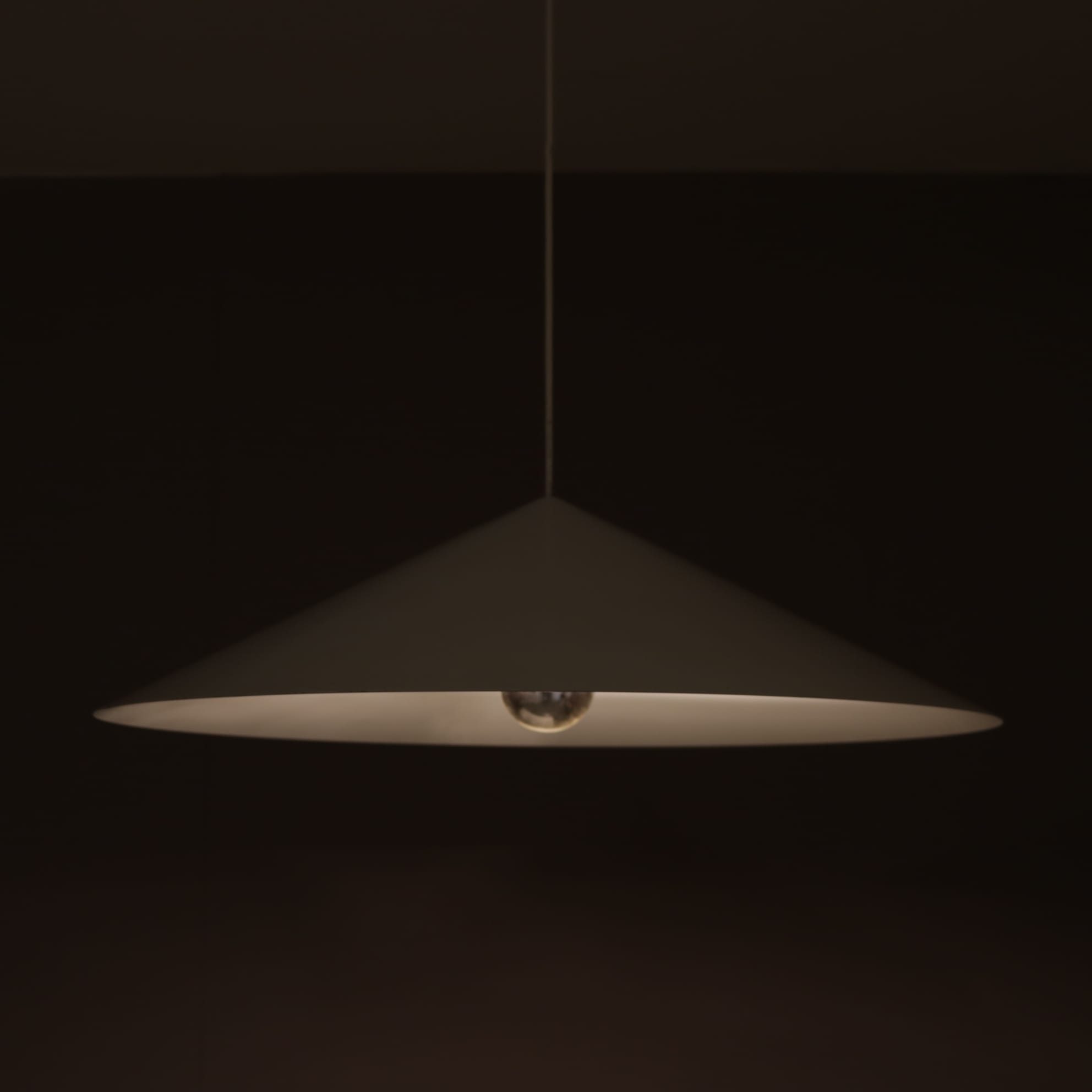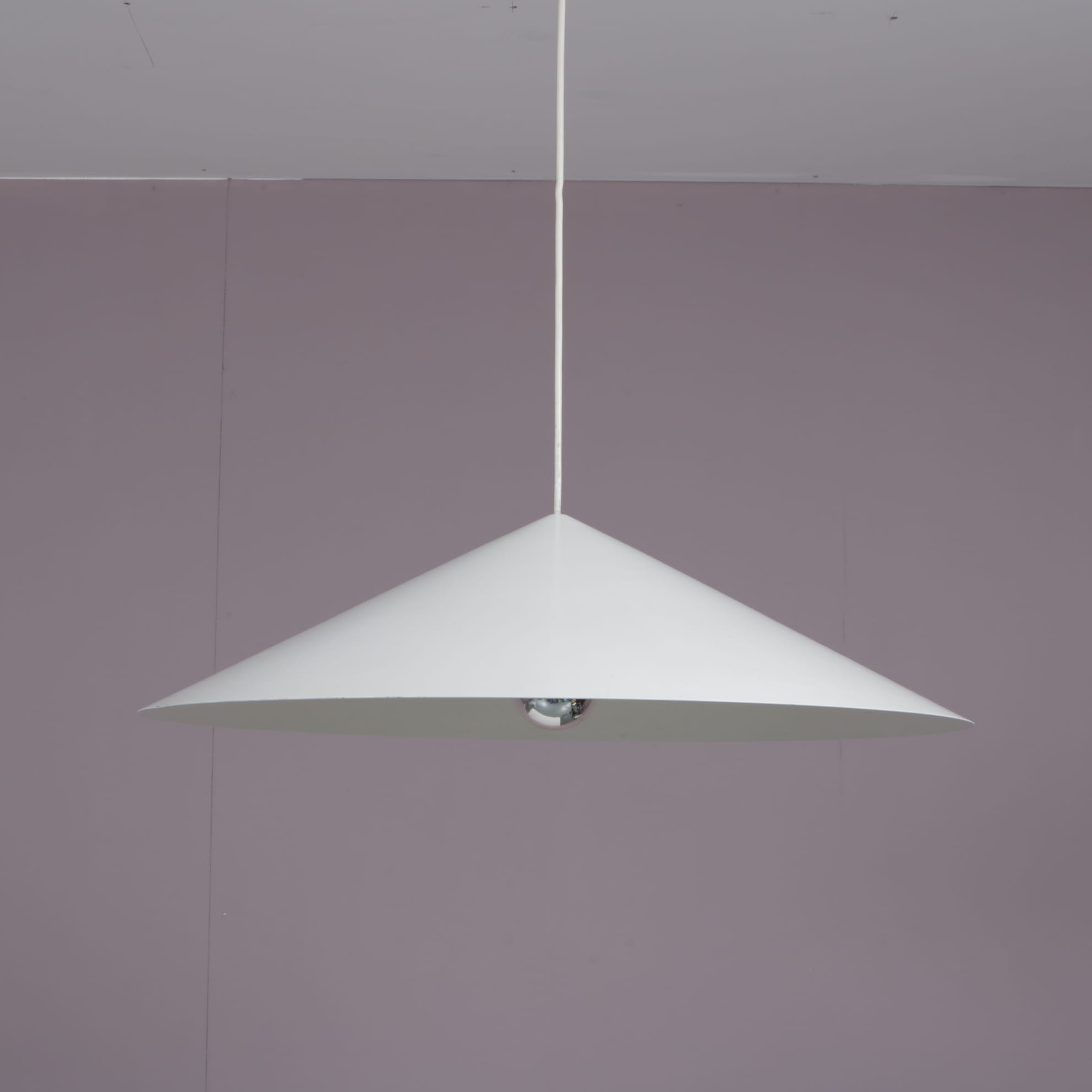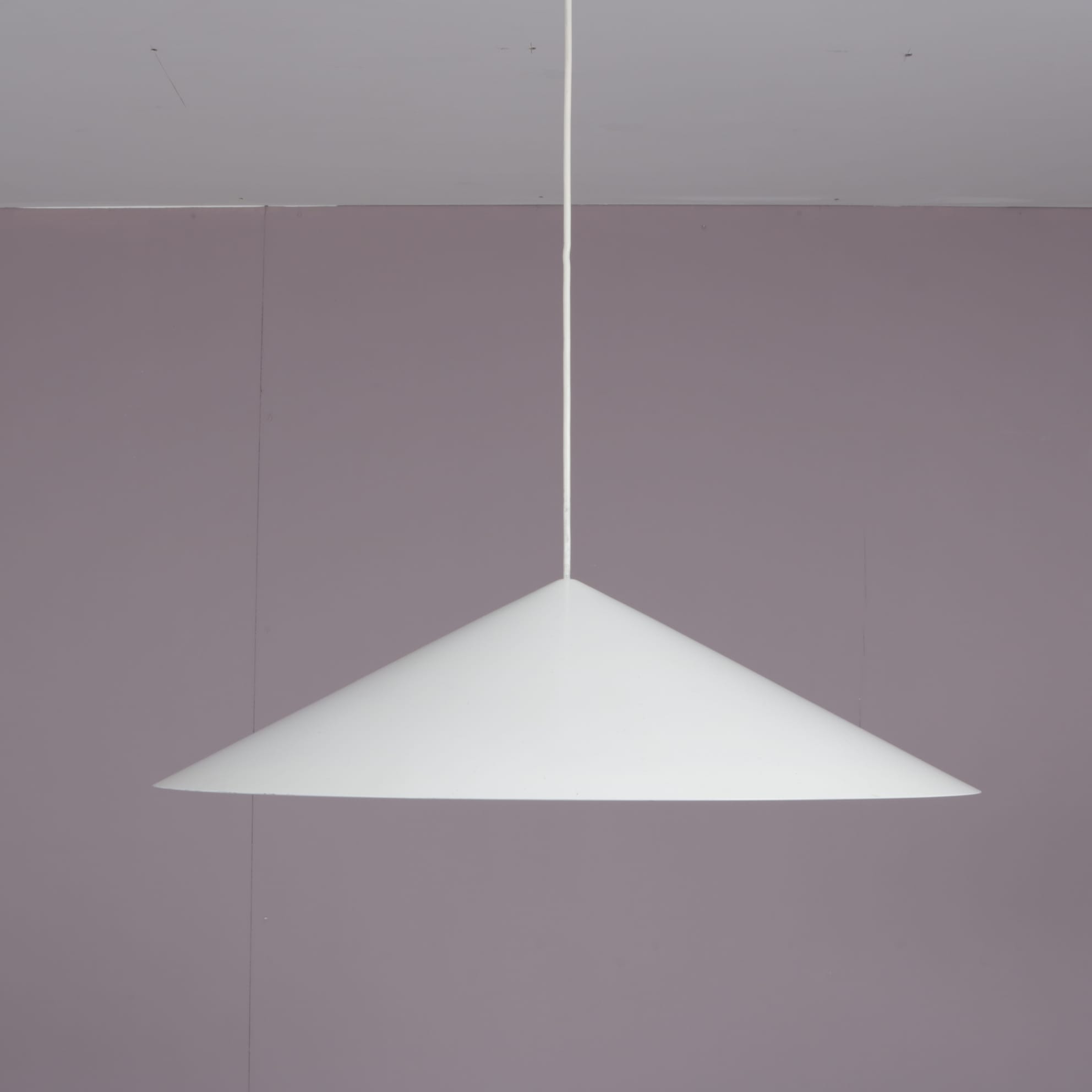 Made of high quality white lacquered metal in a nice rounded triangle shape. The piece has a minimalist, modern style and emits a bright downwards light. It’s clean design allow it to be placed in many different interiors, adding a lovely sense of Scandinavian modern design to the interior.