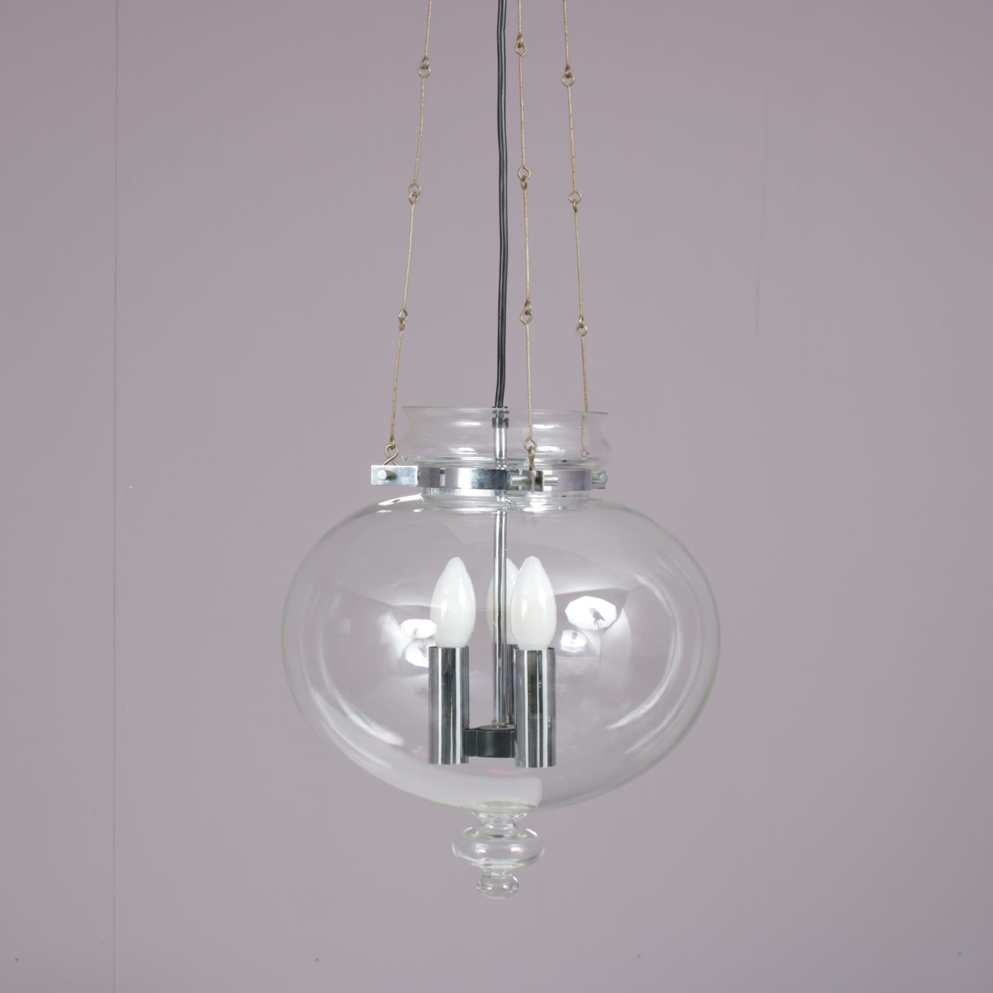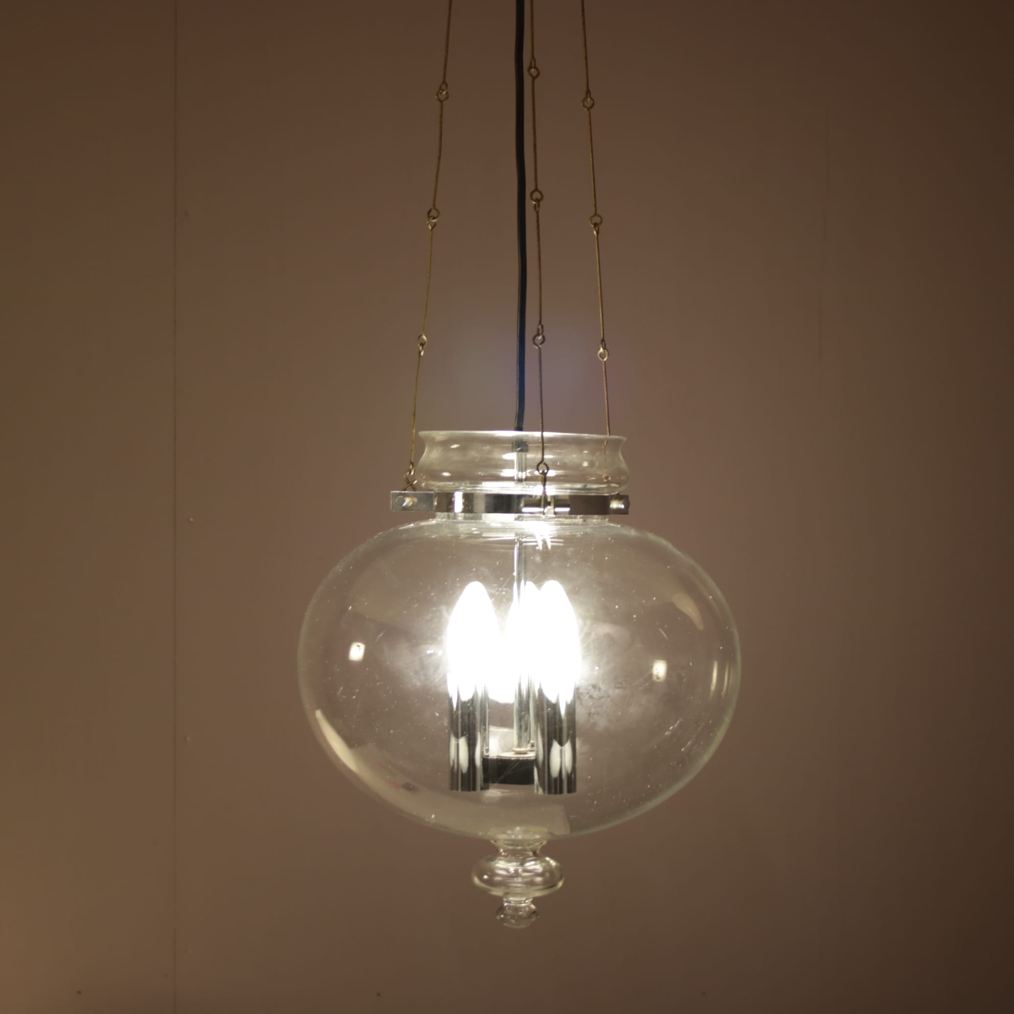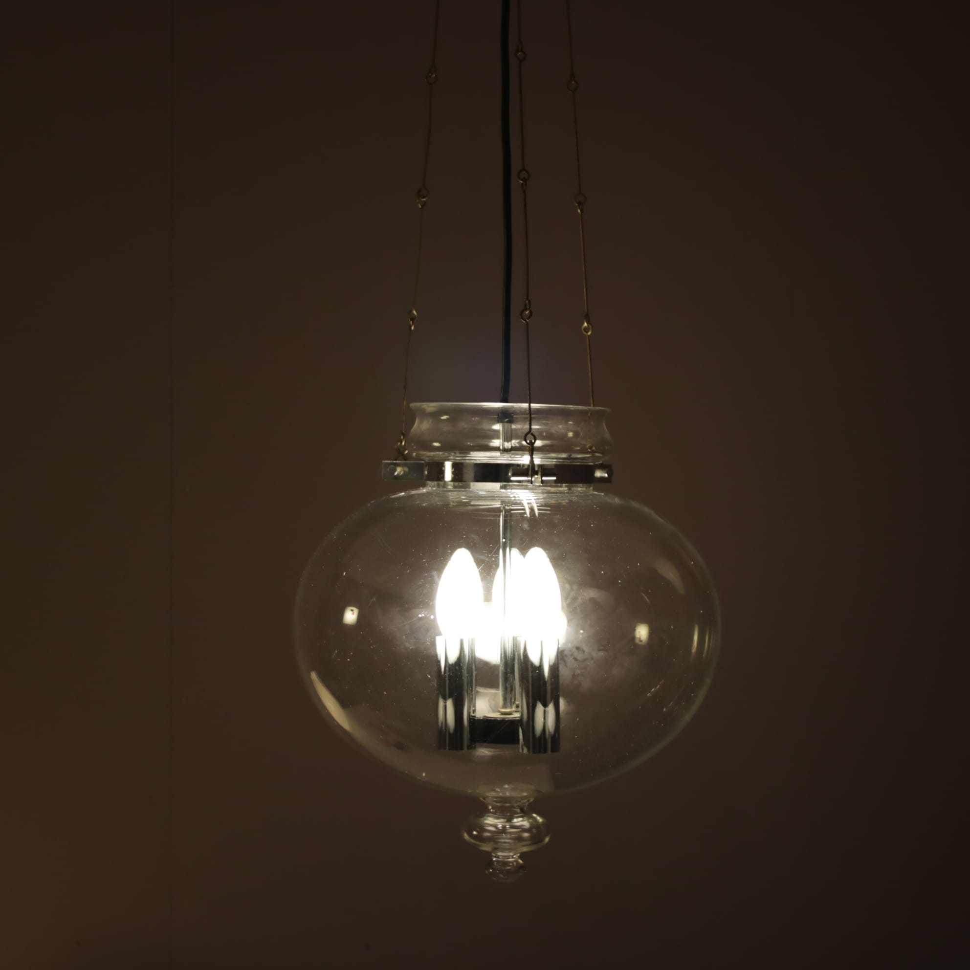 Made of beautiful clear glass with curved finish in an elegant, modern design. The chrome details and thin chains add really nicely to the overall style of the piece, giving it a lovely sense of luxury. The simple yet modern design gives the piece a beautiful appeal! It emits a warm, bright light that makes it perfect for a dining setting or as a complimentary piece in the decor.