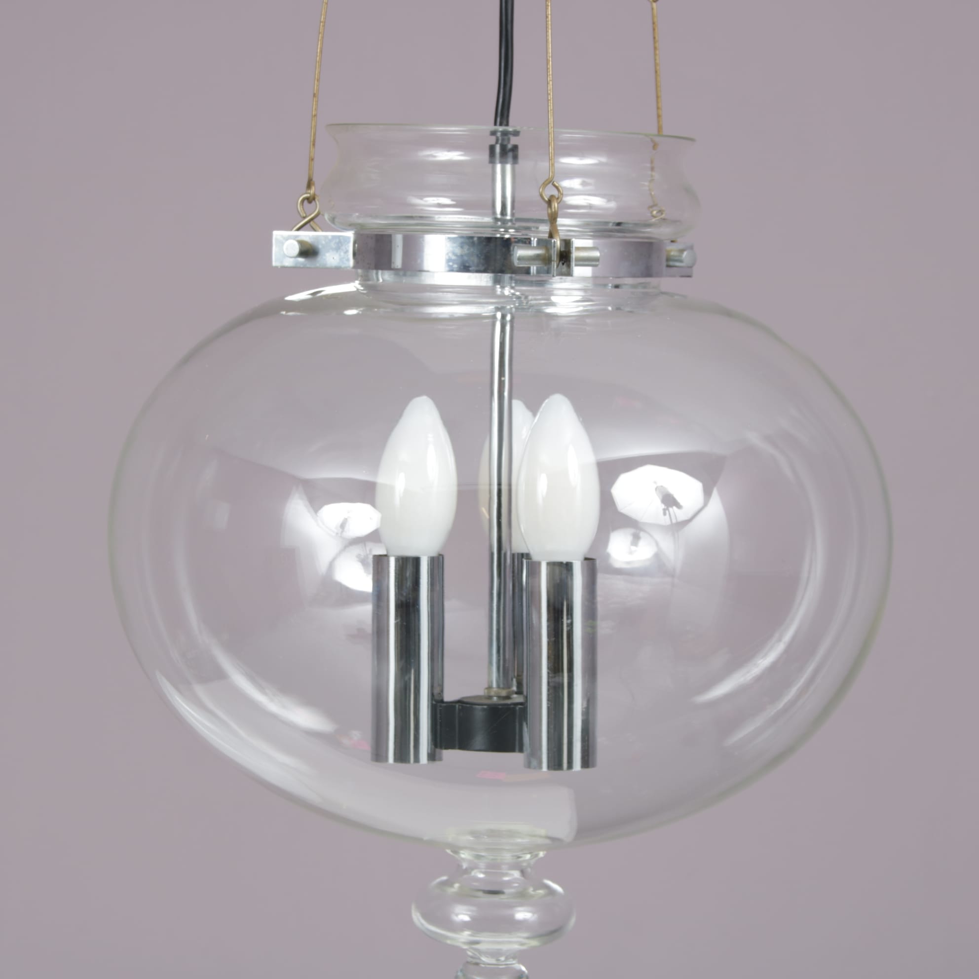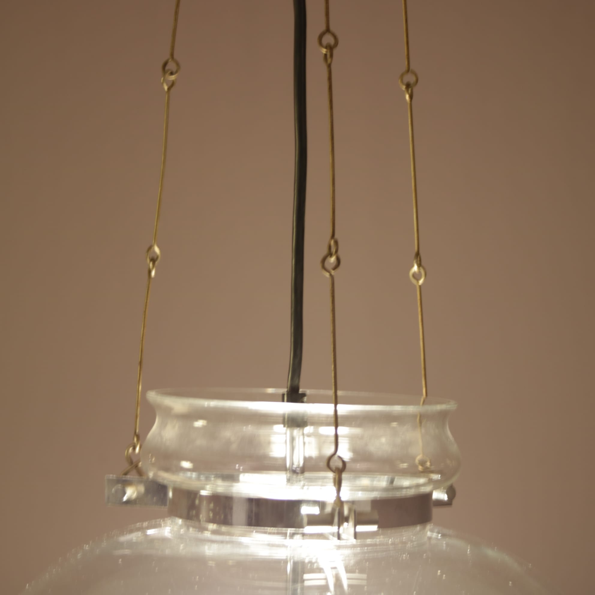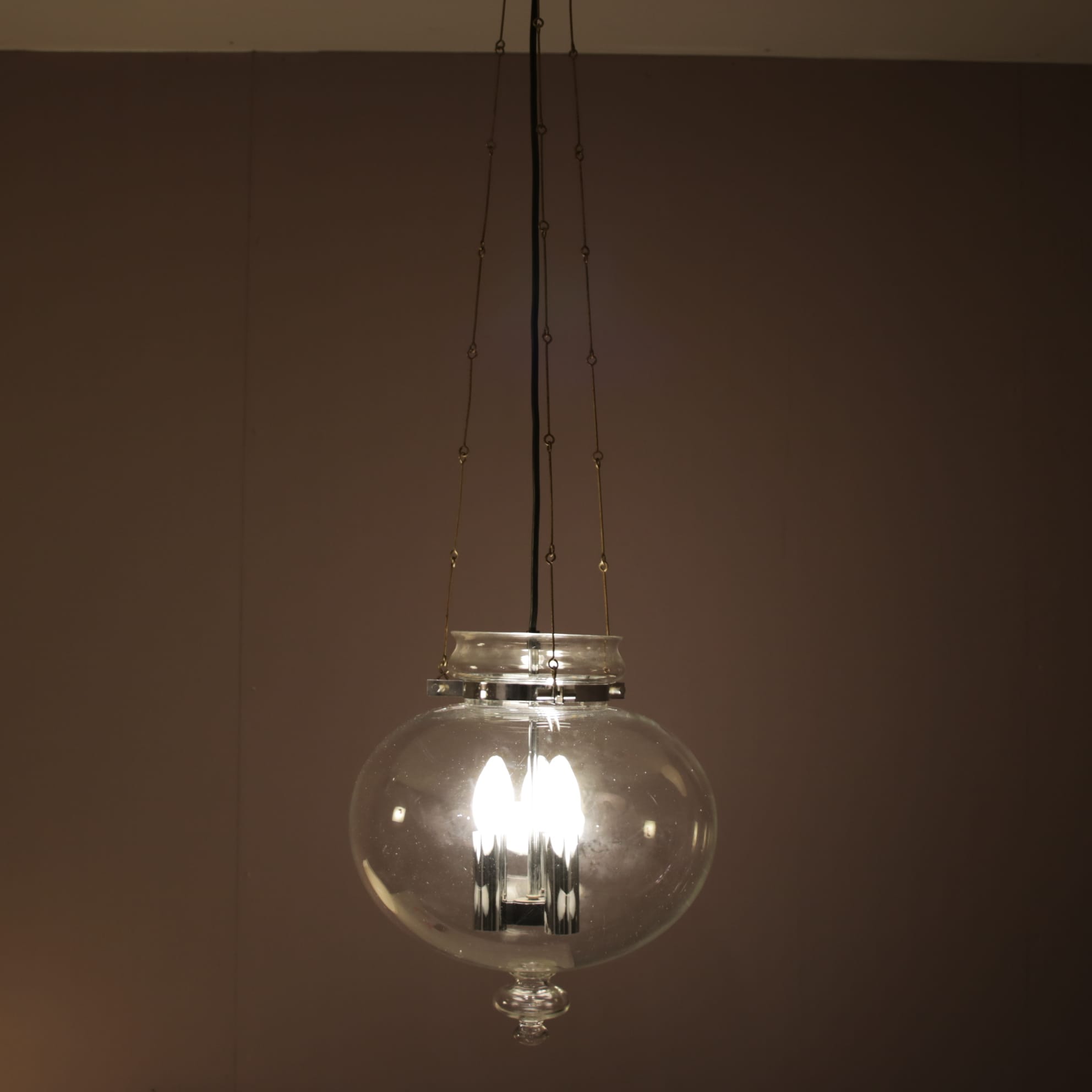 Made of beautiful clear glass with curved finish in an elegant, modern design. The chrome details and thin chains add really nicely to the overall style of the piece, giving it a lovely sense of luxury. The simple yet modern design gives the piece a beautiful appeal! It emits a warm, bright light that makes it perfect for a dining setting or as a complimentary piece in the decor.