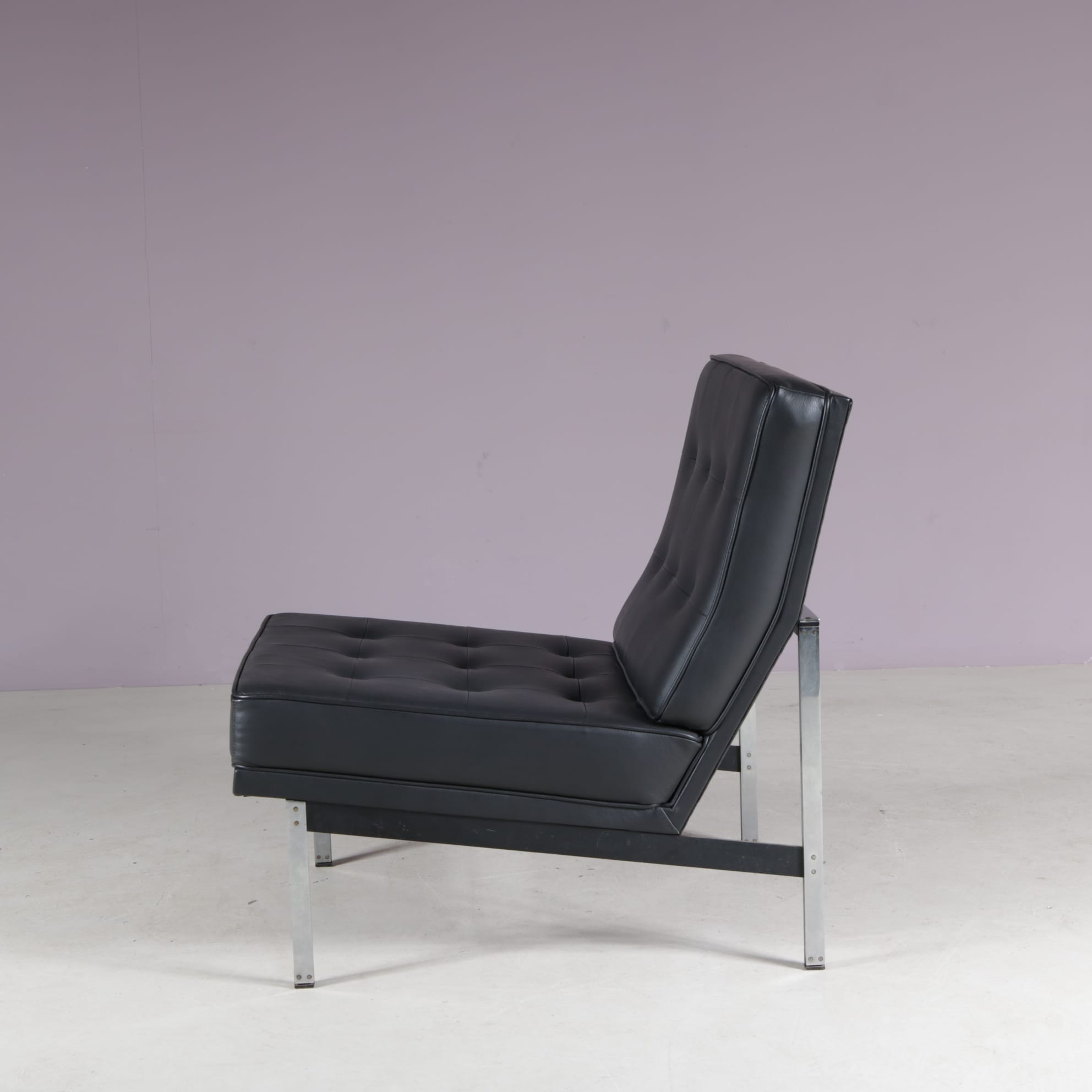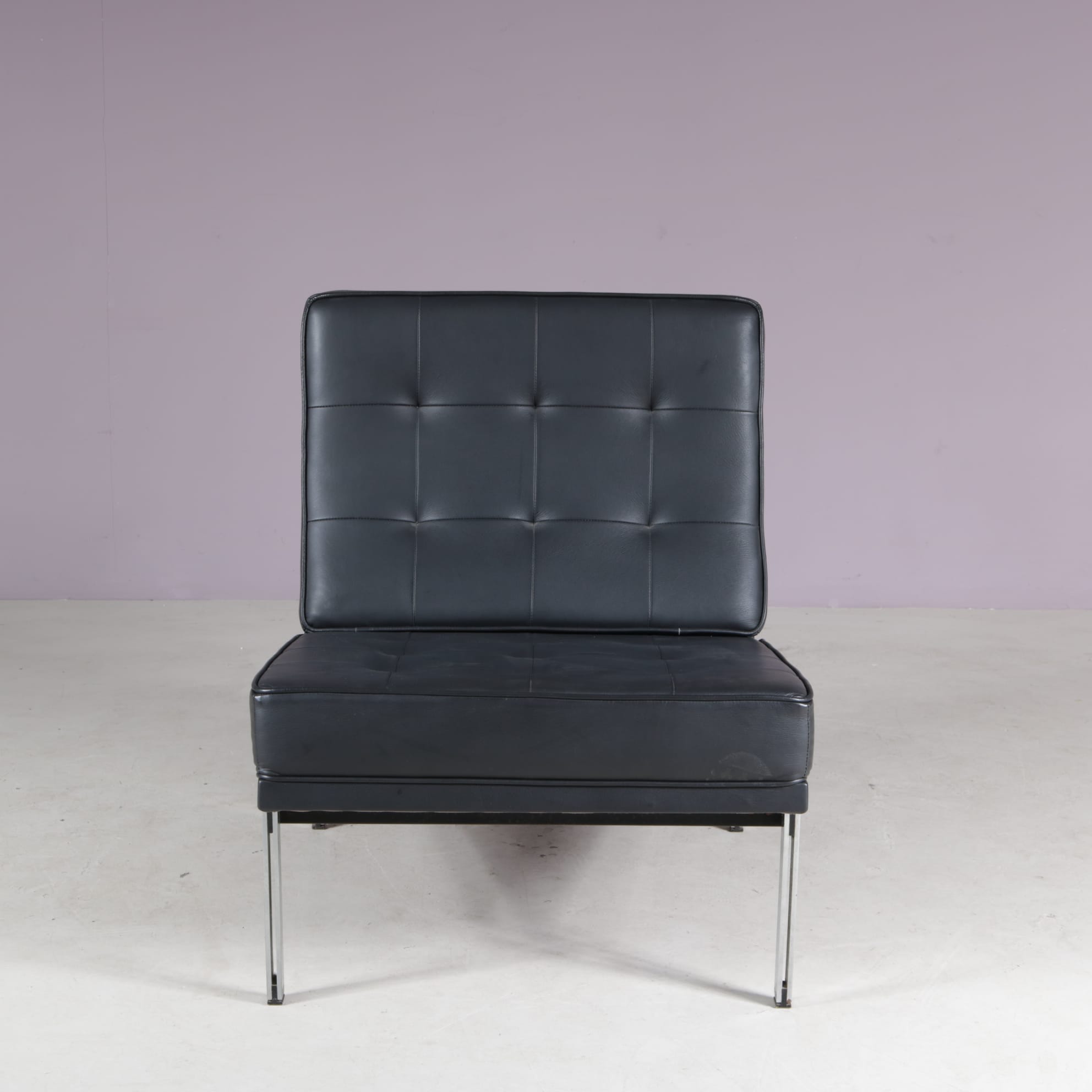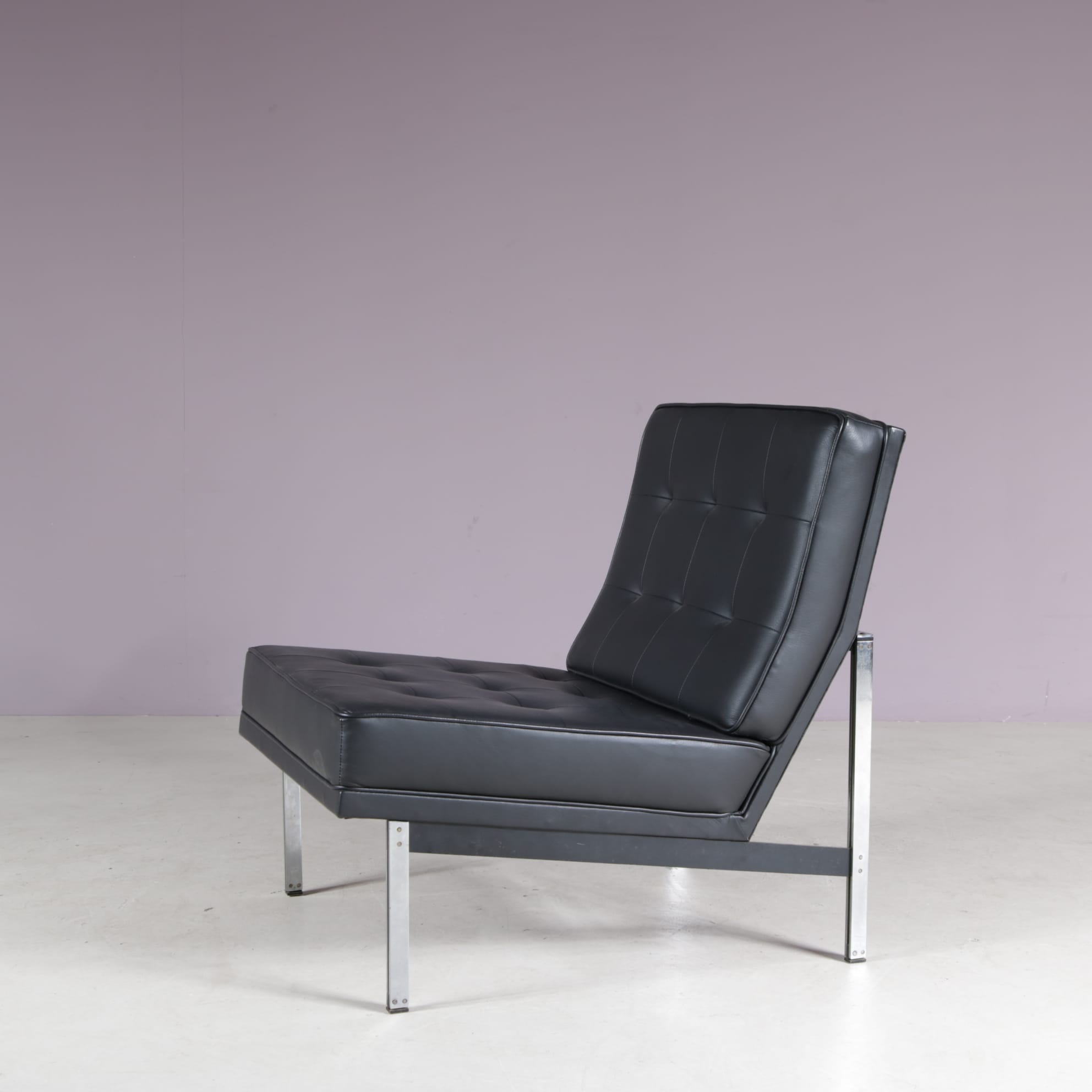 A highly recognizable chair that combines a clean modernist style with fantastic seating comfort. Made of high quality chrome plated metal with beautiful black leather upholstery with tufted finish. The upholstery contrasts nicely to the brightness of the frame and adds to it’s eye-catching , modern appeal. A sophisticated chair that will be a wonderful addition to any interior!