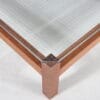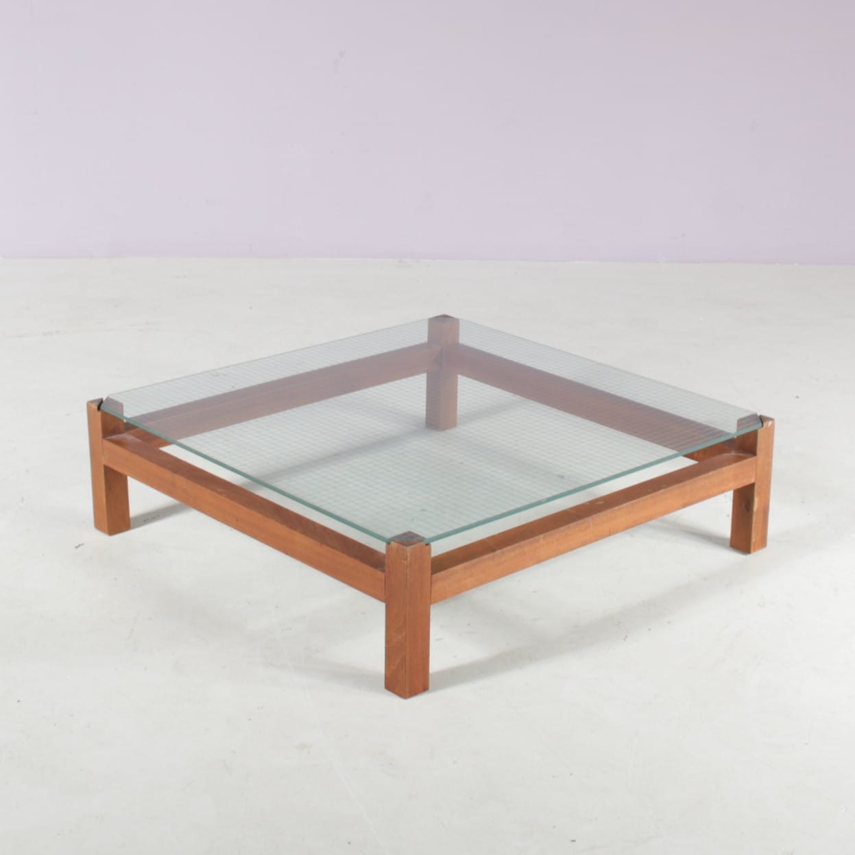 Made of nice, warm brown wood in a square structure with a clear safety glass top. The table combines warmth with modernism and a nice eye for detail. The clear glass allows the nice structure of the table to be visible from every angle. The top rests on top of the legs where cut-outs in the wood allow the table to perfectly rest into place and stay sturdy and stable. All together this is a lovely mid-century table that will fit seamlessly in many different kinds of decors!