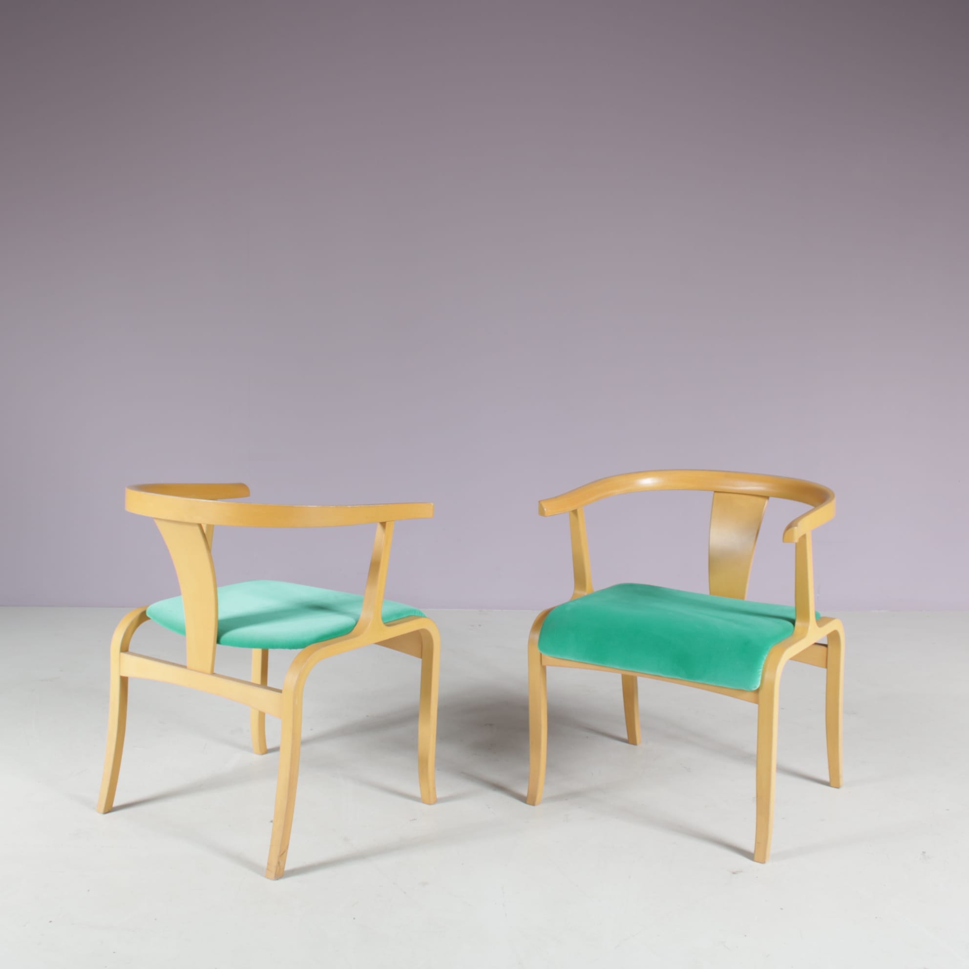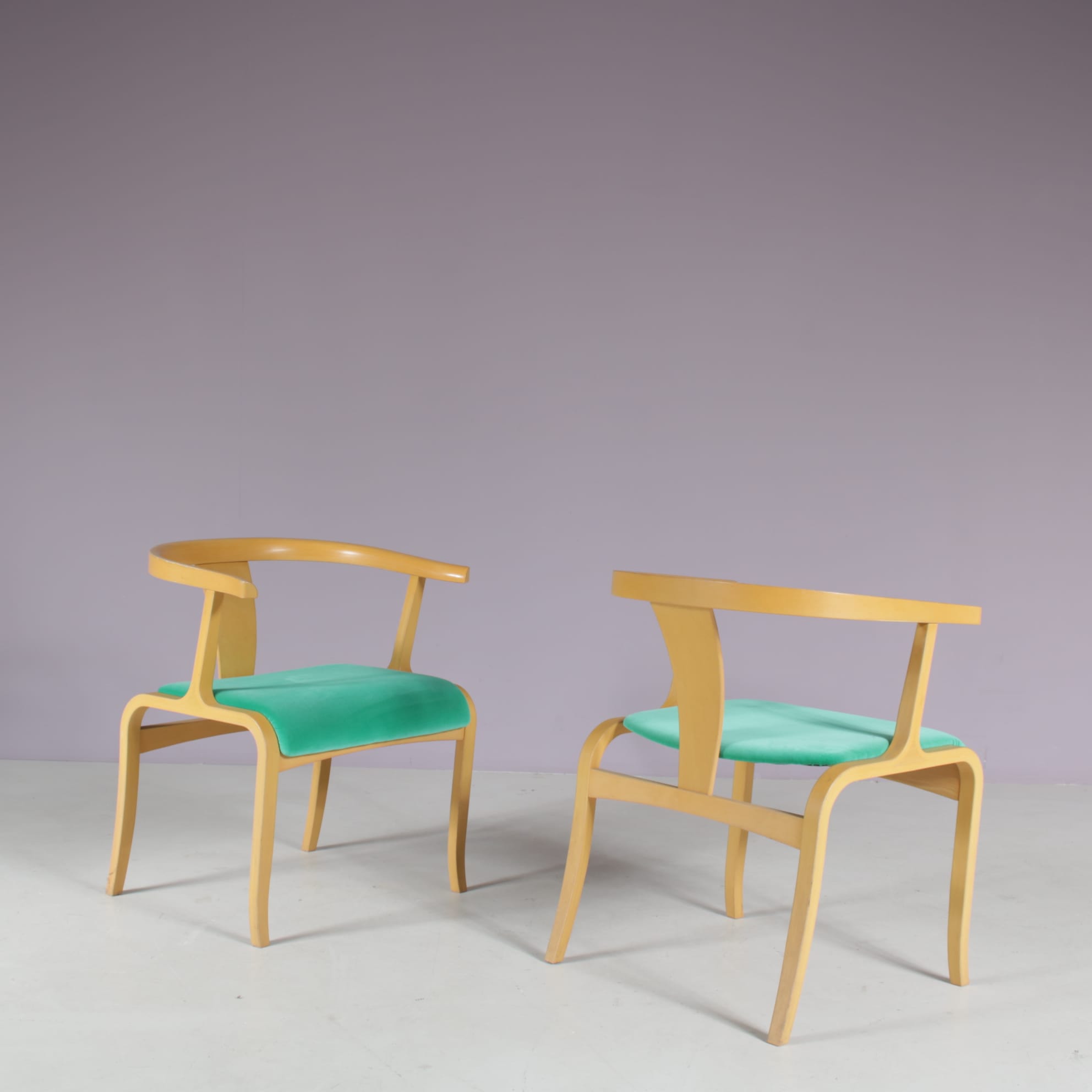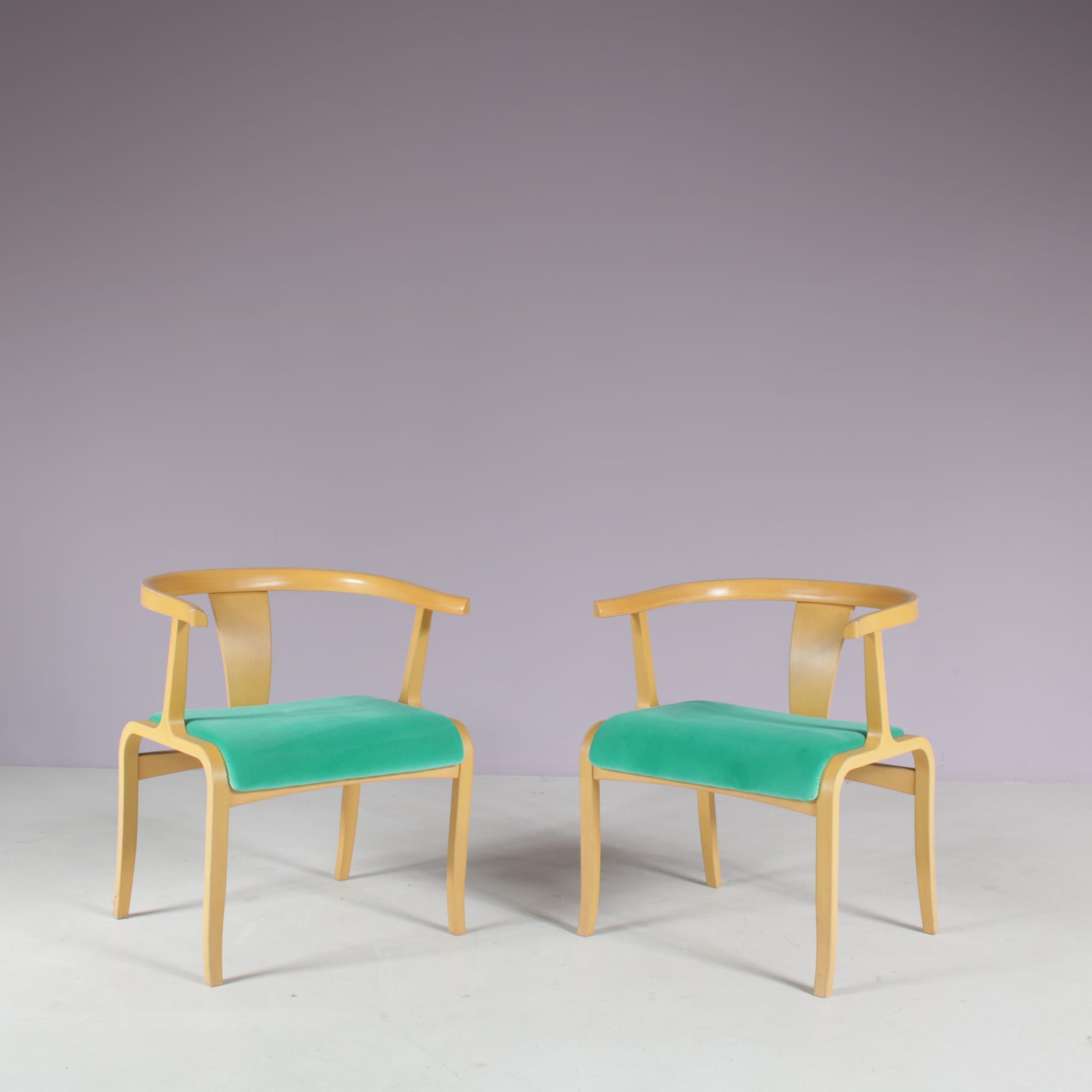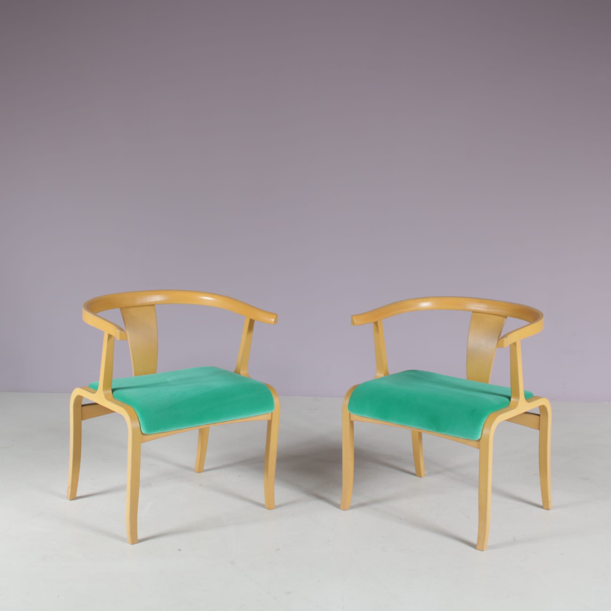 These eye-catching chairs are made from beautiful quality birch plywood with a new green velvet upholstery, giving them an eye-catching appearance. The curved shapes around the entire design are an elegant touch and gives them a unique, modern appeal. A unique find and a beautiful example of Japanese design!