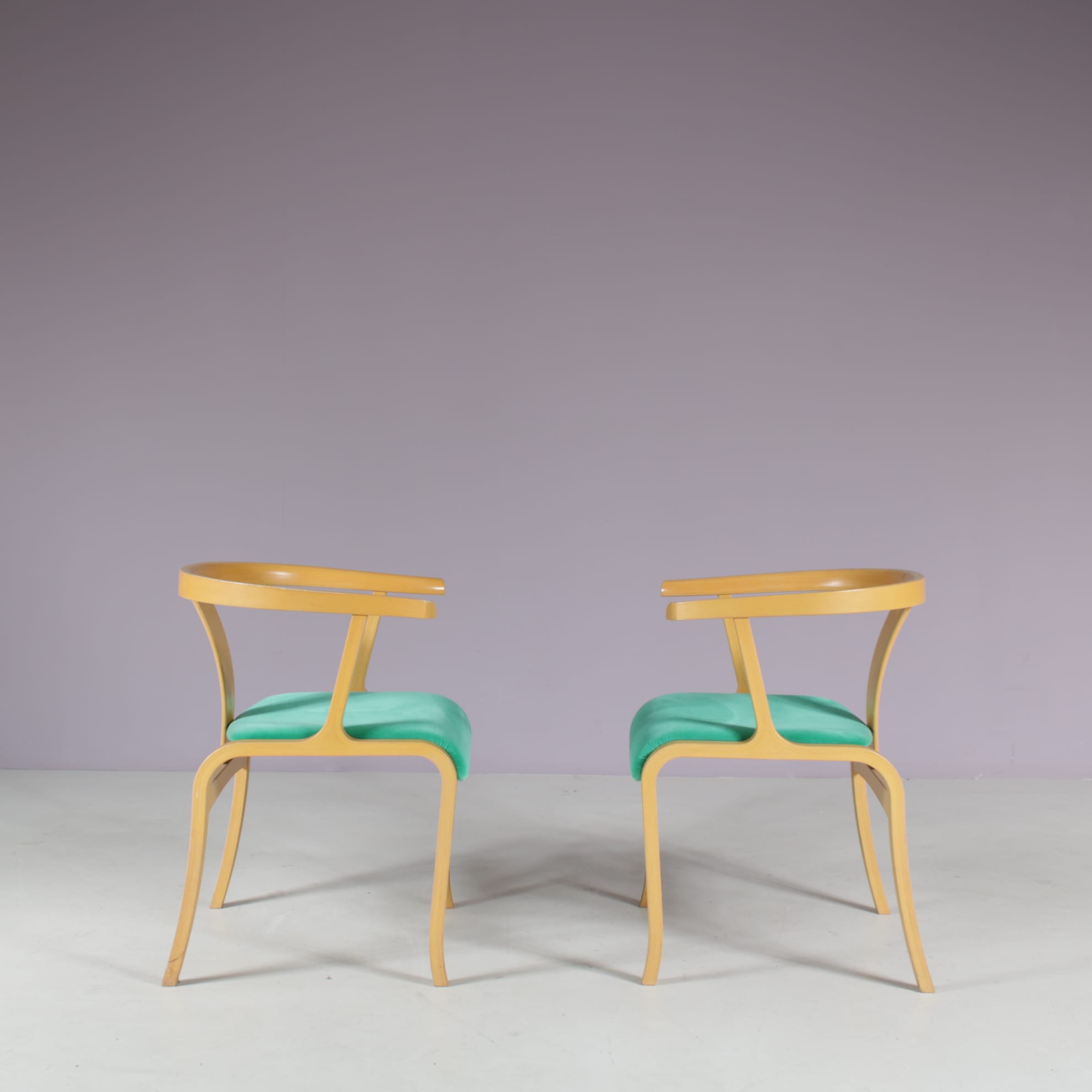 The chairs remain in very good, vintage condition with minor wear consistent with age and use, preserving a wonderful patina. One chair has some small marks on the fabric as shown in photos.