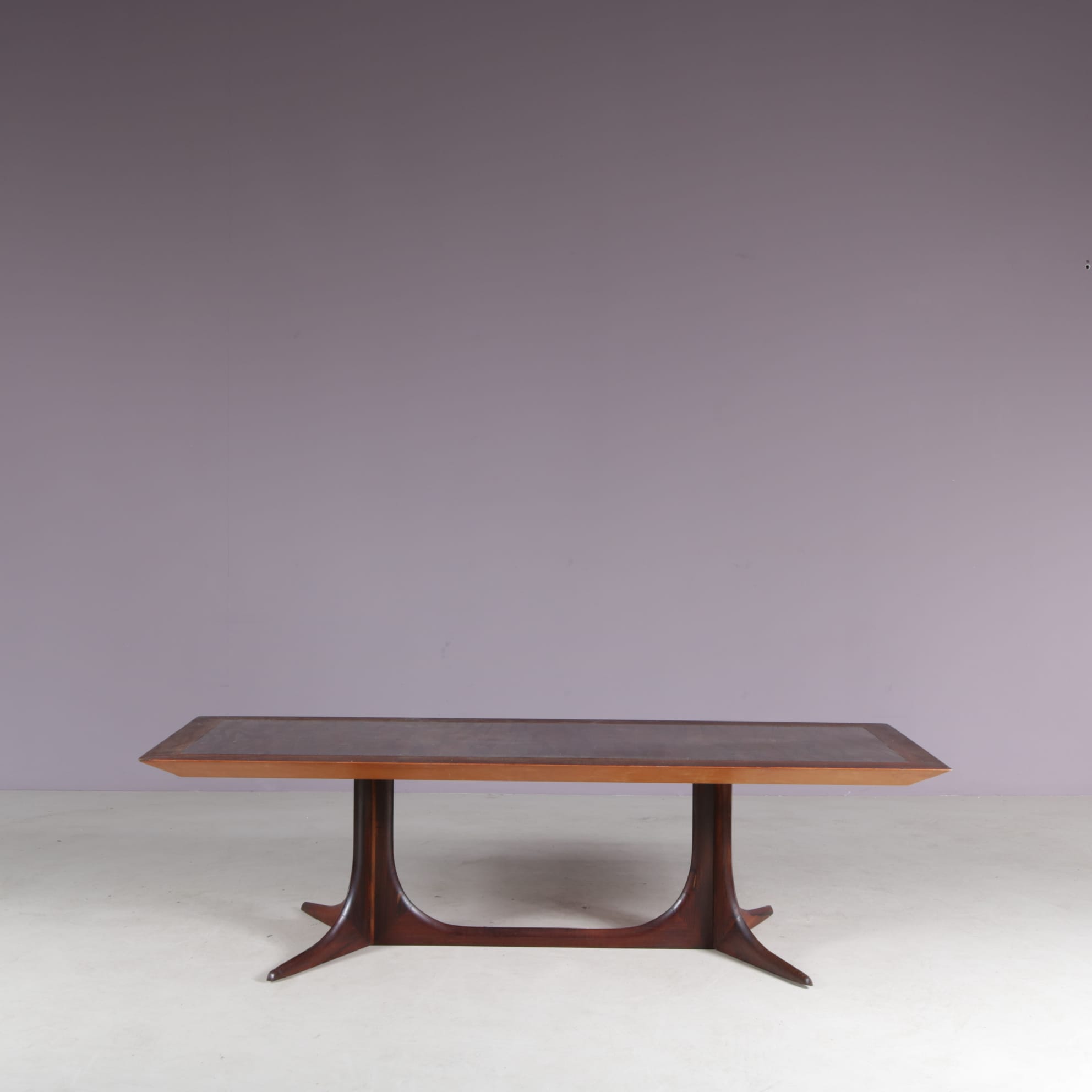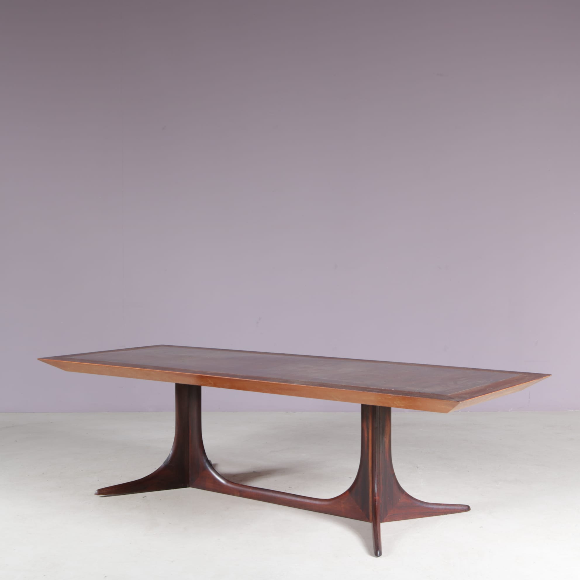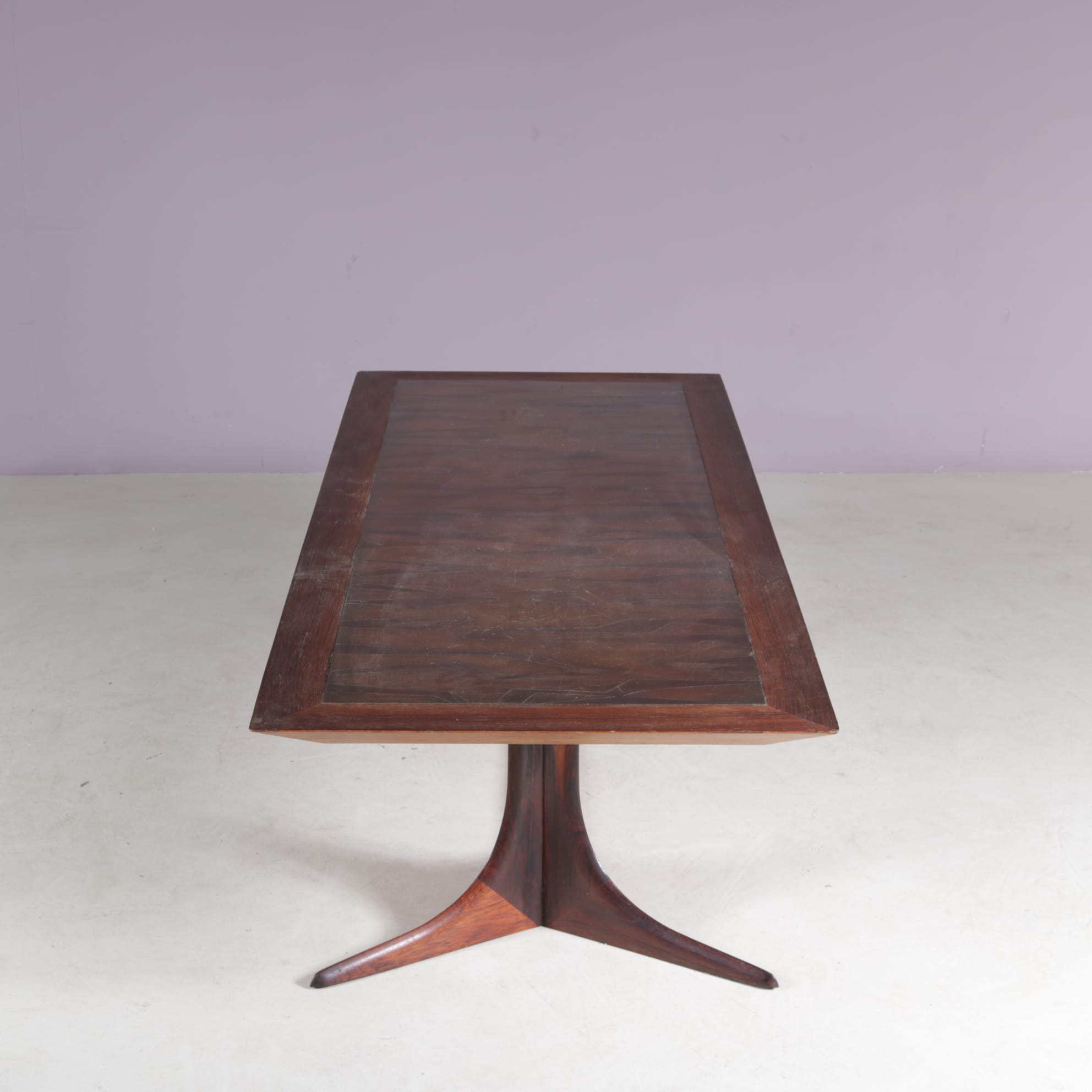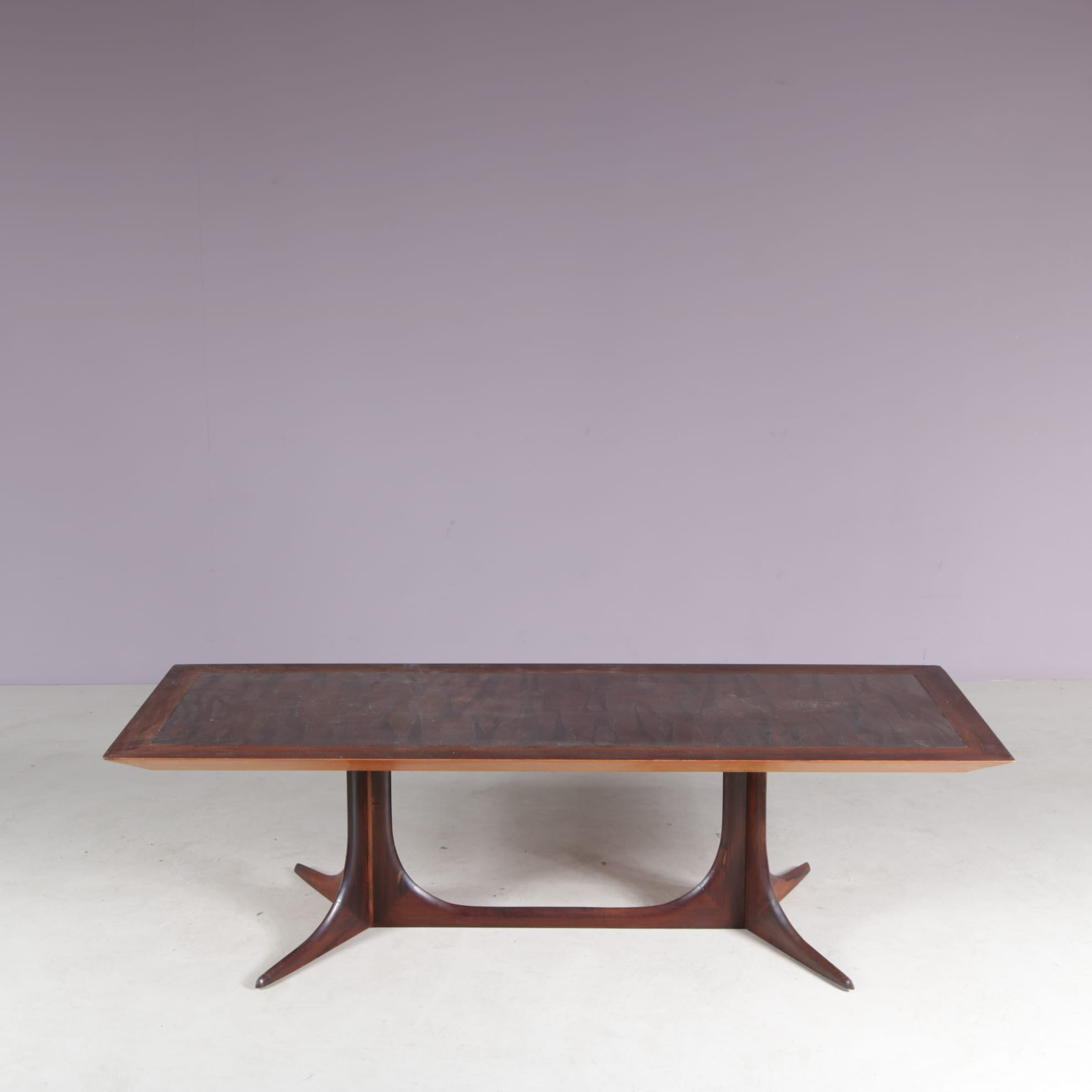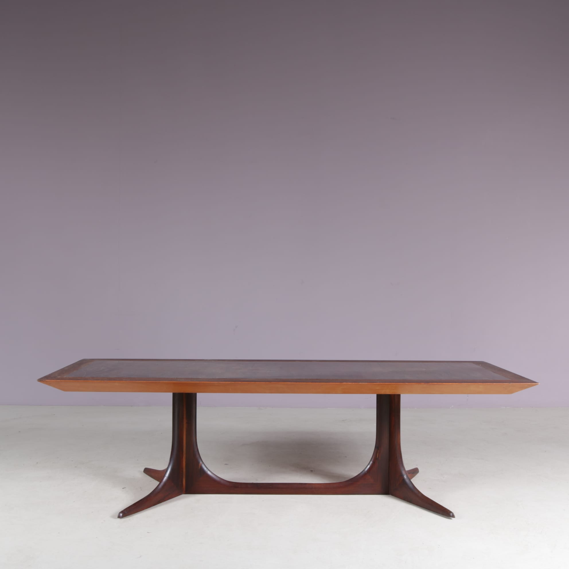 This beautiful table is made of high quality hardowod in a deep, warm brown colour. The base has a beautiful shape and impressive finish with elegant curves and an exceptional eye for detail. It has a copper top, giving it a unique appearance that would perfectly fit in any modern or Scandinavian interior, adding a sense of mid-century luxury and elegance to the decor.