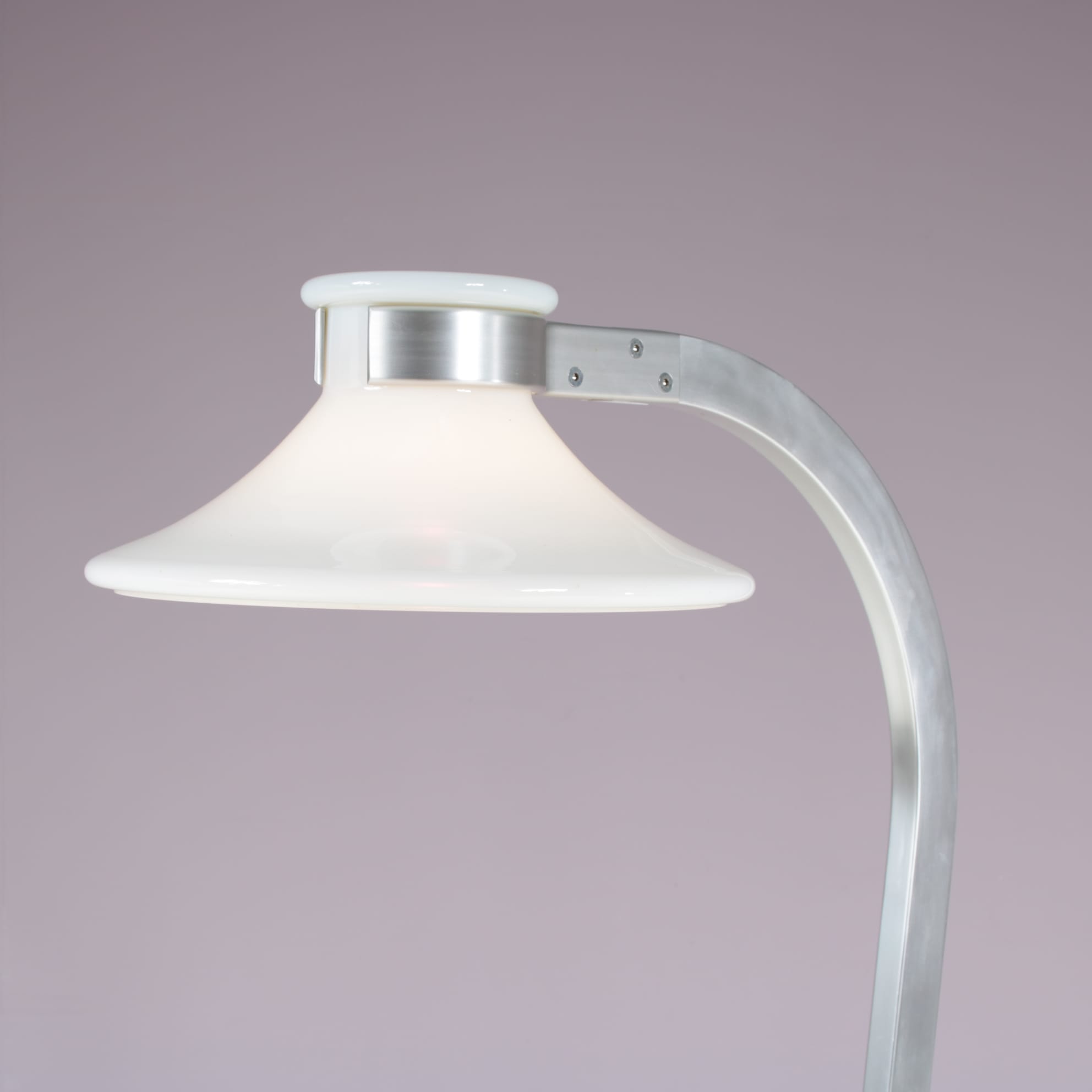 A beautiful elegant piece, made of high quality aluminium in rounded shapes, the foot has a white wooden inlay which matches nicely with the white milk glass shade. When lit, it emits a nice bright light that is gently diffused through the milk glass. all this together combines into a clean, modern aesthetic which makes it a perfect fit for any interior looking for a touch of mid-century elegance!