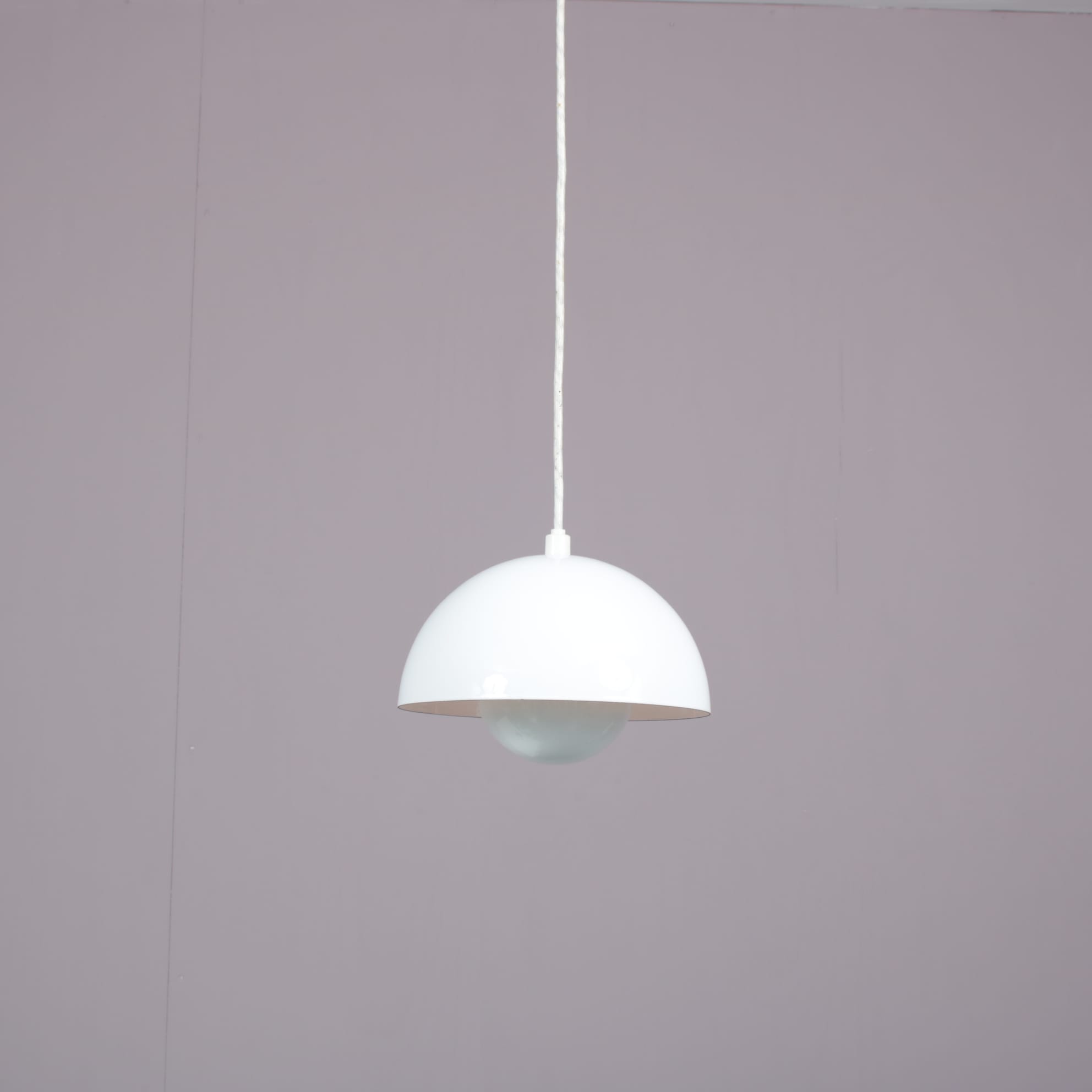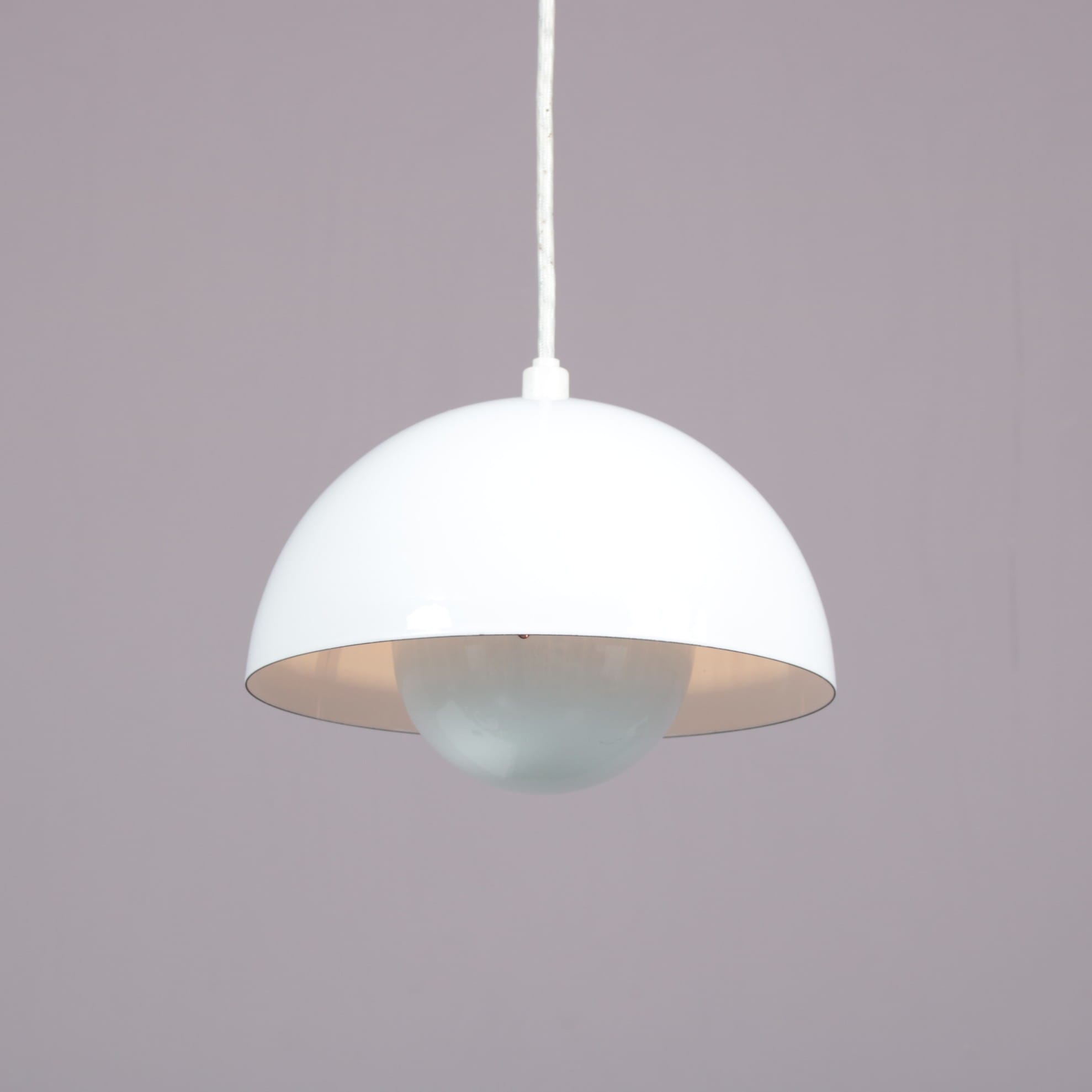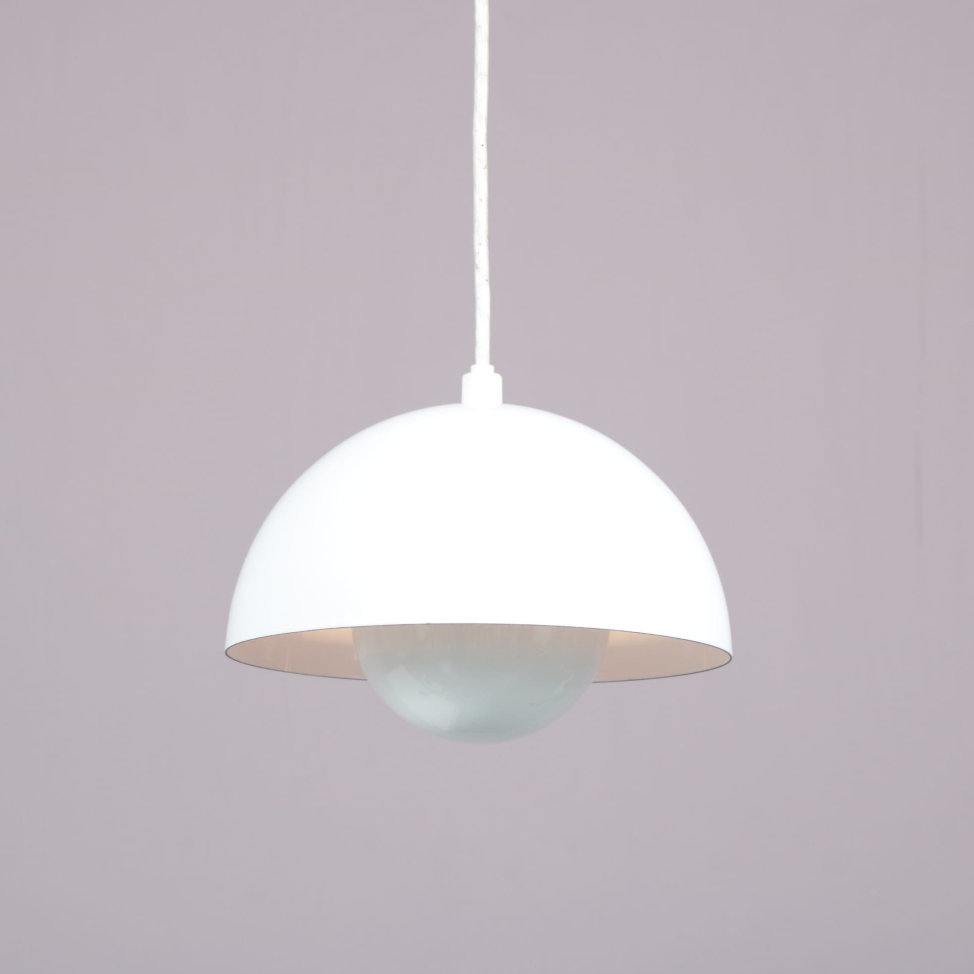 Made of high quality white enameled metal, this lovely piece has a real mid-century appeal to it and adds a pop of brightness and modernism to any interior! When lit, it emits a really nice light. We have several in stock, they could be a lovely independent accent or would combine really nicely above a dining table!