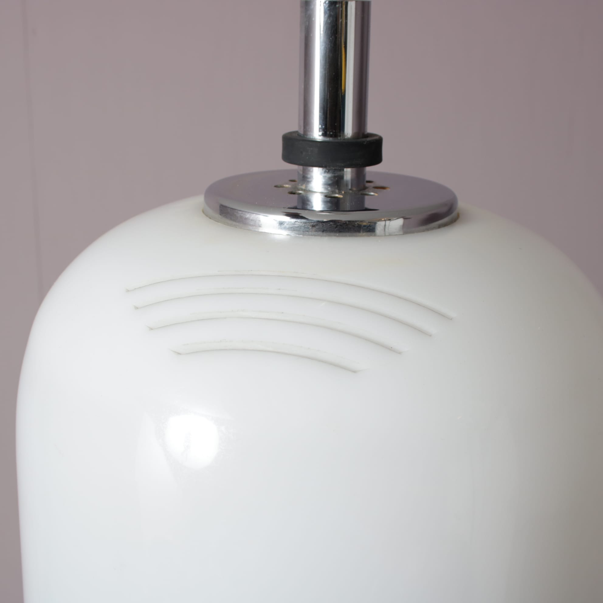 Made of high quality white plexiglass in a nice rounded shape with some small perforated lines at the top as a nice detail. Finished with chrome plated metal details, this piece has a real modern appeal with an elegant touch! When lit, it emits a lovely warm light that adds light and atmosphere to any decor.