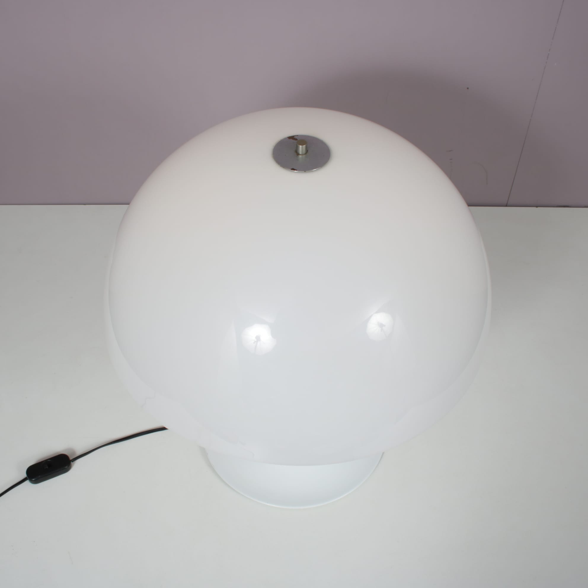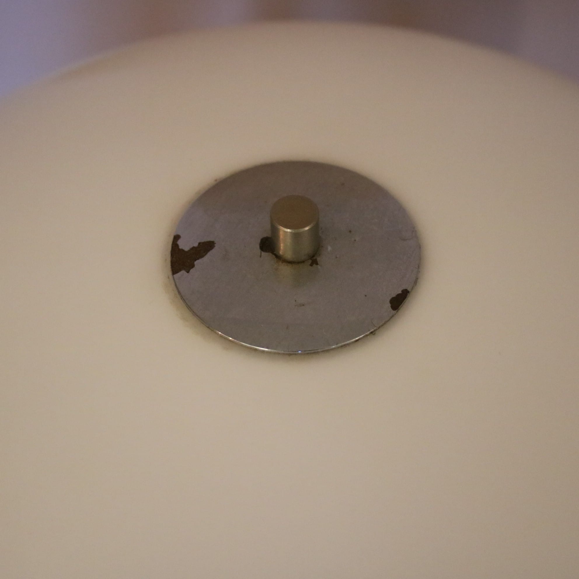This elegant piece features a white metal trumpet shaped base with a rounded white plexiglass shade, creating the characteristic mushroom silhouette. The combination of soft curves and clean materials gives it a timeless modernist look! When lit, it emits a warm, slightly diffused light. A lovely design that embodies that will be a really nice addition to the decor!