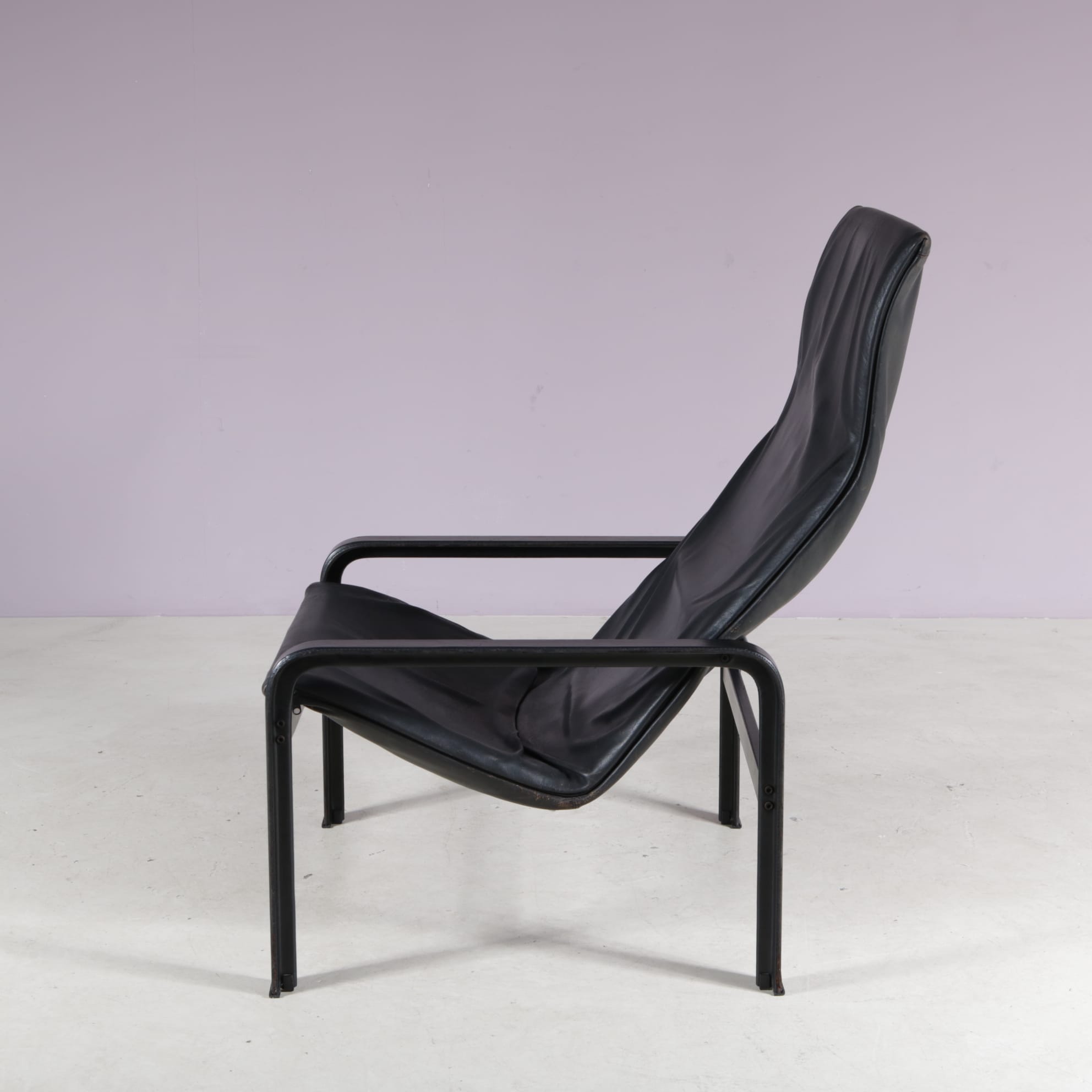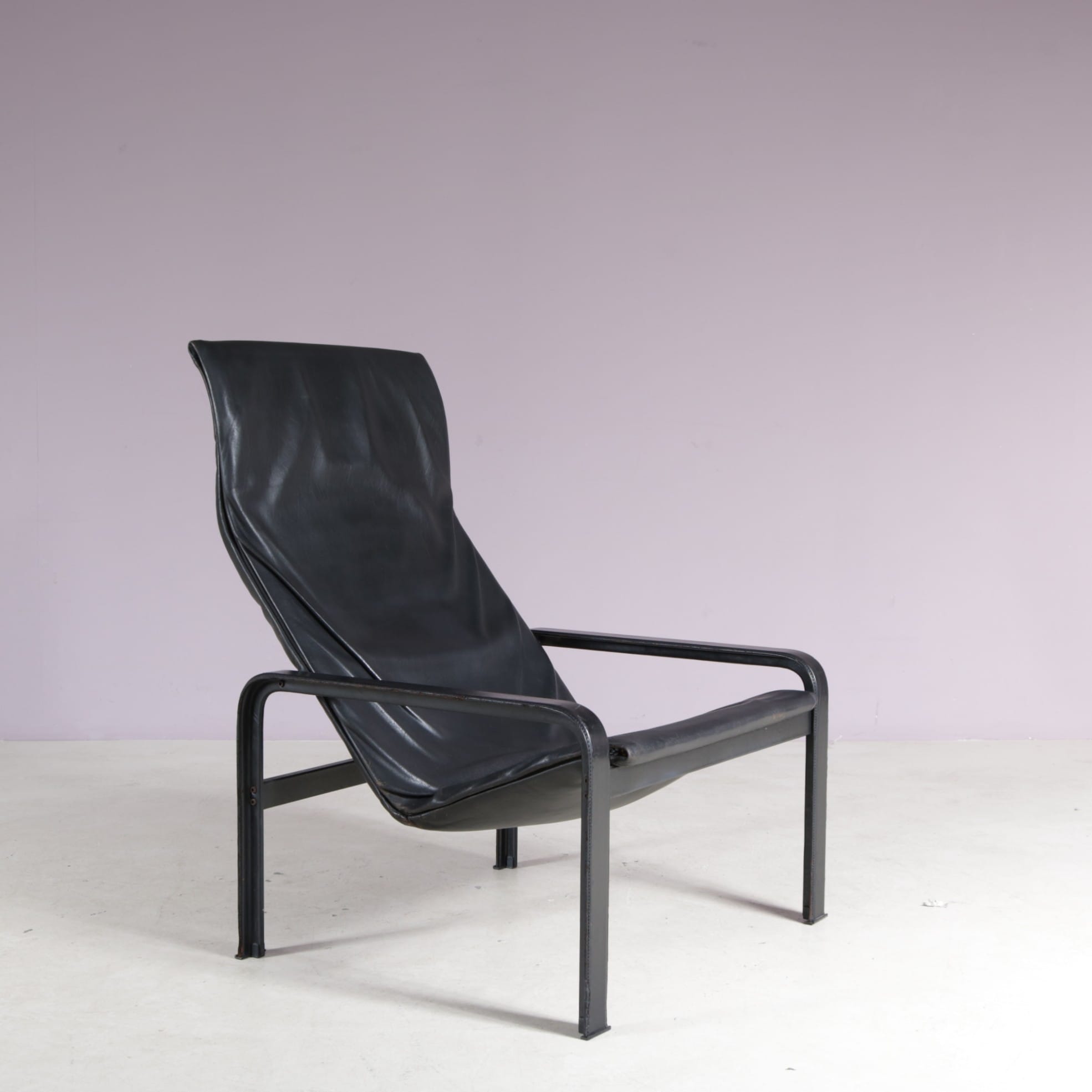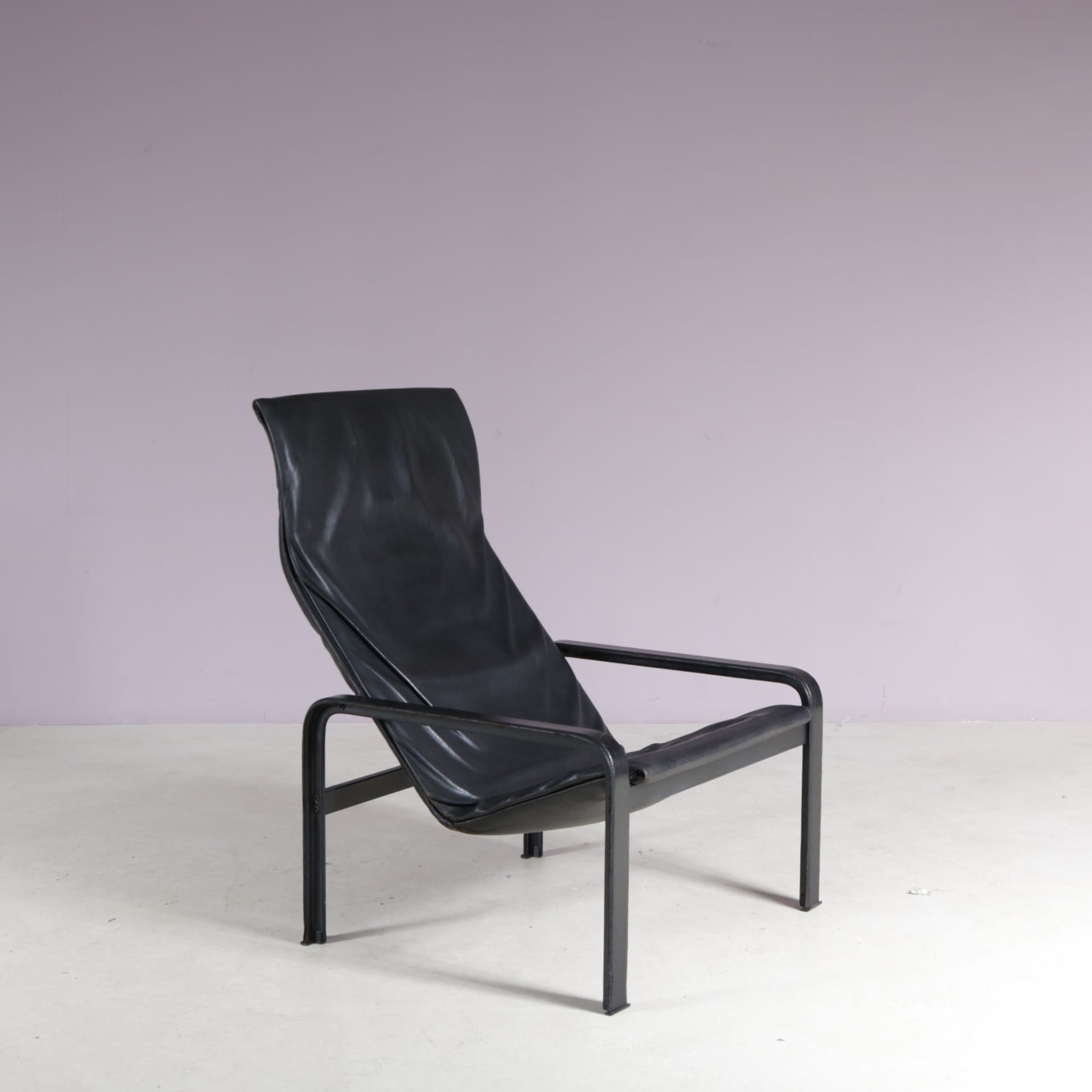 This rare post-modern lounge chair is fully upholstered in black leather. That goes for the seat and back, but also for the metal frame! This gives the piece a unique, harmonious and luxurious appeal. The frame is nicely bent into shape and the backwards tilted seat has a gently curved, ergonomic shape that adds to the comfort as well as the elegant style of the piece. A beautiful and most recognizable find of mid-century Italian design!
