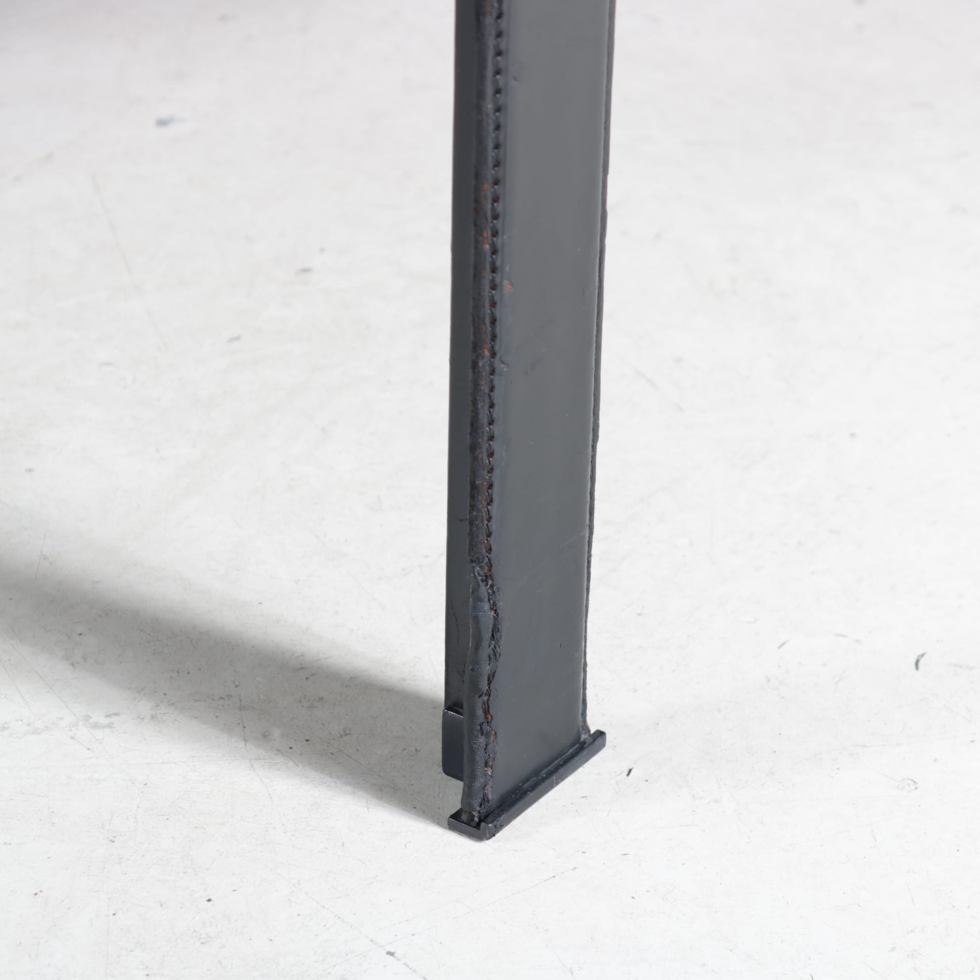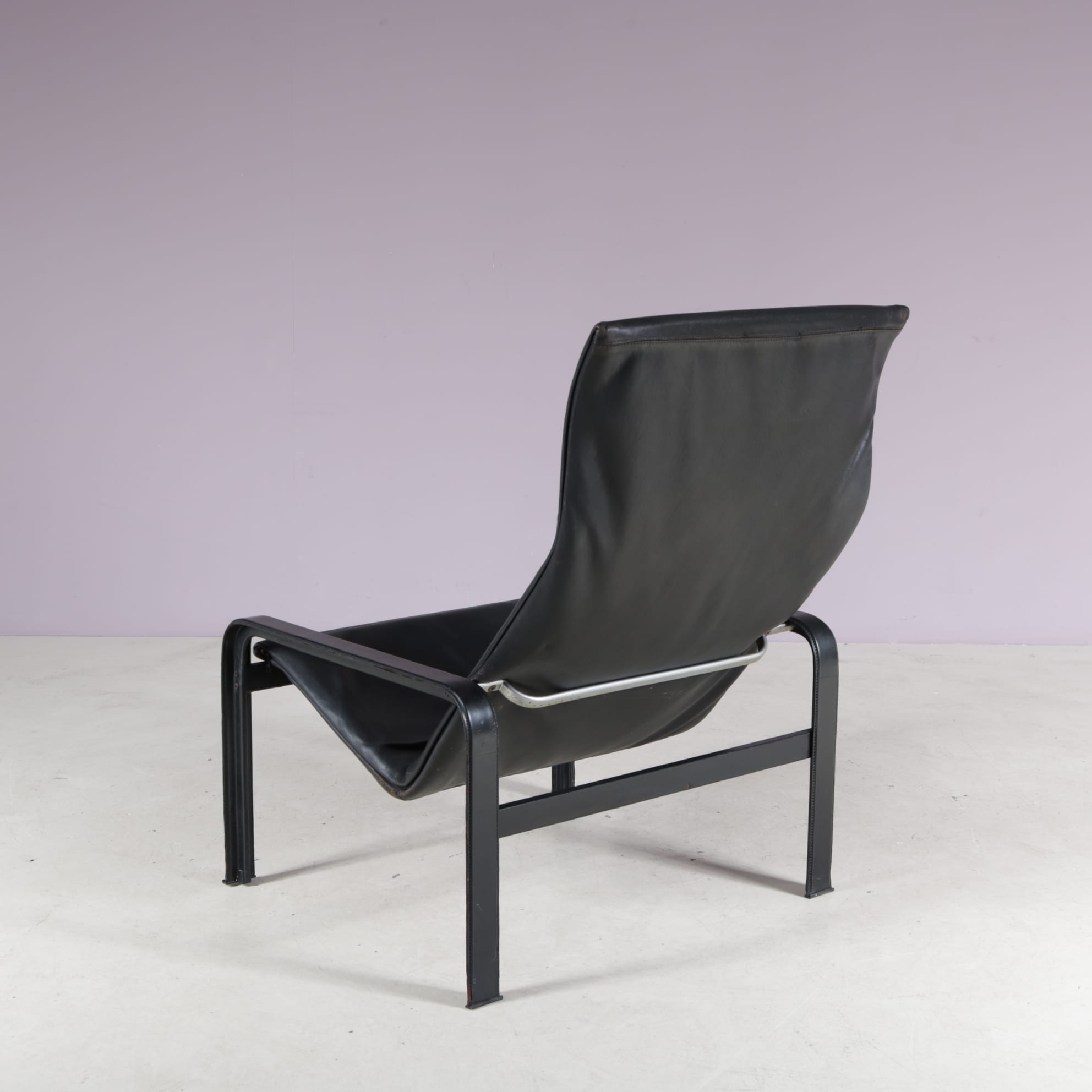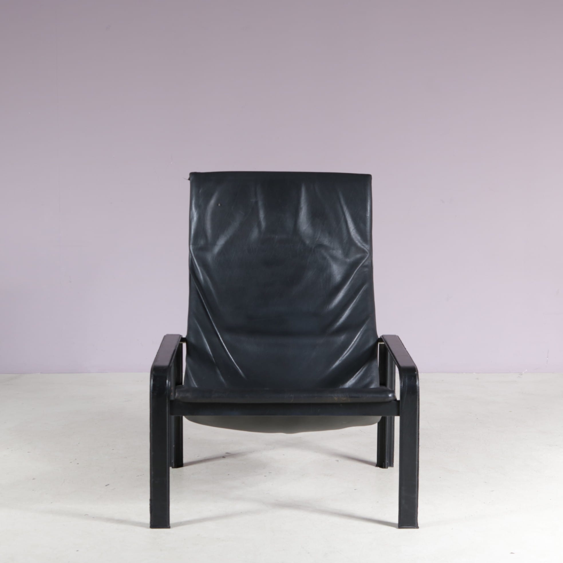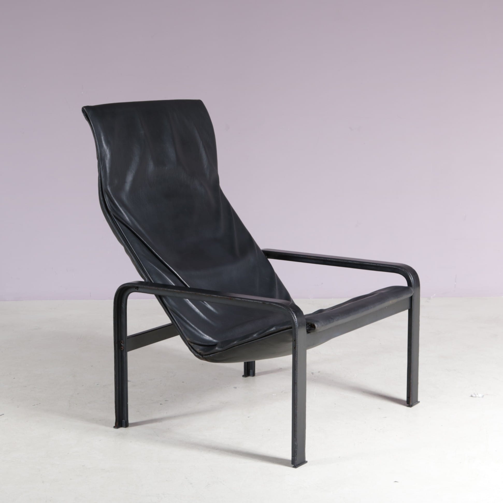 This rare post-modern lounge chair is fully upholstered in black leather. That goes for the seat and back, but also for the metal frame! This gives the piece a unique, harmonious and luxurious appeal. The frame is nicely bent into shape and the backwards tilted seat has a gently curved, ergonomic shape that adds to the comfort as well as the elegant style of the piece. A beautiful and most recognizable find of mid-century Italian design!