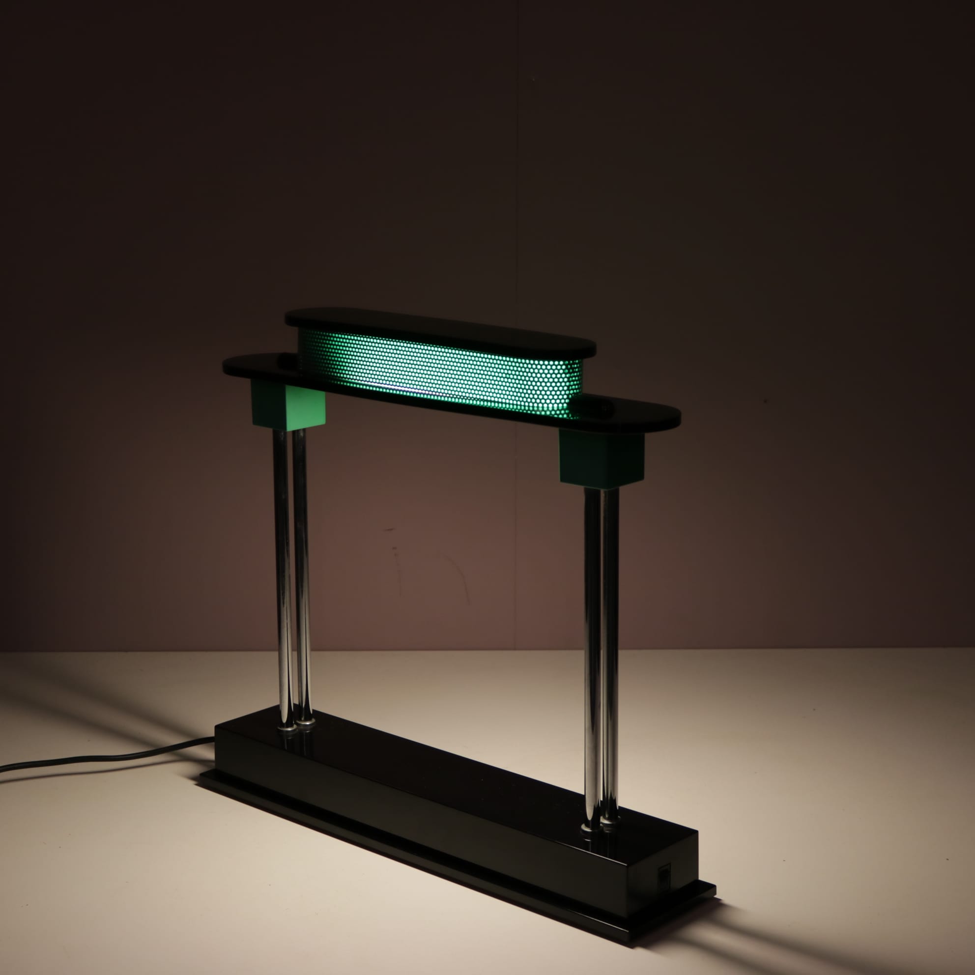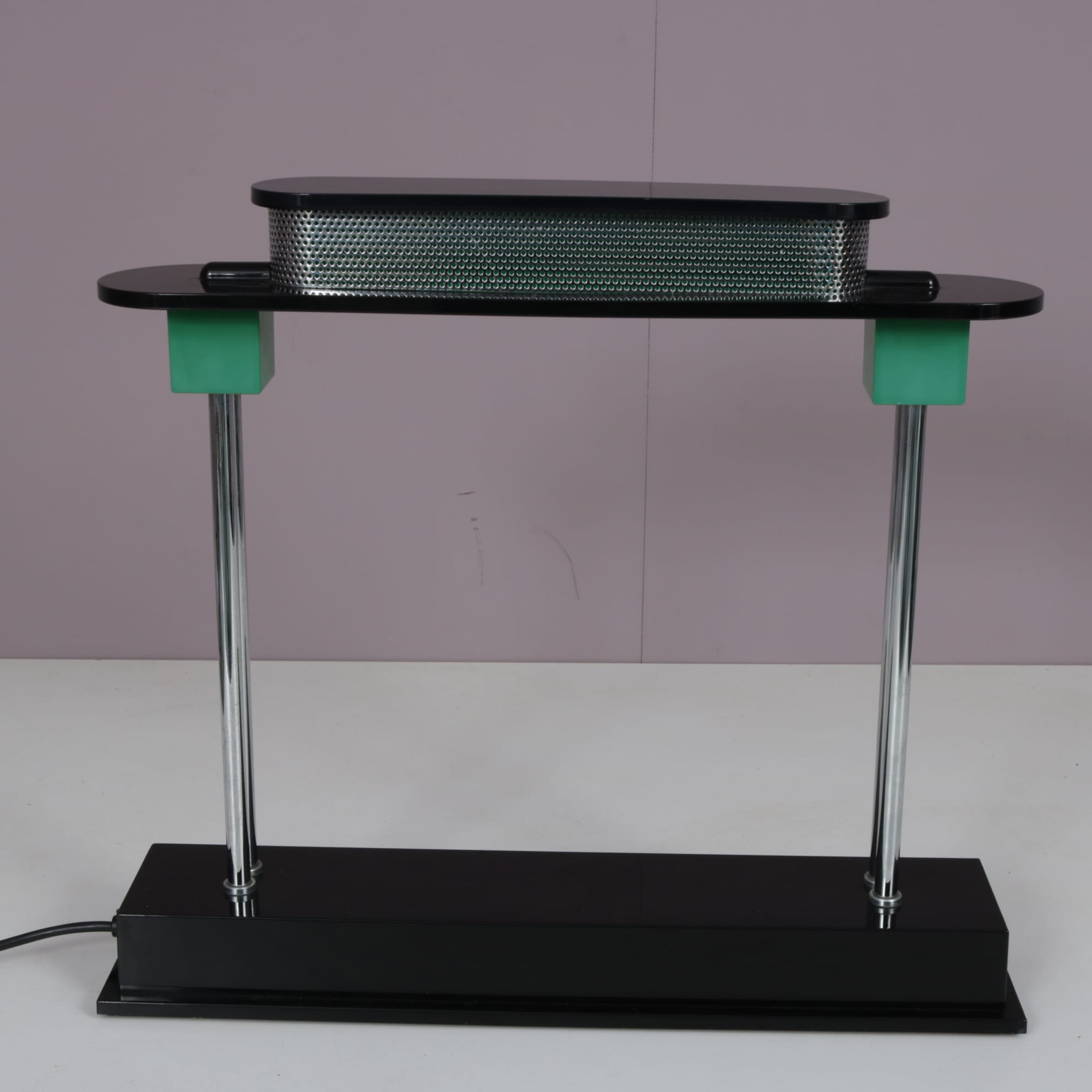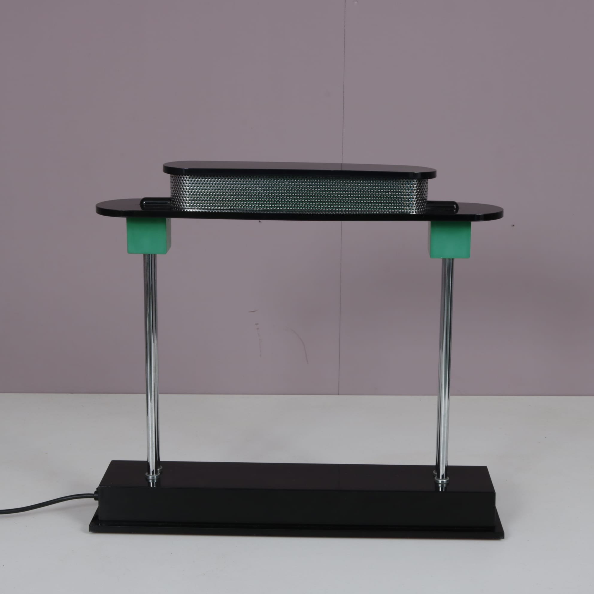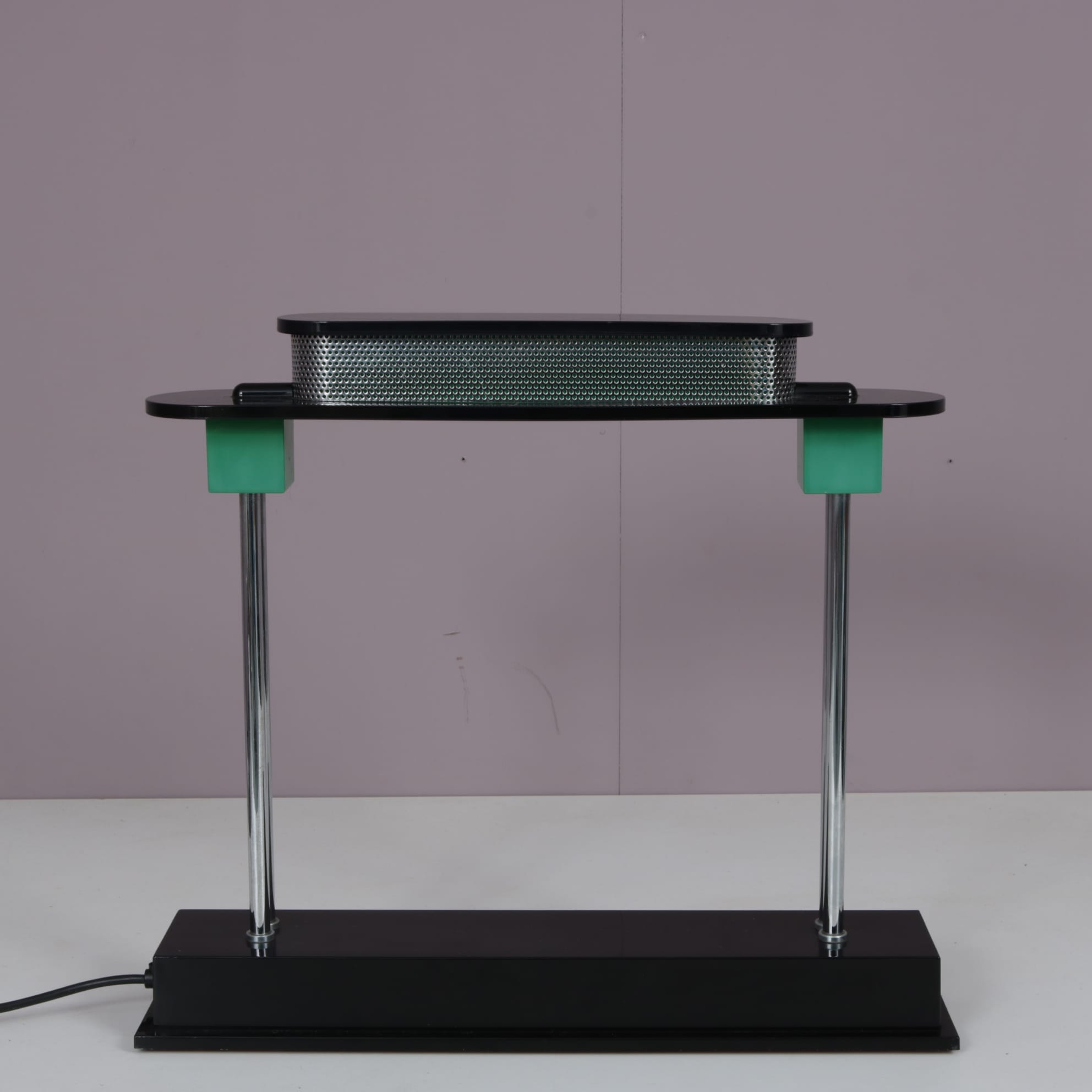 This eye-catching piece is a highly recognizable design by one of Italy’s greatest designers from the mid century, Ettore Sottsass. Known for his unique use of shapes an materials, this lamp is no exception. It has a memphis like style with a great sense of elegance. Made of black and green plastic, a typical material used in Italy durig this time, with chrome plated metal arms. The colours and materials combine really nicely and give the piece a luxurious yet modern style. A wonderful find that will be a great addition to any decor or office space!
