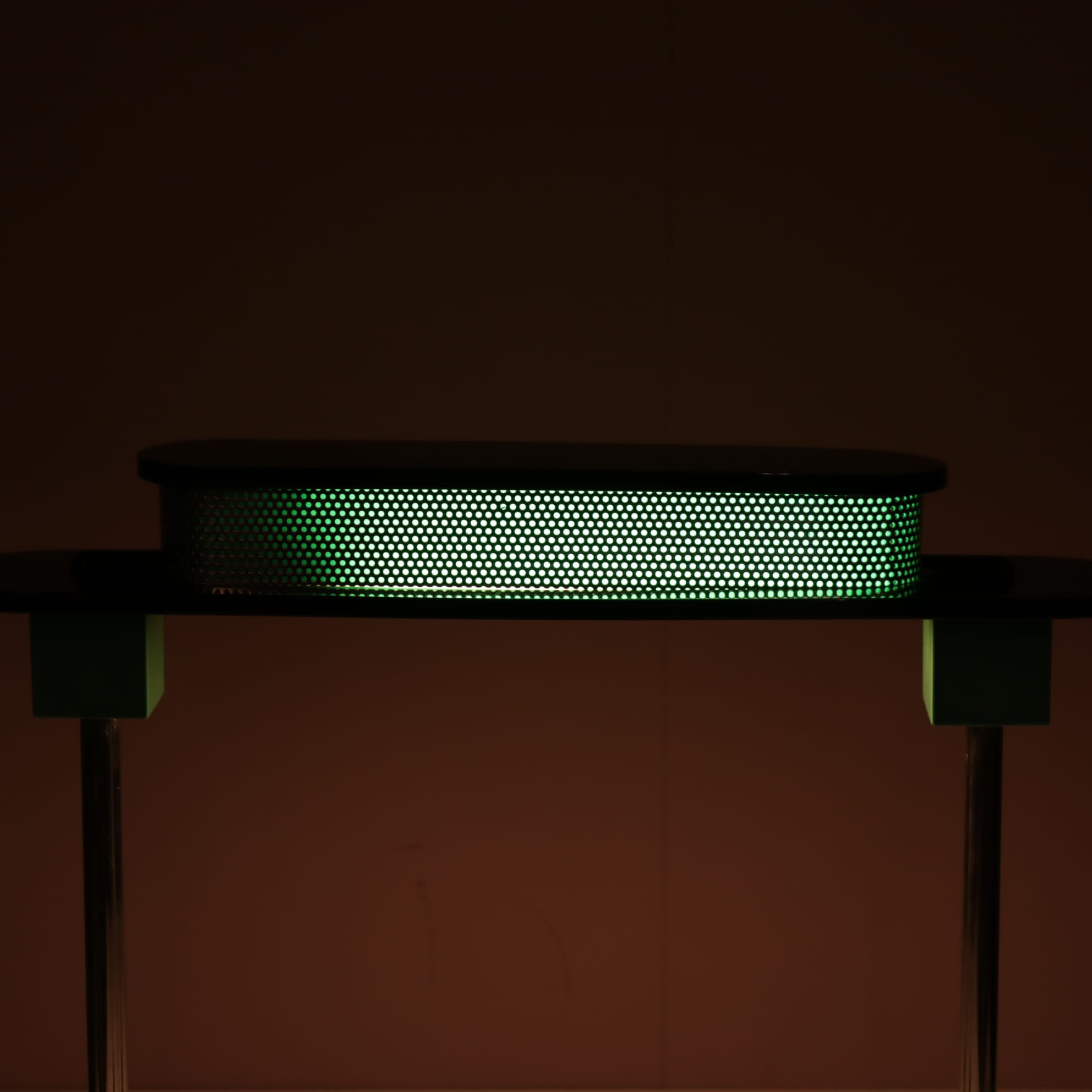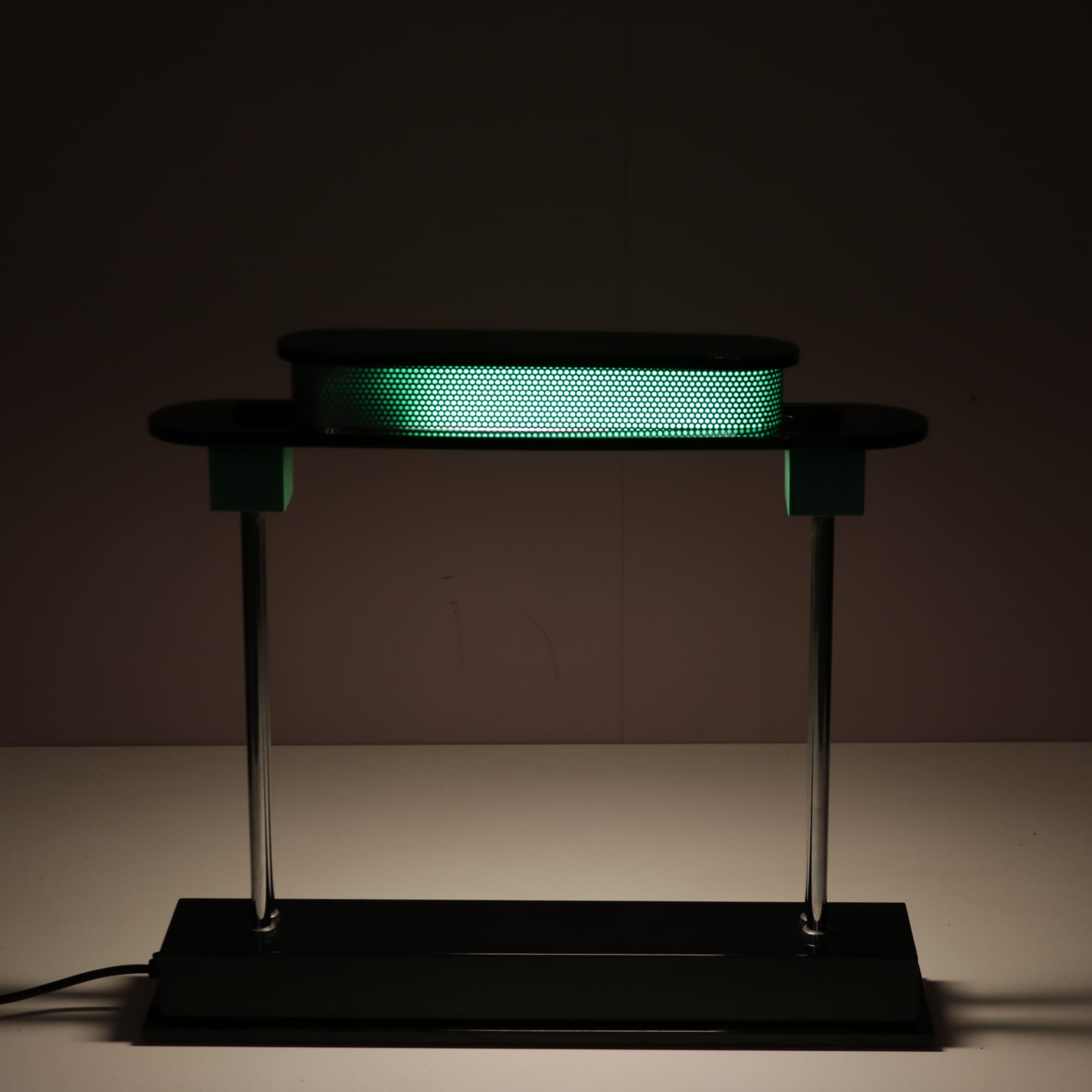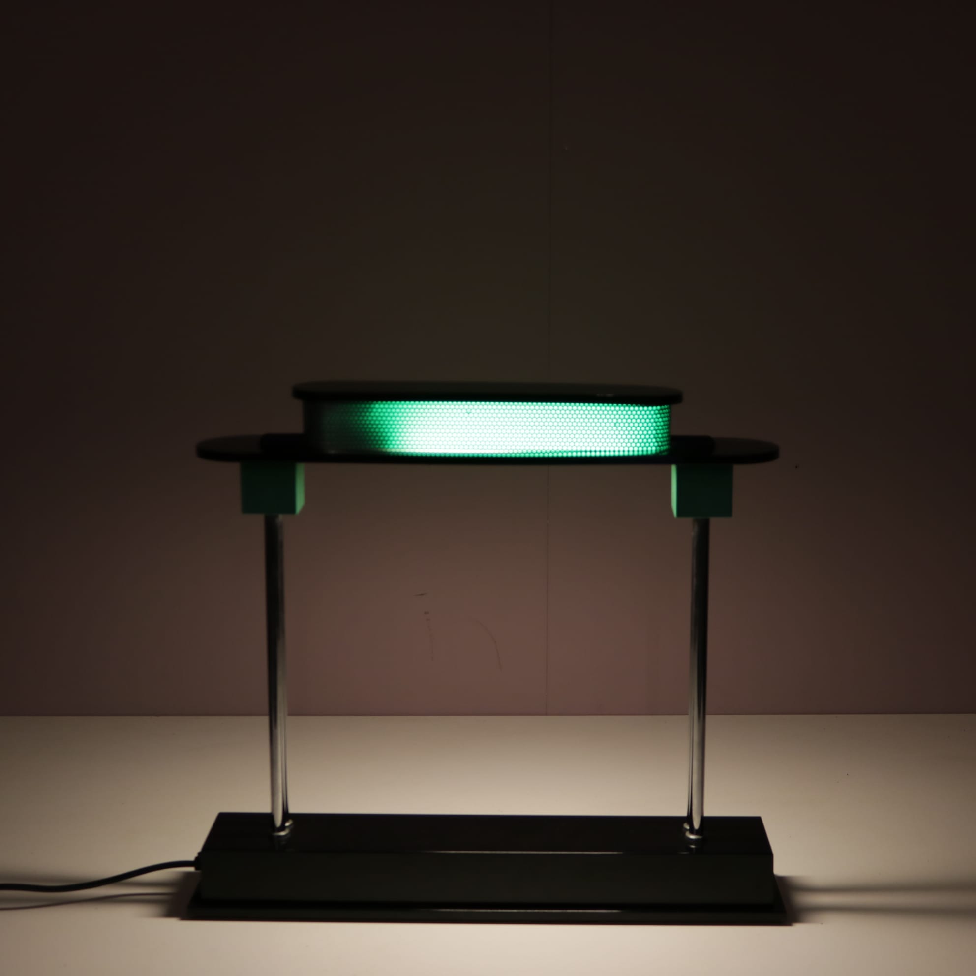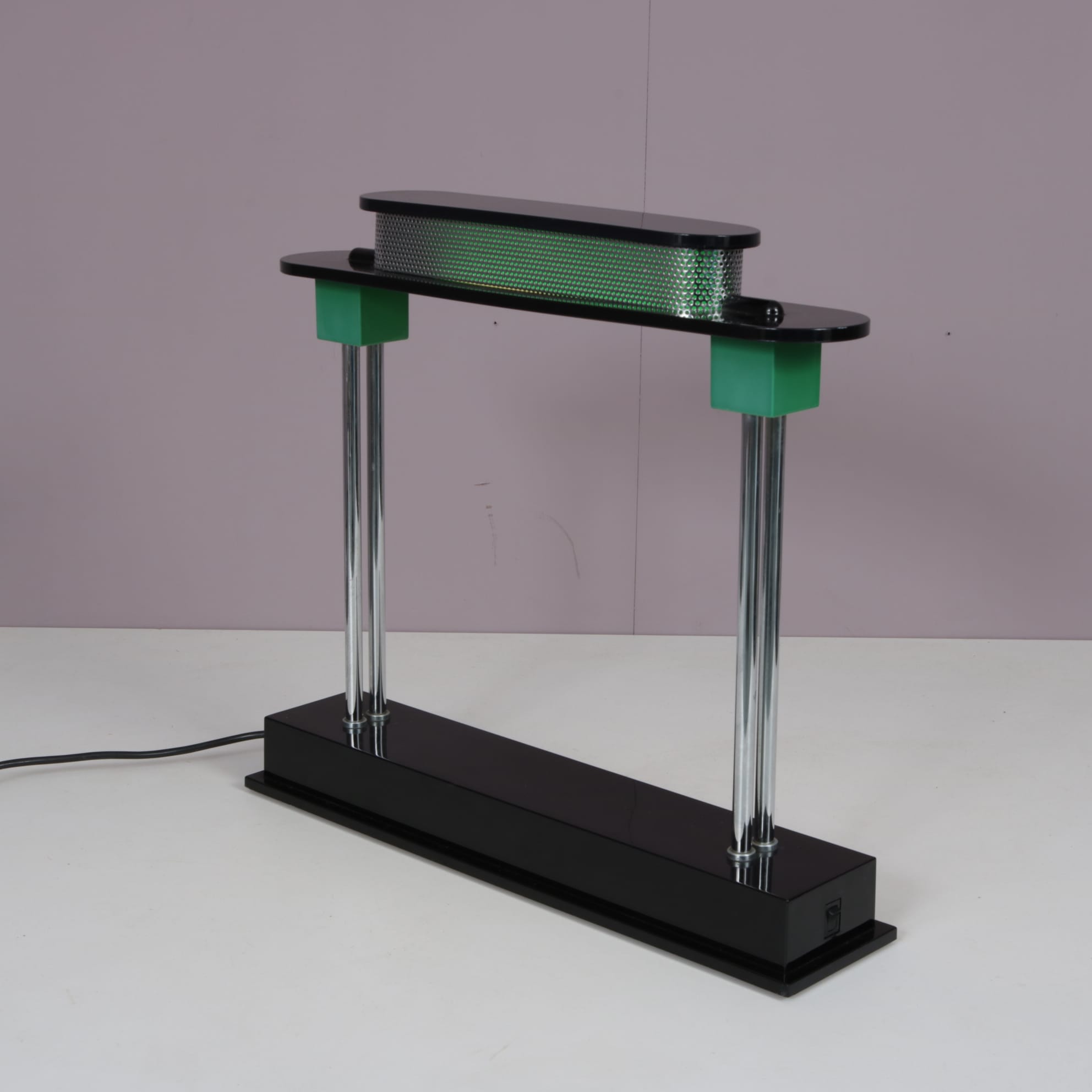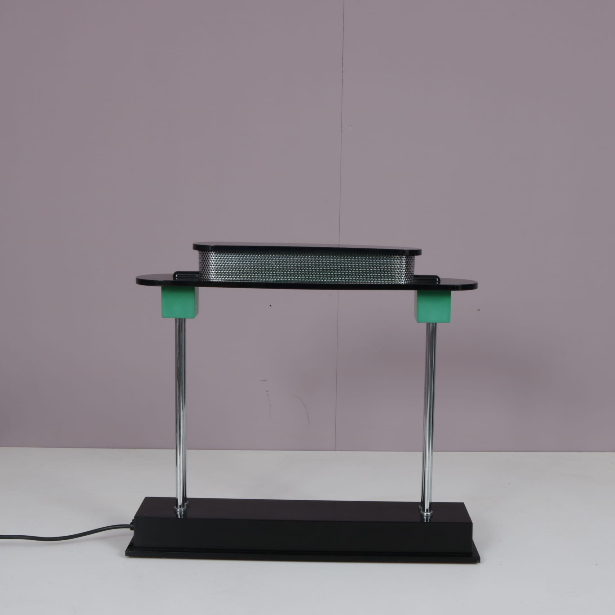 This eye-catching piece is a highly recognizable design by one of Italy’s greatest designers from the mid century, Ettore Sottsass. Known for his unique use of shapes an materials, this lamp is no exception. It has a memphis like style with a great sense of elegance. Made of black and green plastic, a typical material used in Italy durig this time, with chrome plated metal arms. The colours and materials combine really nicely and give the piece a luxurious yet modern style. A wonderful find that will be a great addition to any decor or office space!