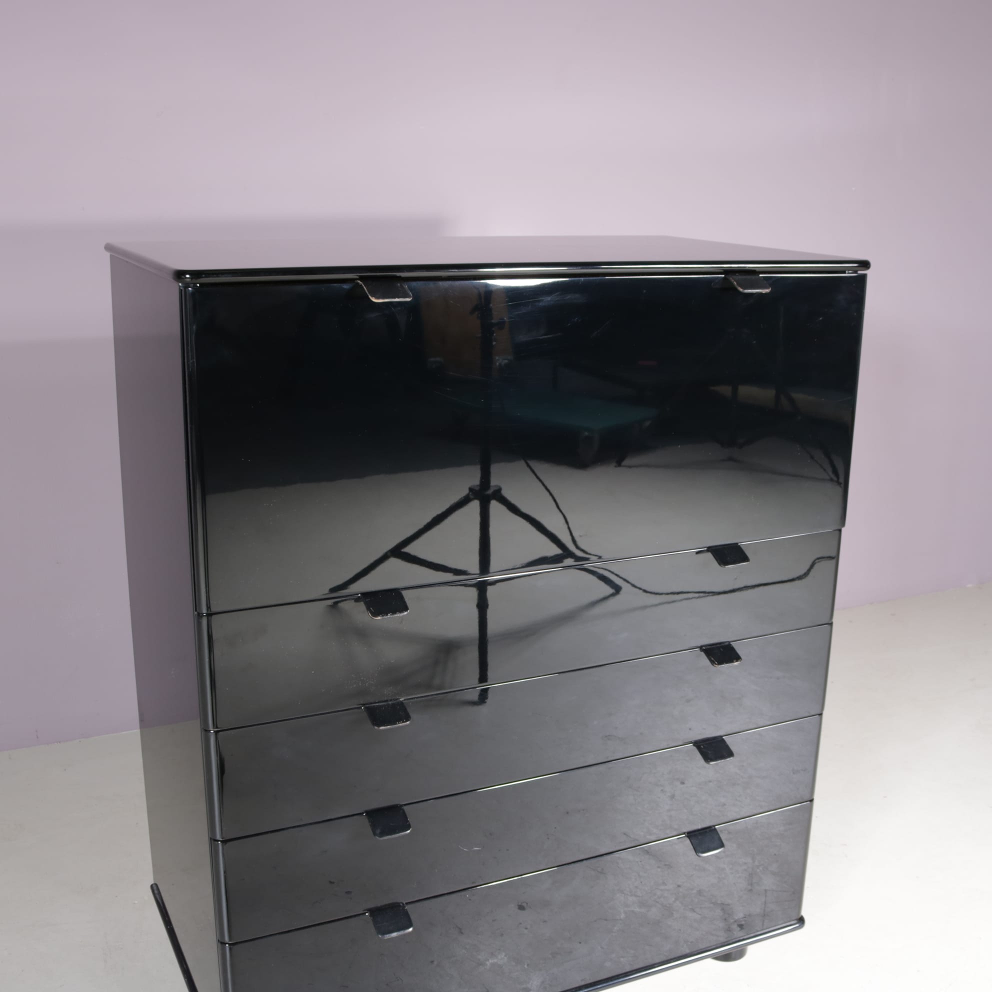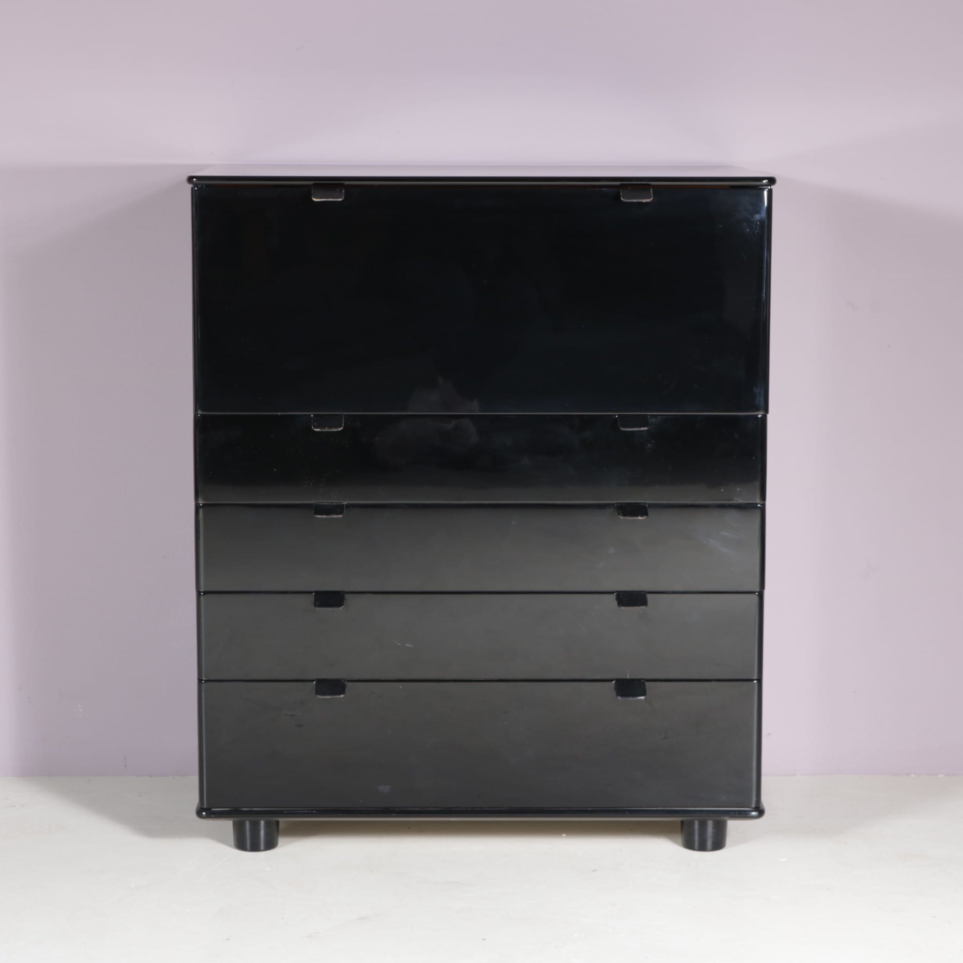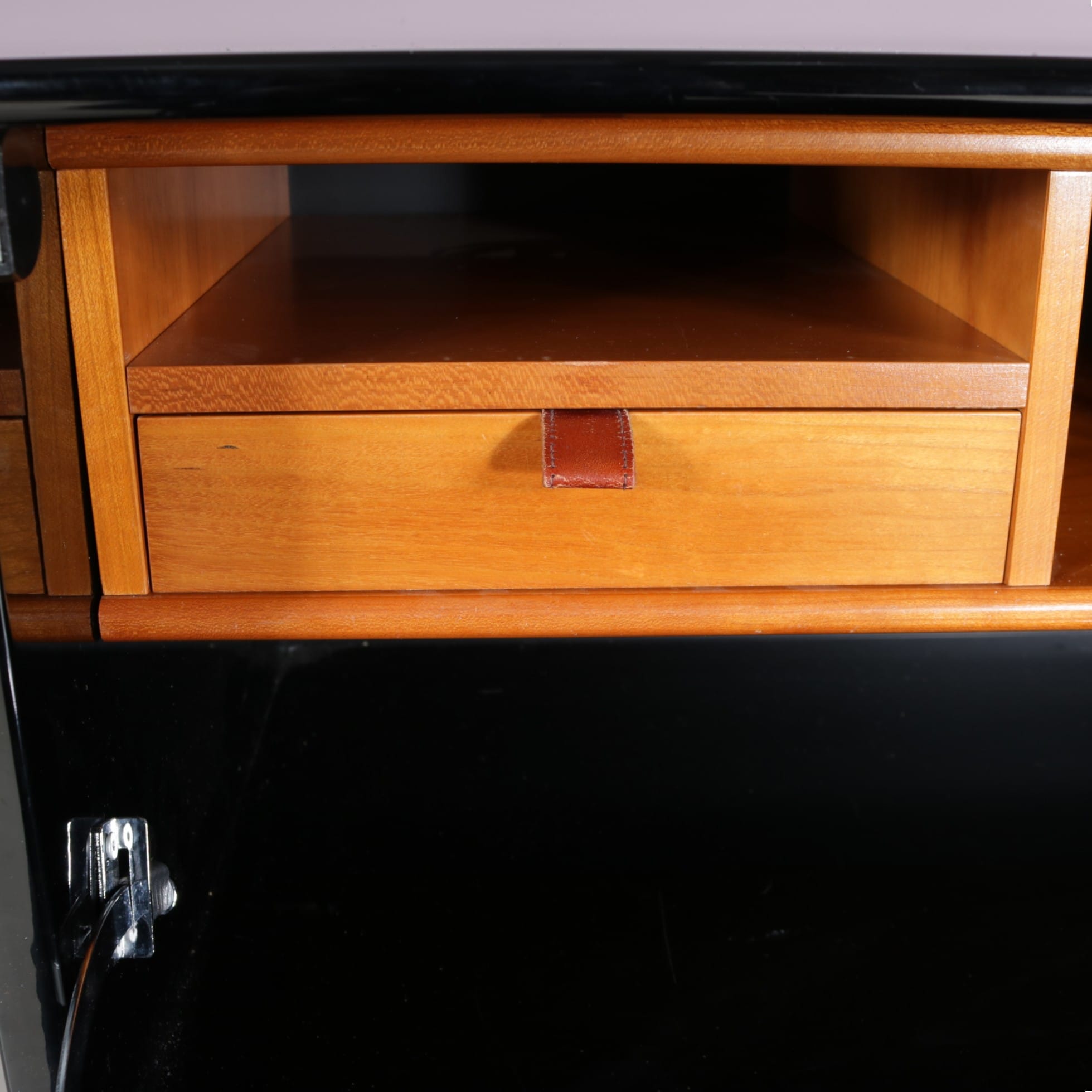 This elegant piece has a high gloss black lacquered finish, which gives it a wonderful sense of luxury. When opened, it reveals a secretary drop down door and plentiful storage capacity. It also has four drawers. Each door has black leather handles as a lovely finishing touch. All together this is a versatile and beautiful piece that will be a unique addition to any decor!