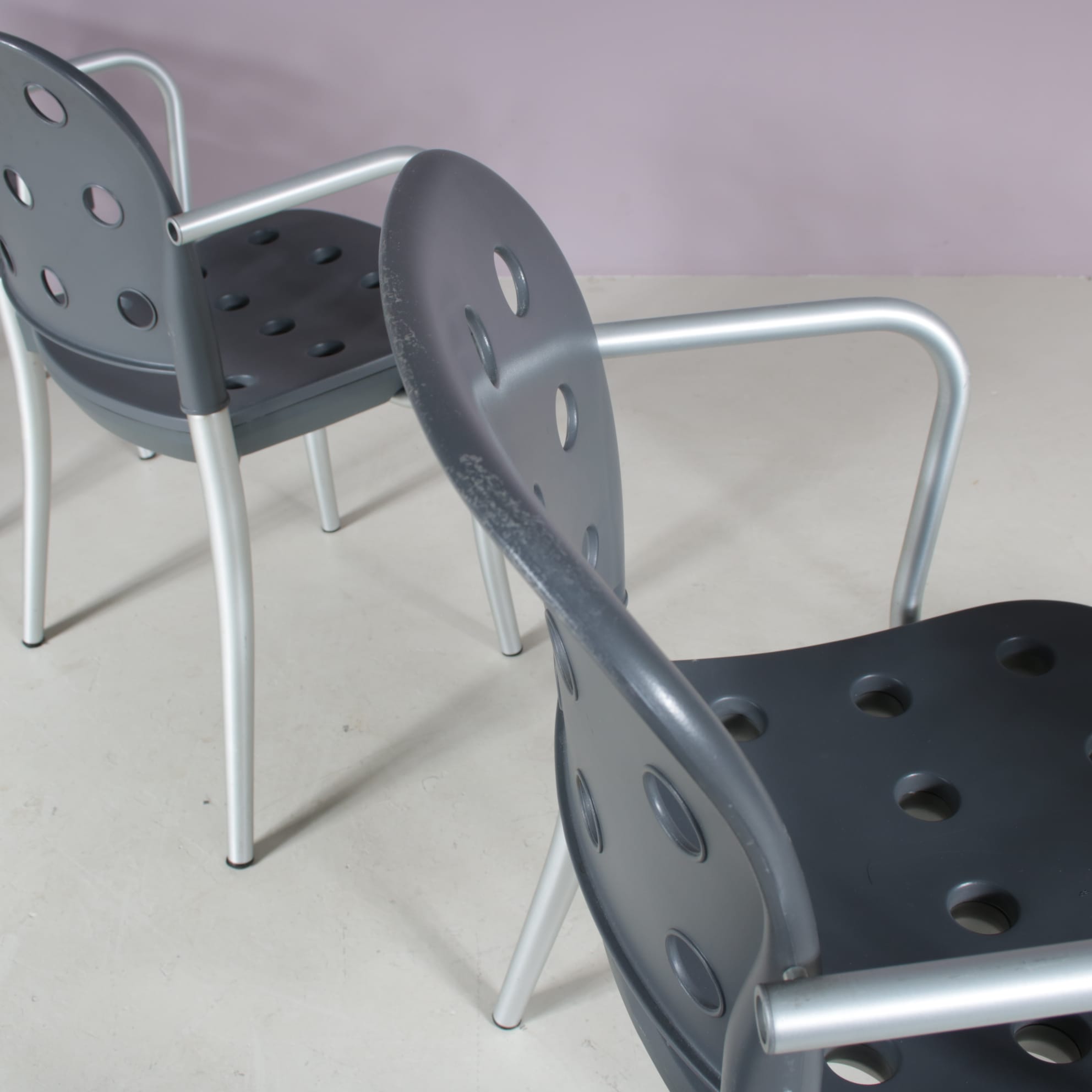 2511 2 (59) m28130 1980s Set of 4 Minni dining chais in aluminium with plastic back and seat Antonio Citterio Halifax, Italy