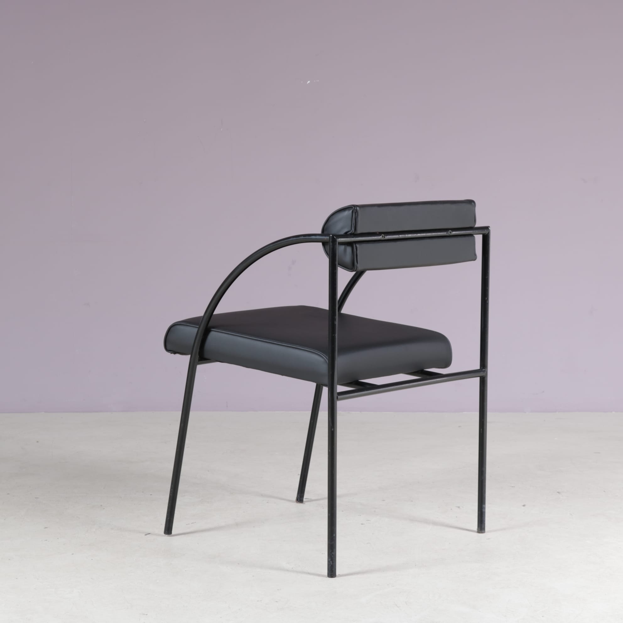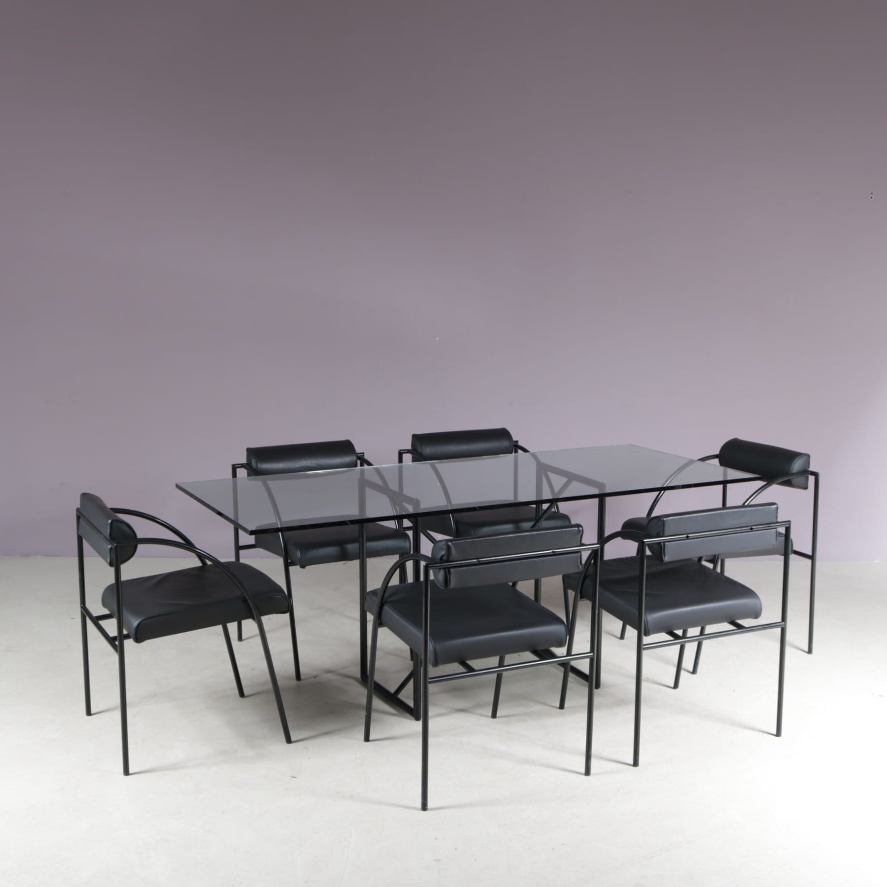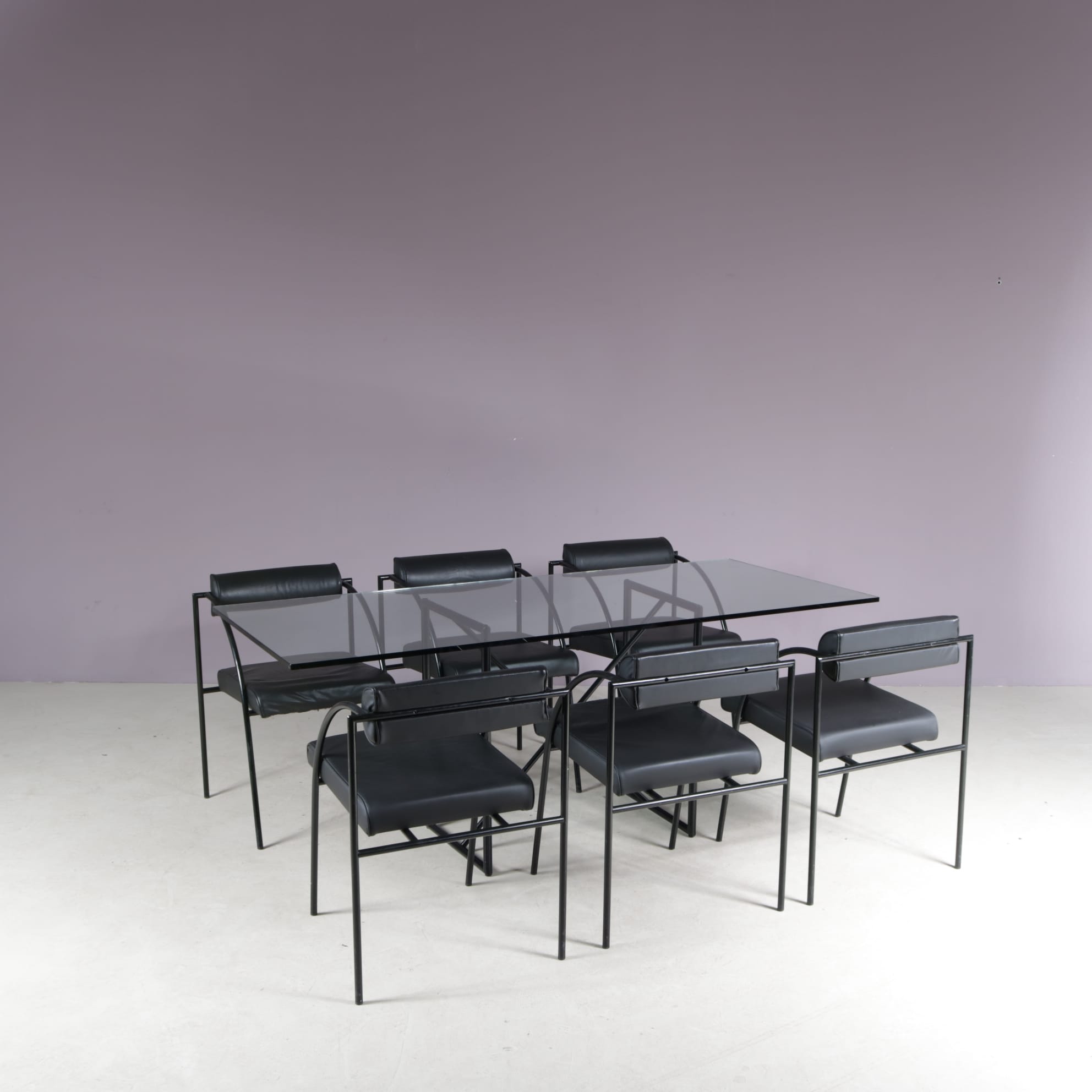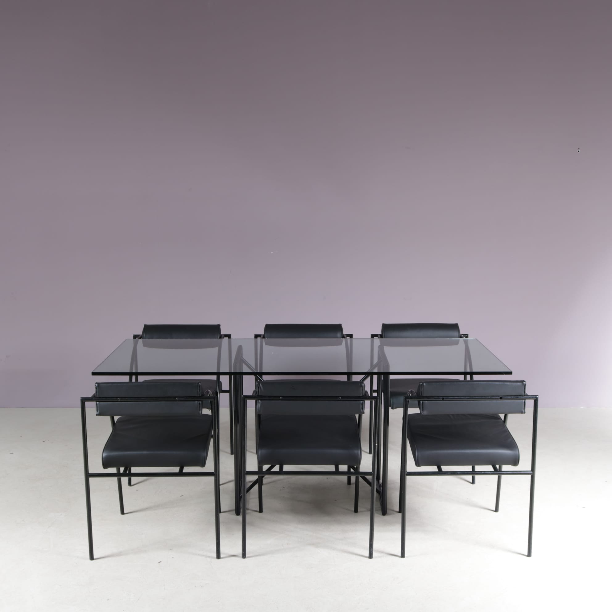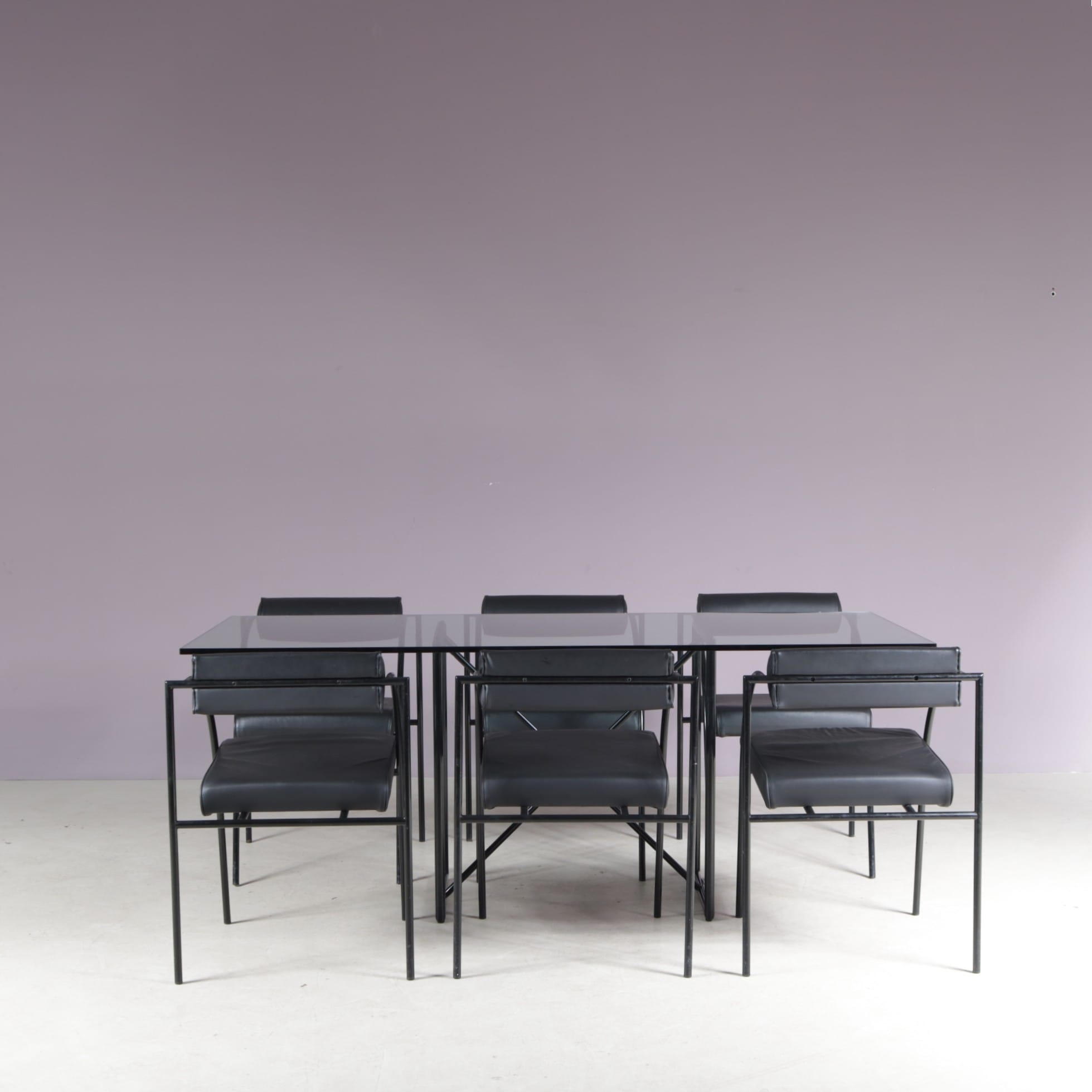 The set includes one “Tokio” table and six “Vienna” chairs. All made of thin tubular black lacquered metal with a nice minimalist structure. The table has a clear glass top which emphasizes the style well. The chairs have black skai (faux leather) upholstered seats and backrests. The monochrome style of the set makes it a beautiful combination with a unique style, all while remaining a wonderful harmony!