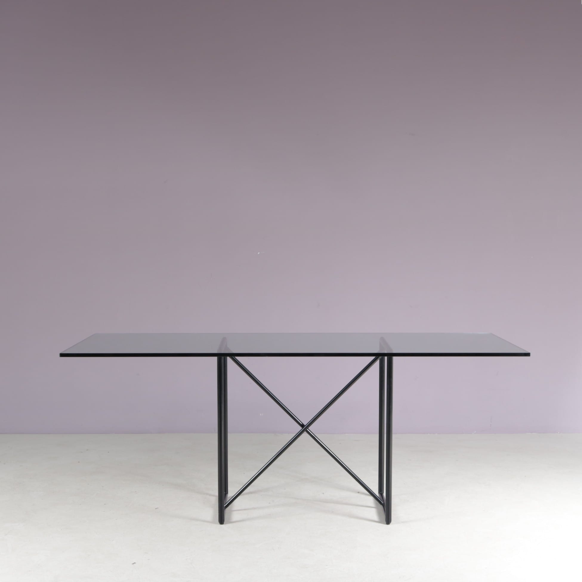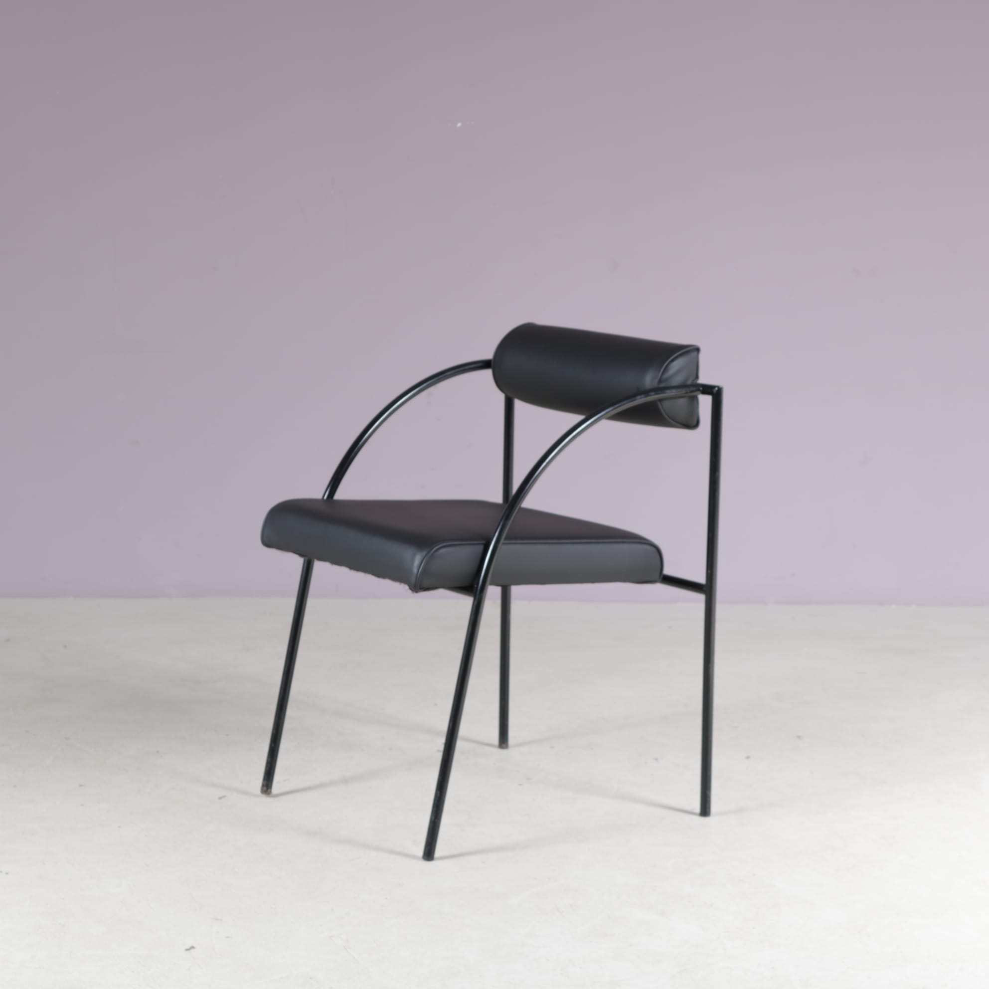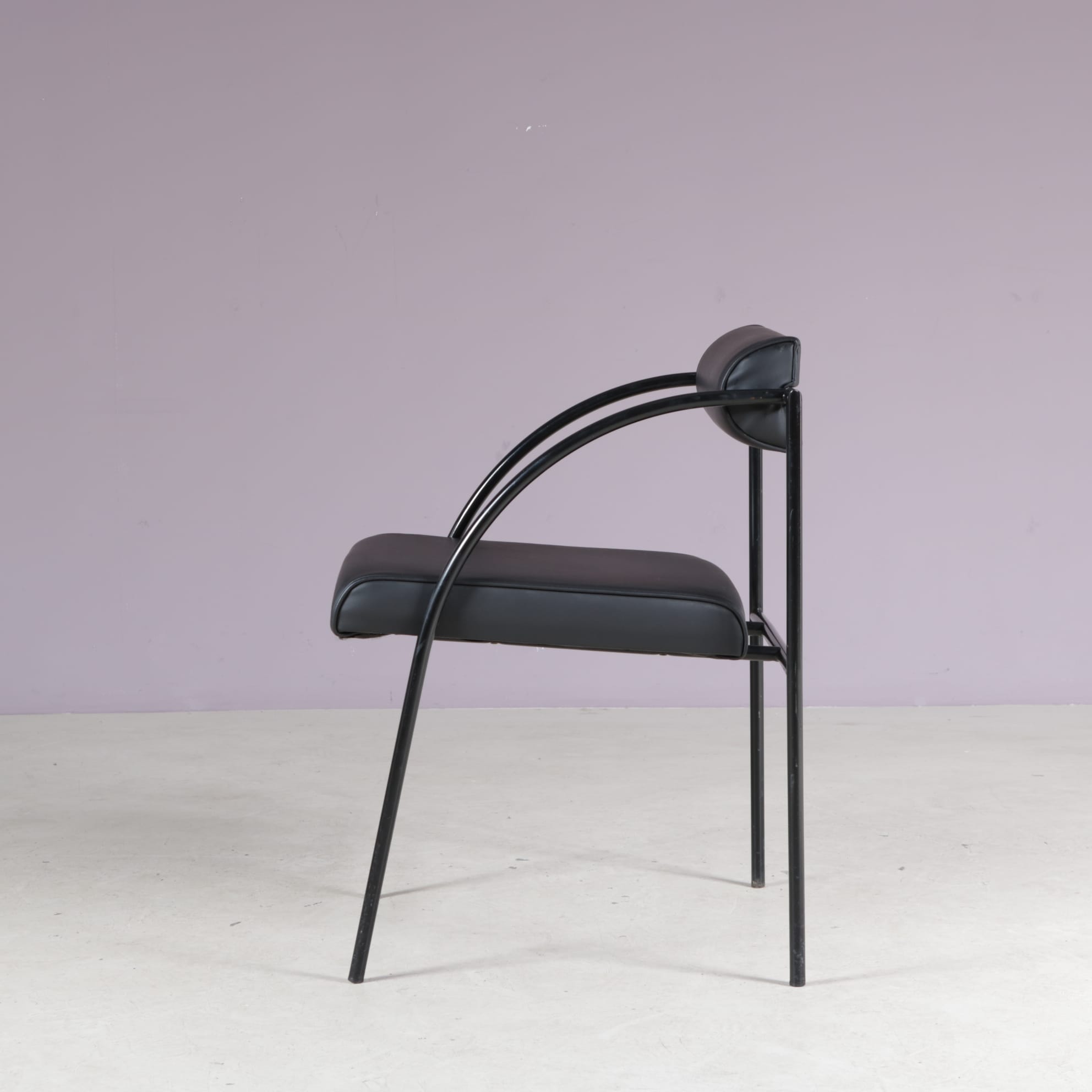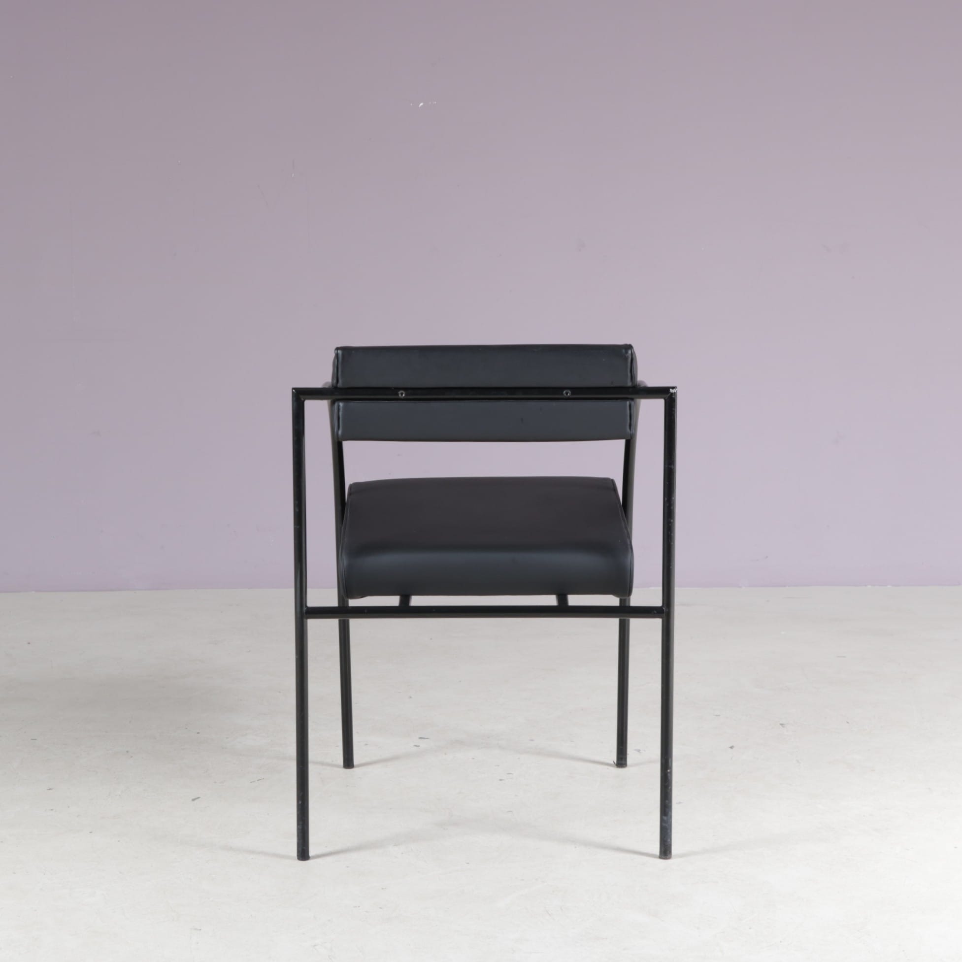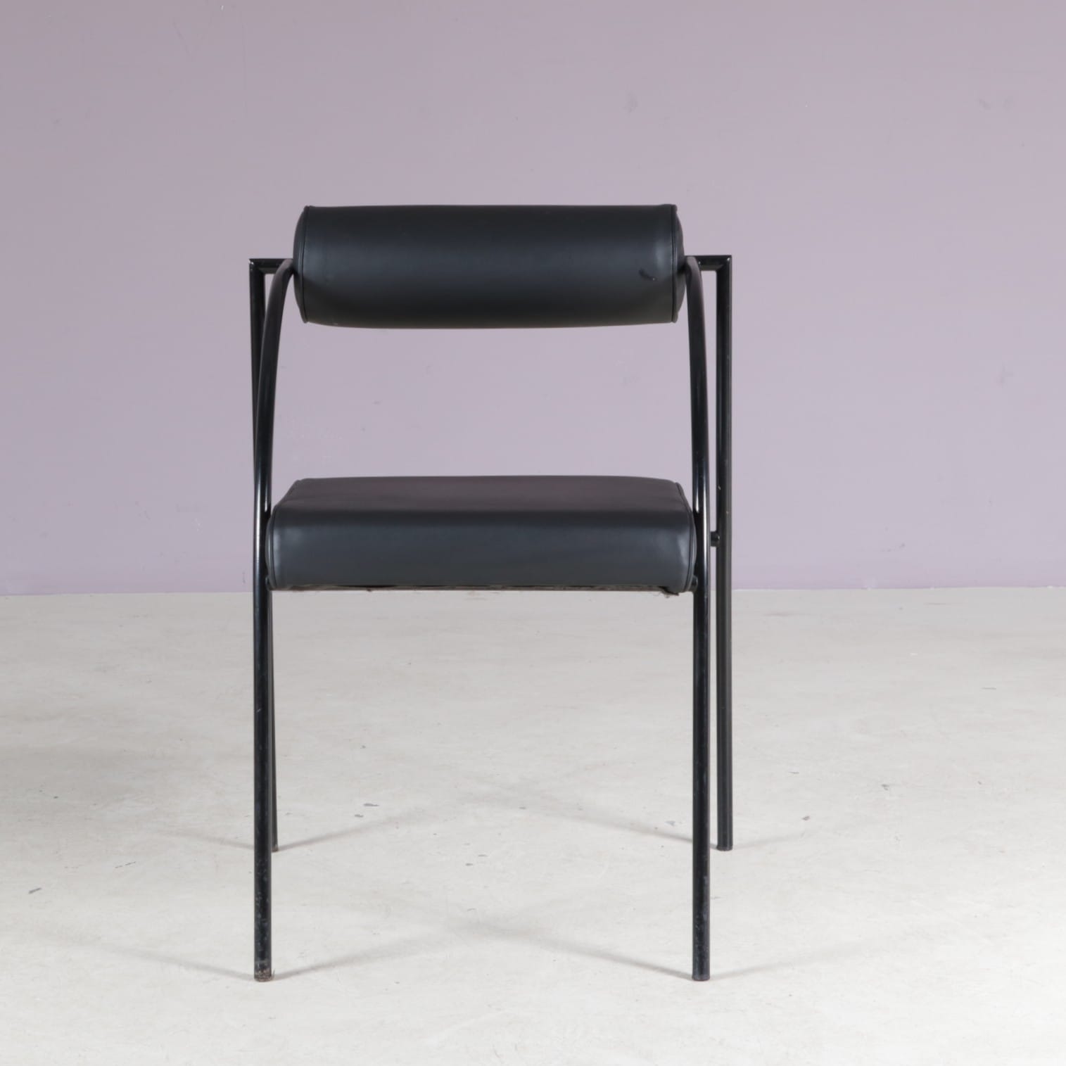 The set includes one “Tokio” table and six “Vienna” chairs. All made of thin tubular black lacquered metal with a nice minimalist structure. The table has a clear glass top which emphasizes the style well. The chairs have black skai (faux leather) upholstered seats and backrests. The monochrome style of the set makes it a beautiful combination with a unique style, all while remaining a wonderful harmony!