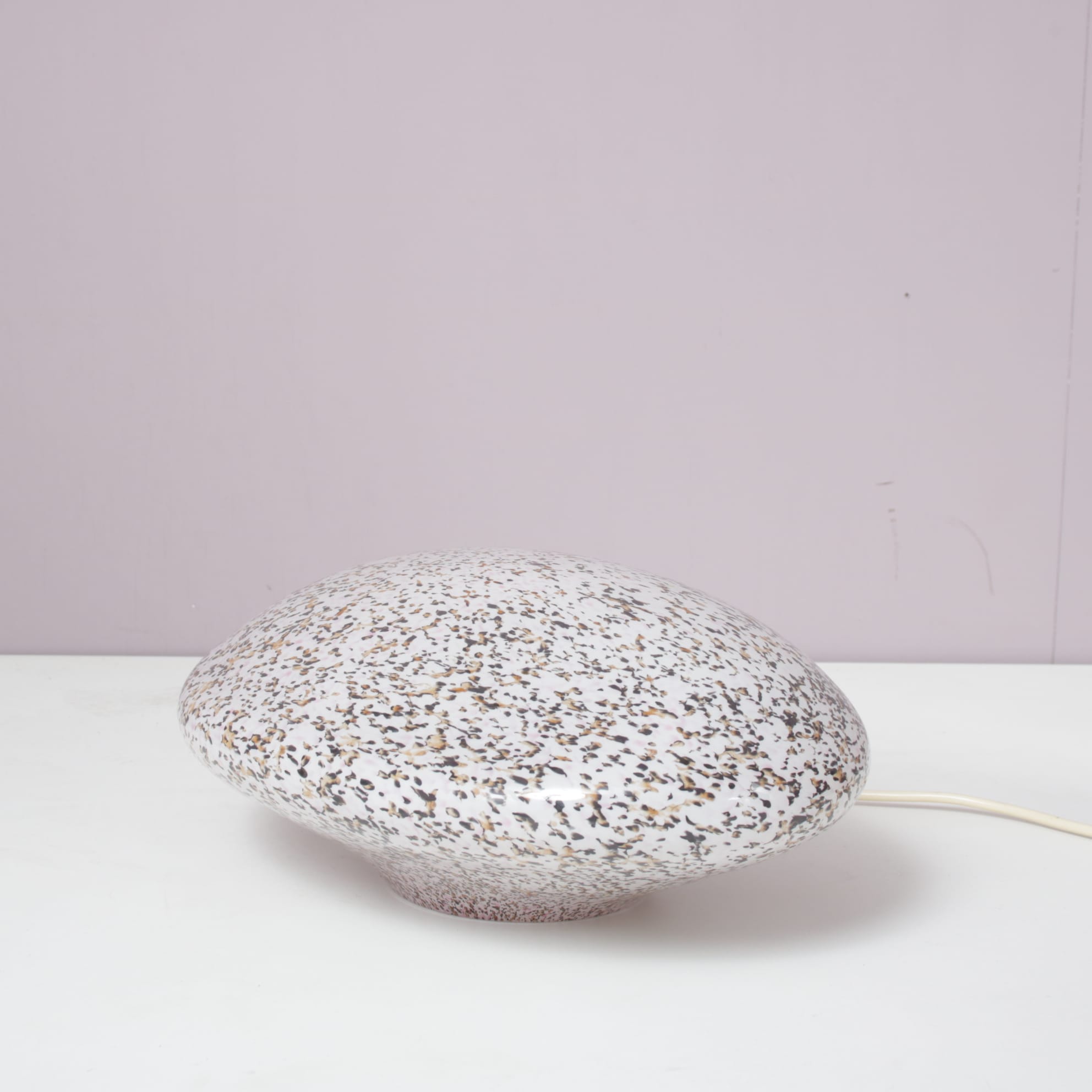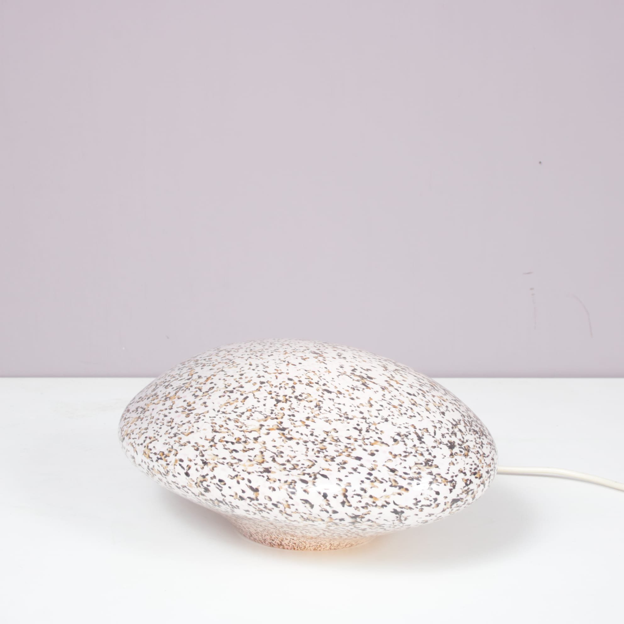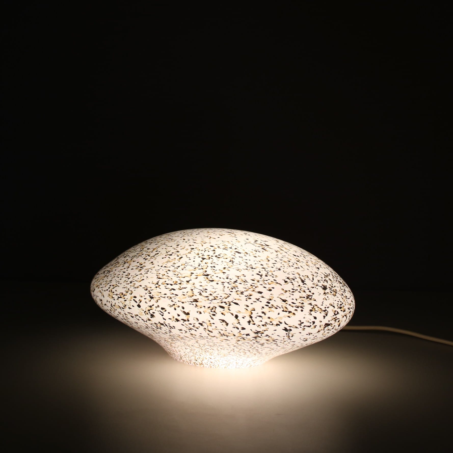 This elegant lamp is crafted from high-quality Murano glass with a shape resembling a stone, giving it a soft, organic appearance. When lit, the glass diffuses a warm and gentle glow, creating a warm and atmospheric effect. A refined decorative piece that highlights the artistry of Italian glassmaking while adding charm and character to any interior!