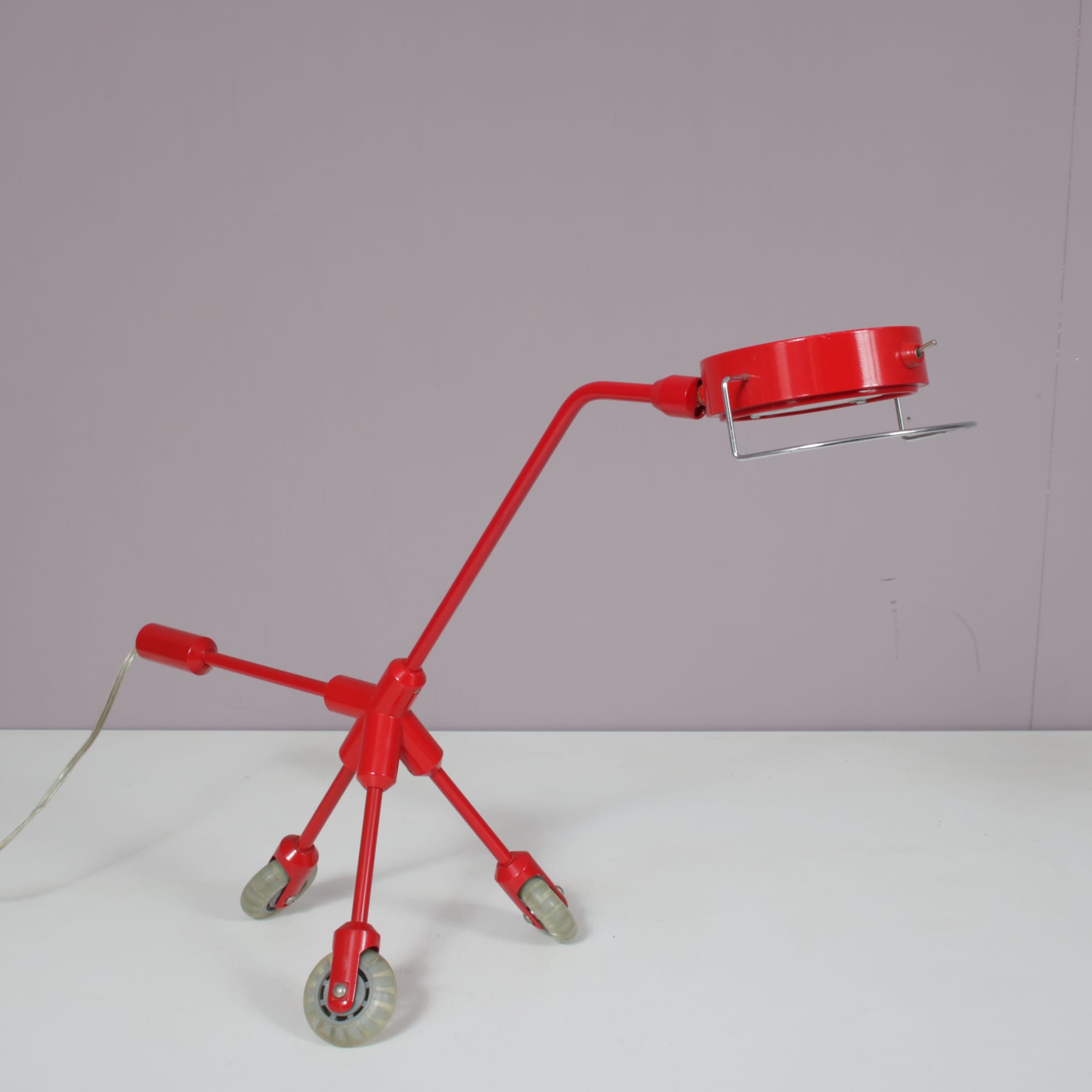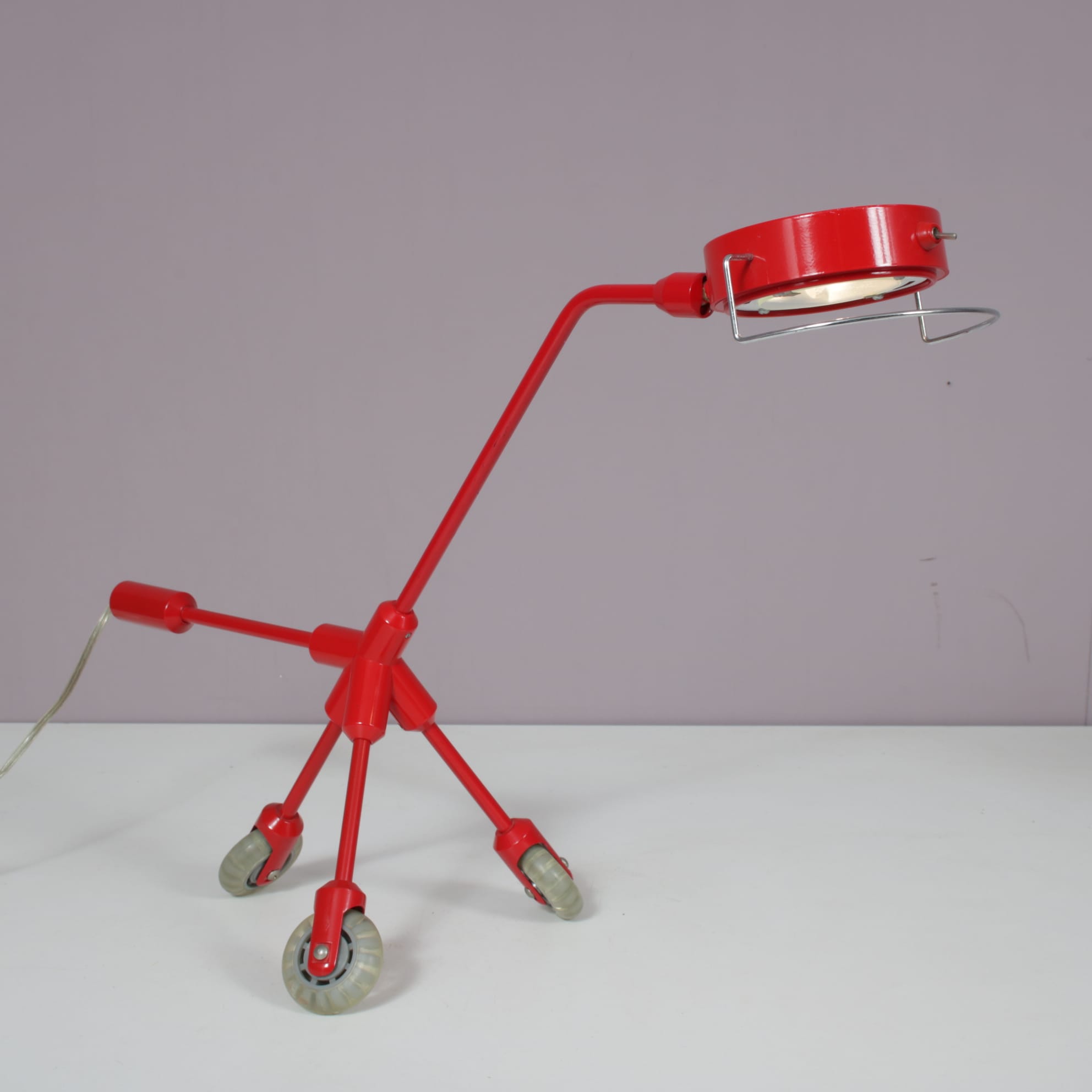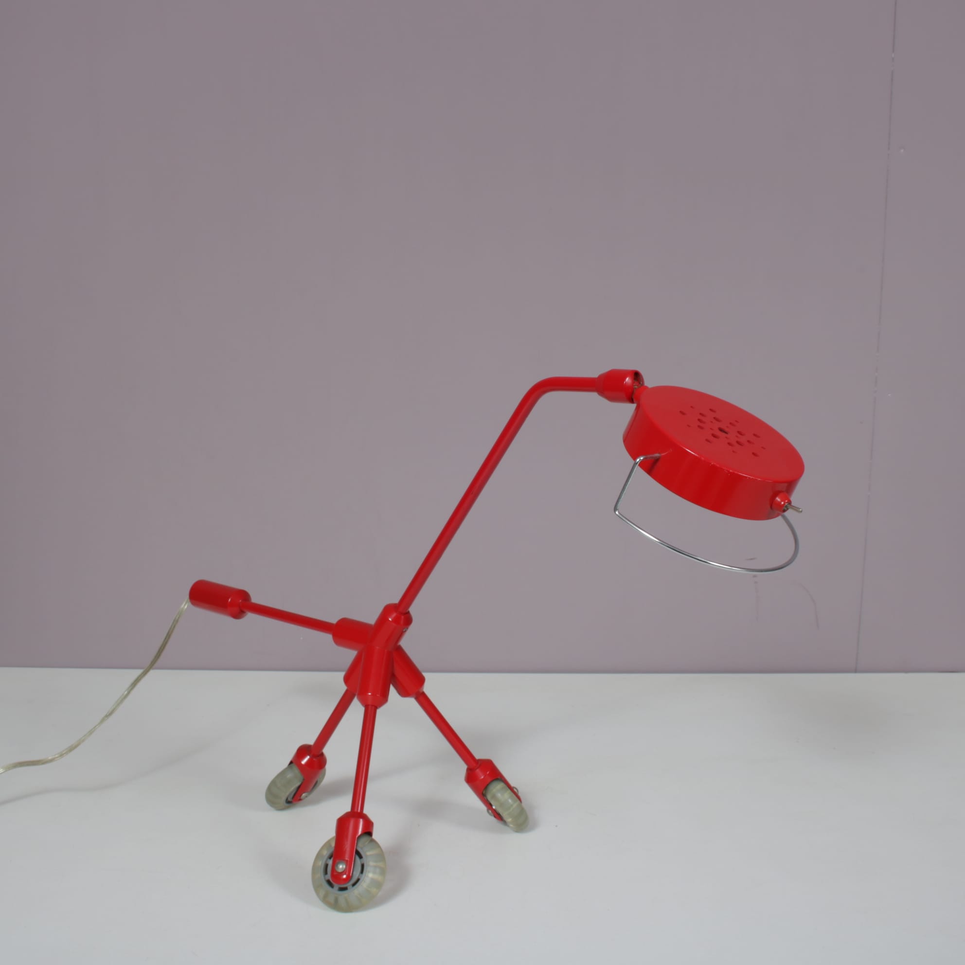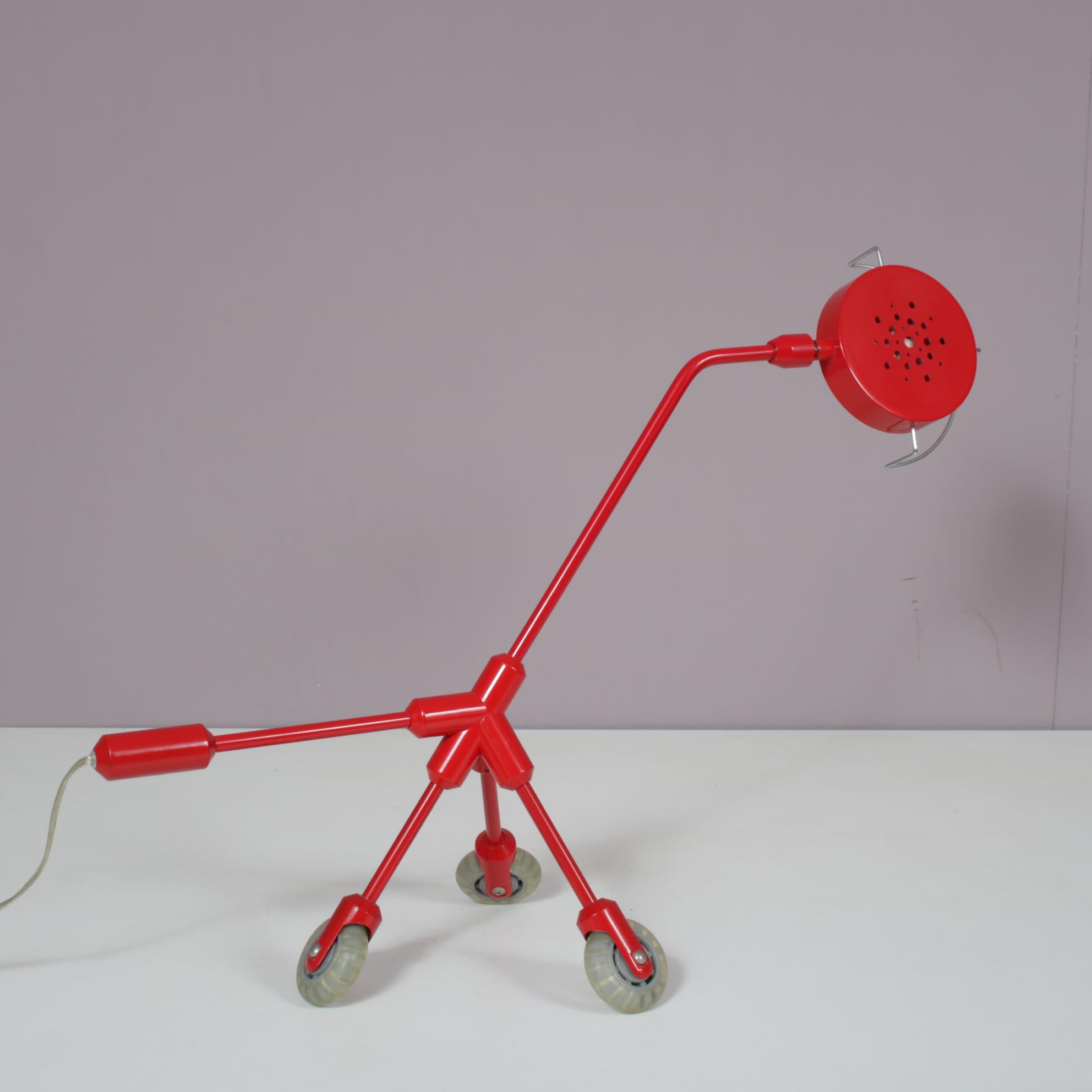 This lovely lamp features a bold red lacquered metal body with clean, minimalist lines. The playful design gives it a character like appearance, designed in an abstract dog shape! Standing on wheels for a playful sense of movability, the piece is also adjustable in lighting direction. A fun and very practical design that will a be fantastic addition to any office space!