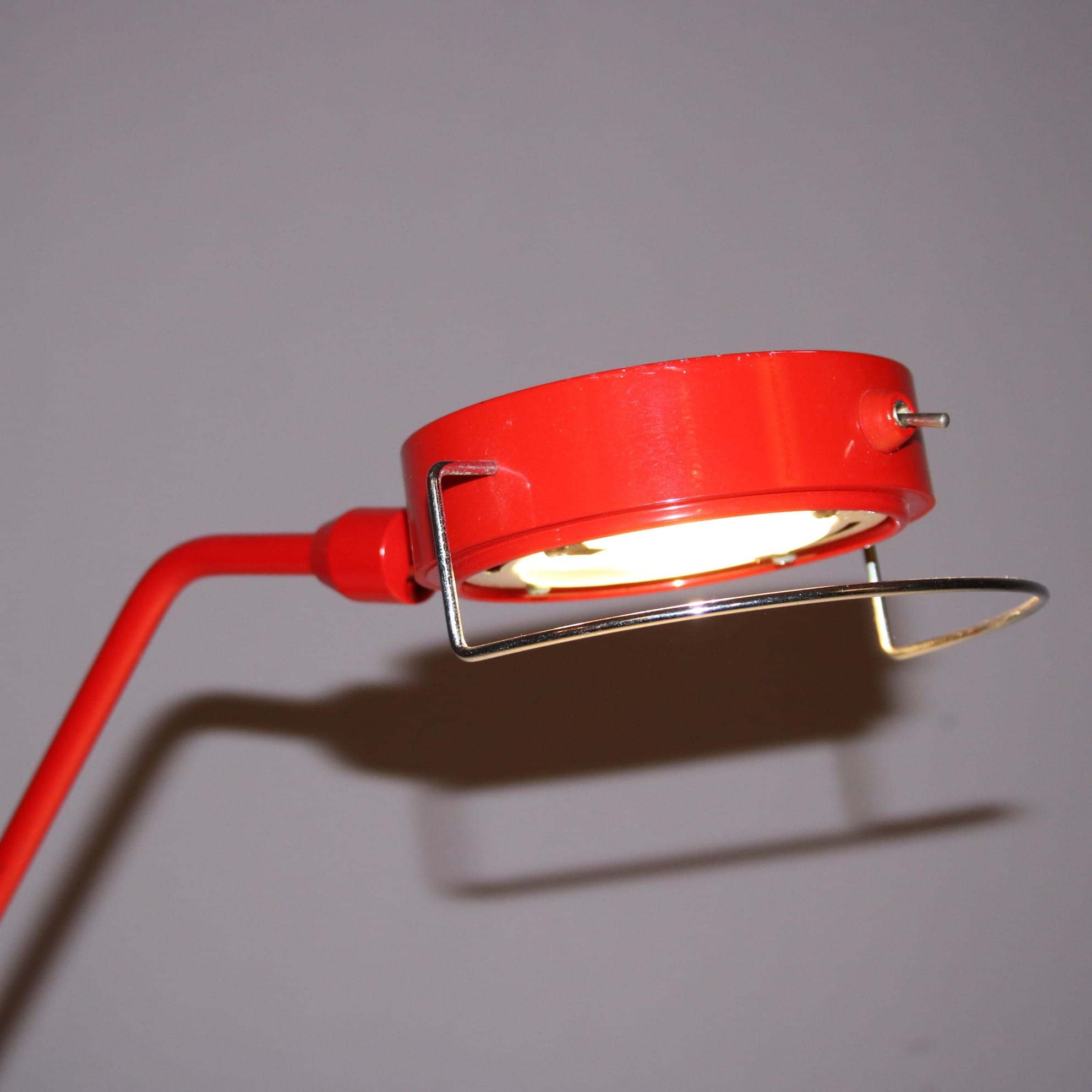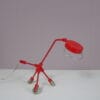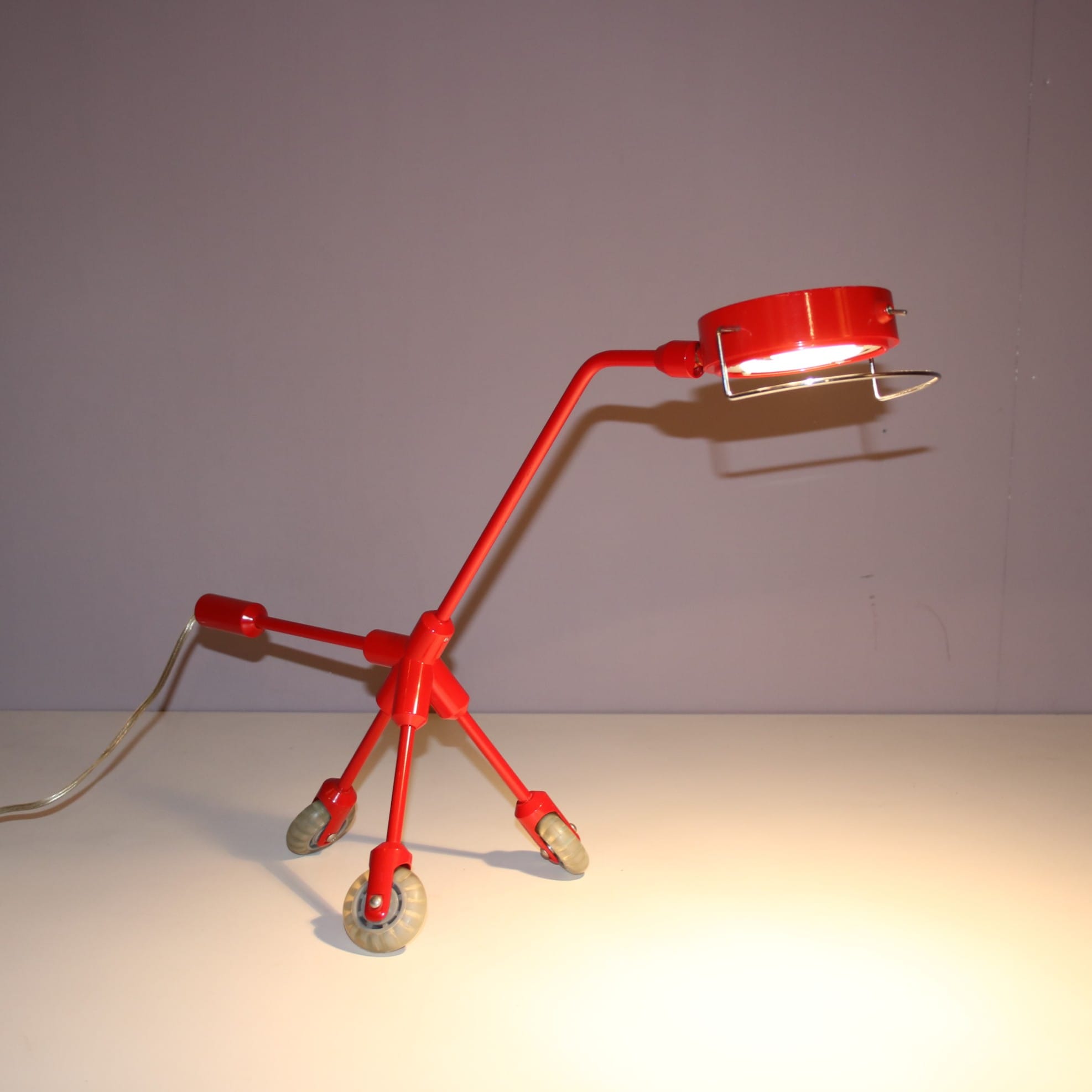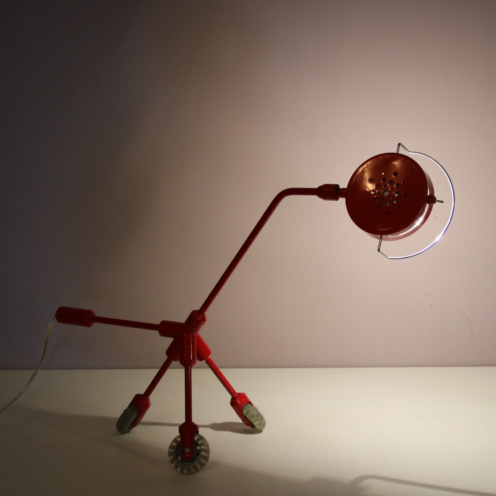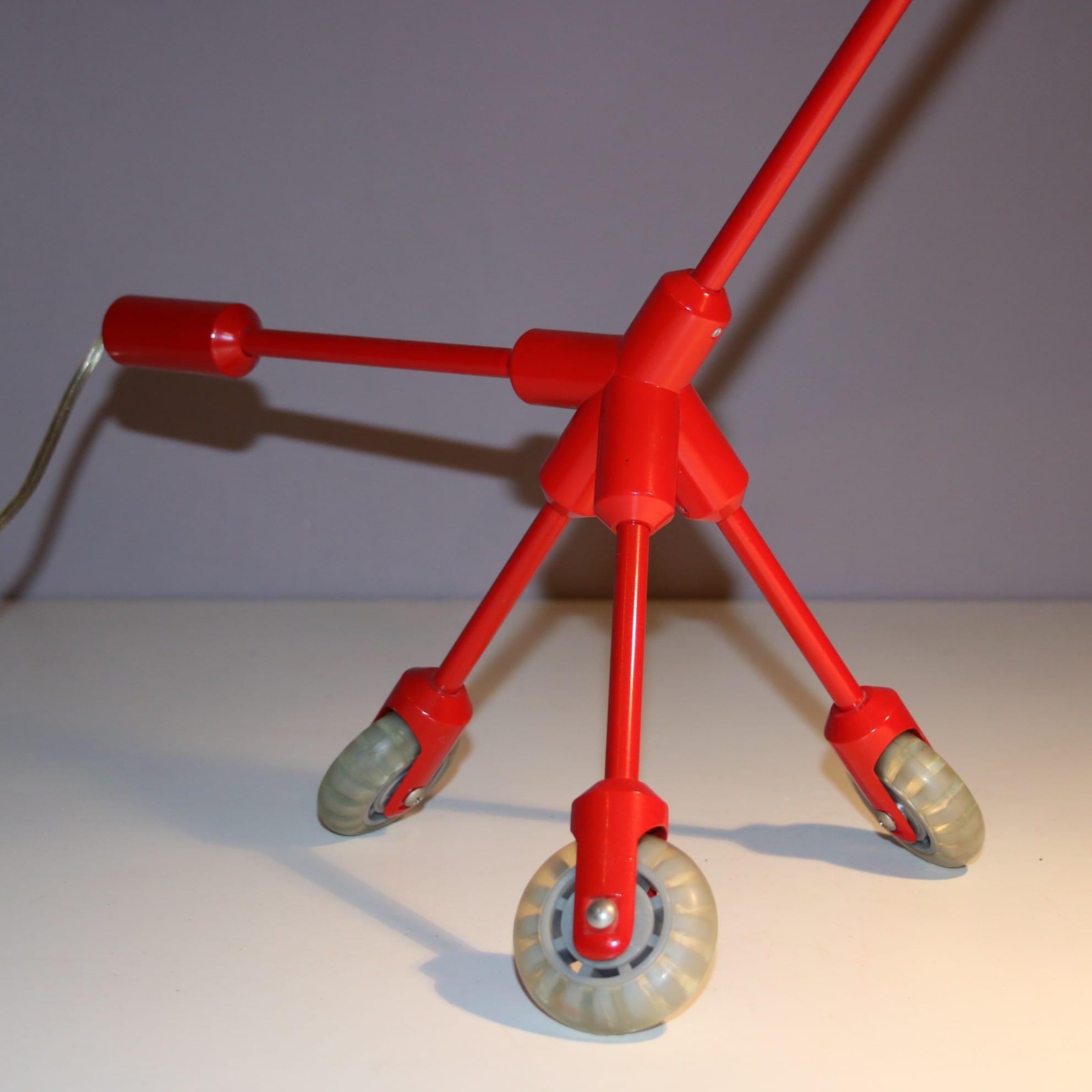 This lovely lamp features a bold red lacquered metal body with clean, minimalist lines. The playful design gives it a character like appearance, designed in an abstract dog shape! Standing on wheels for a playful sense of movability, the piece is also adjustable in lighting direction. A fun and very practical design that will a be fantastic addition to any office space!