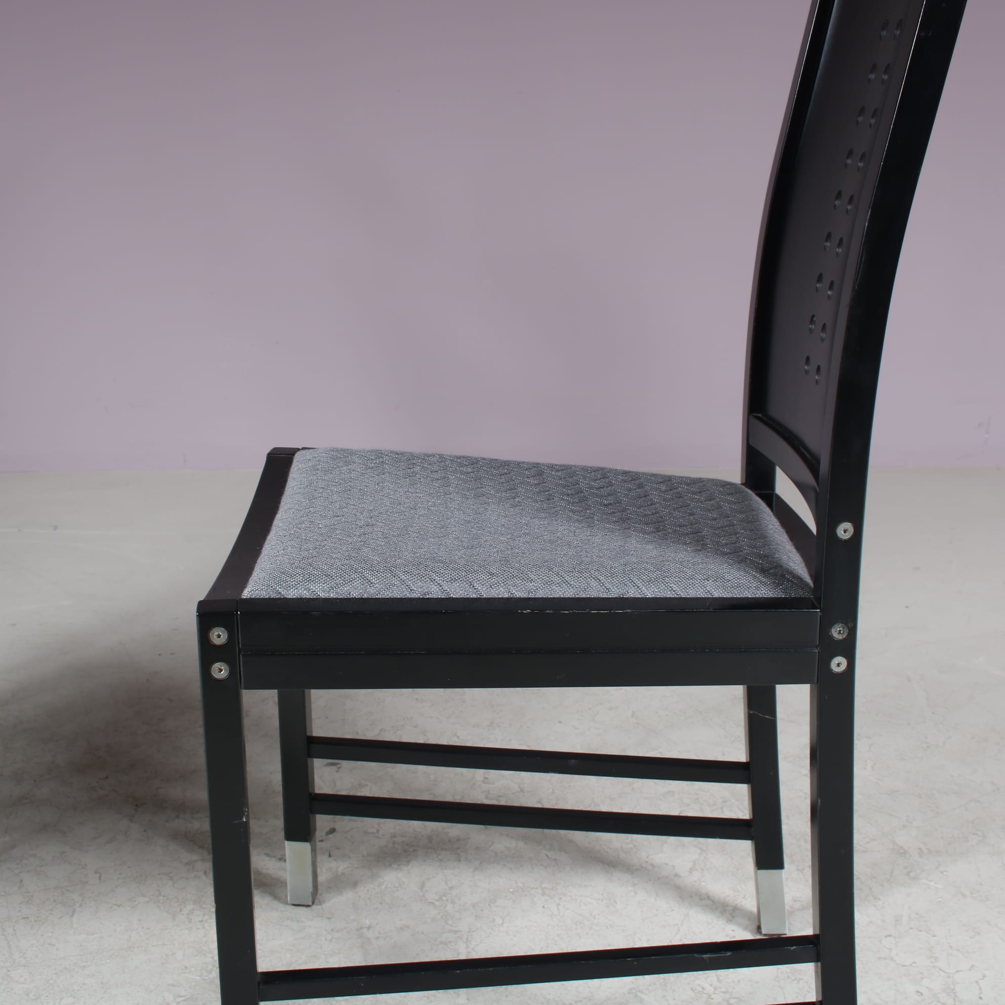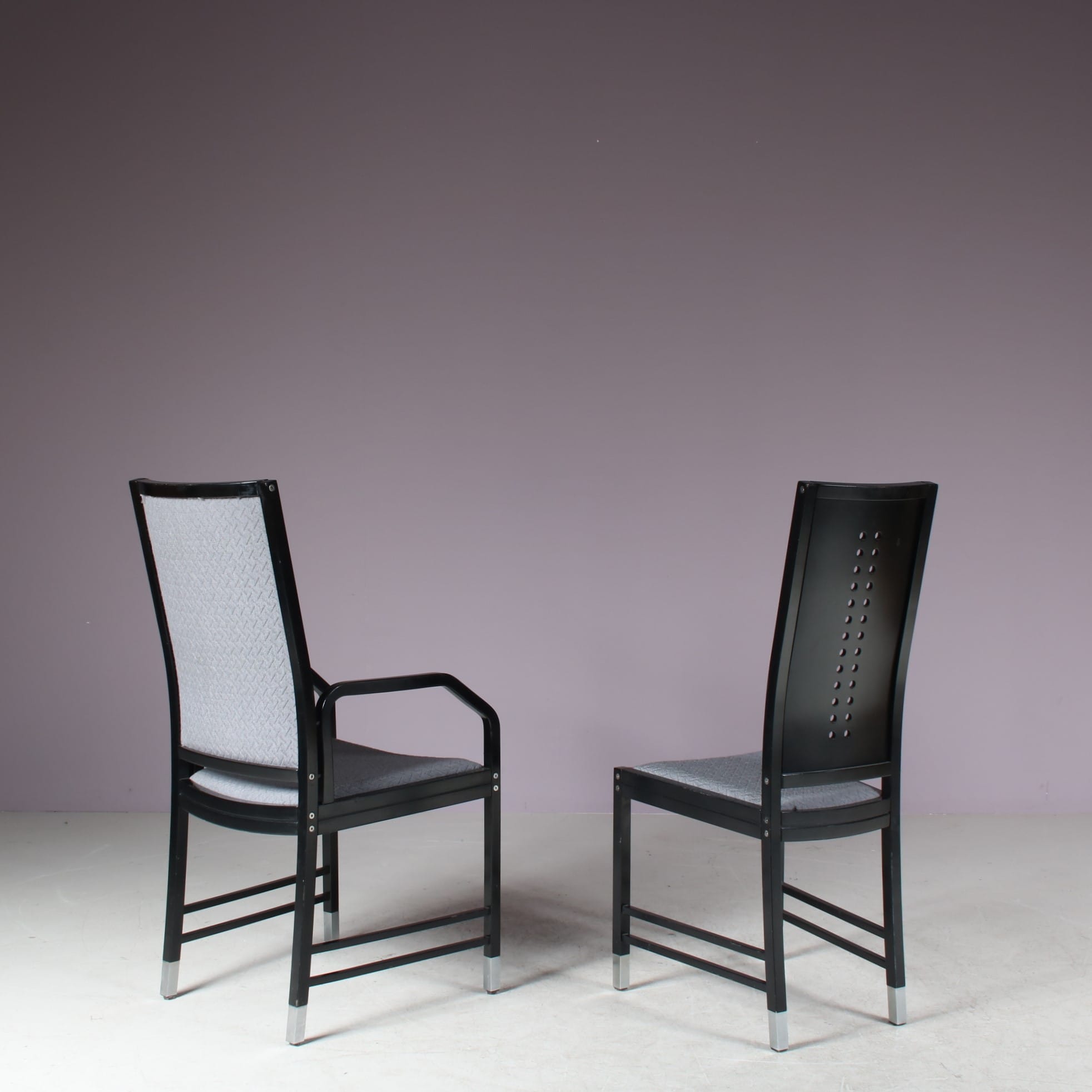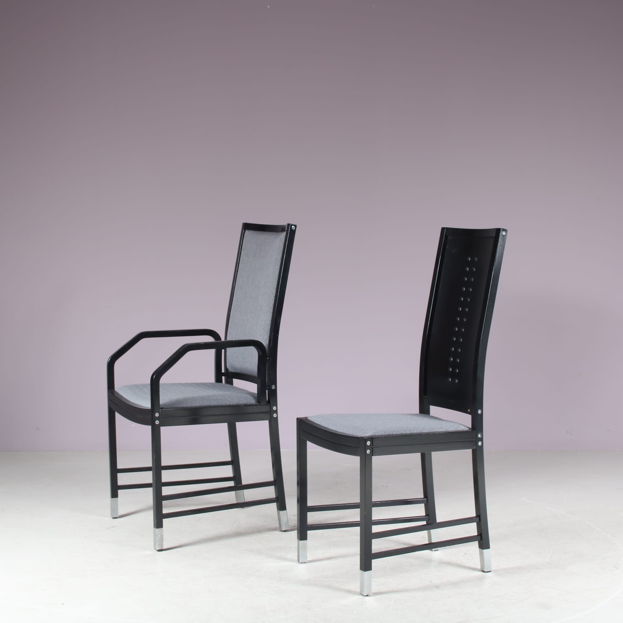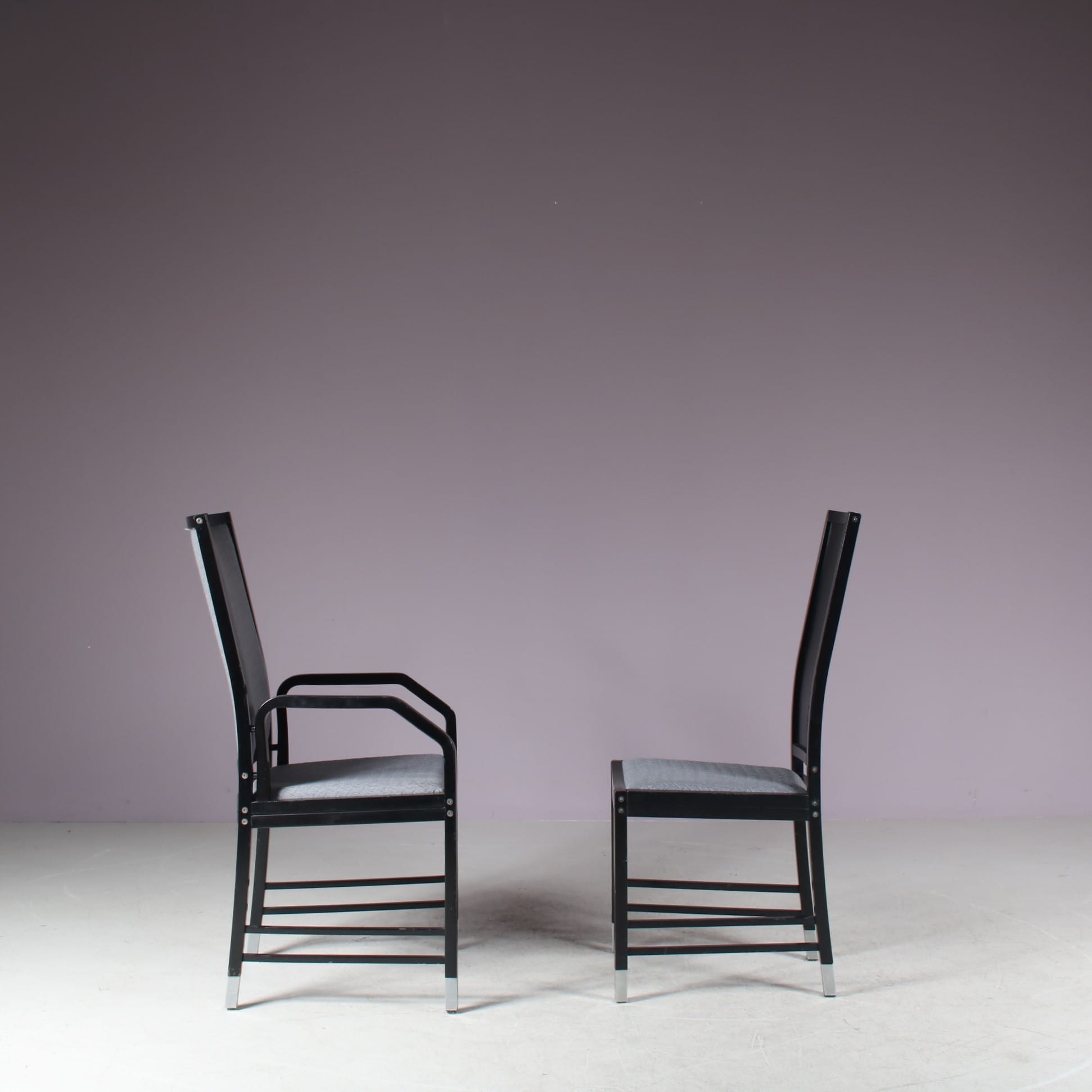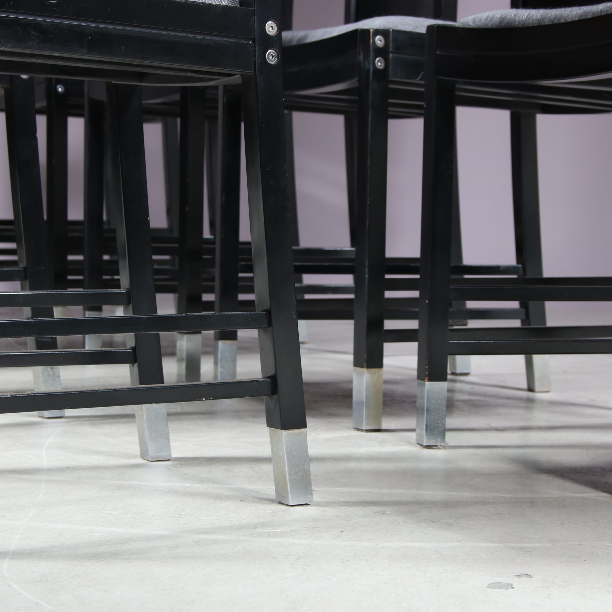 This eye-catching set is made of high quality black wood. The chairs have chrome plated metal leg ends which accentuates the elegant style of the pieces! They are from the so called “Fine Forms” series by Thonet. The chairs are newly upholstered in grey fabric with a beautiful subtle patterns in the structure. This fits perfectly with the luxurious design and the colour also matches the details of the leg ends. Two of the chairs have armrests, making them perfectly suitable for the heads of the table!