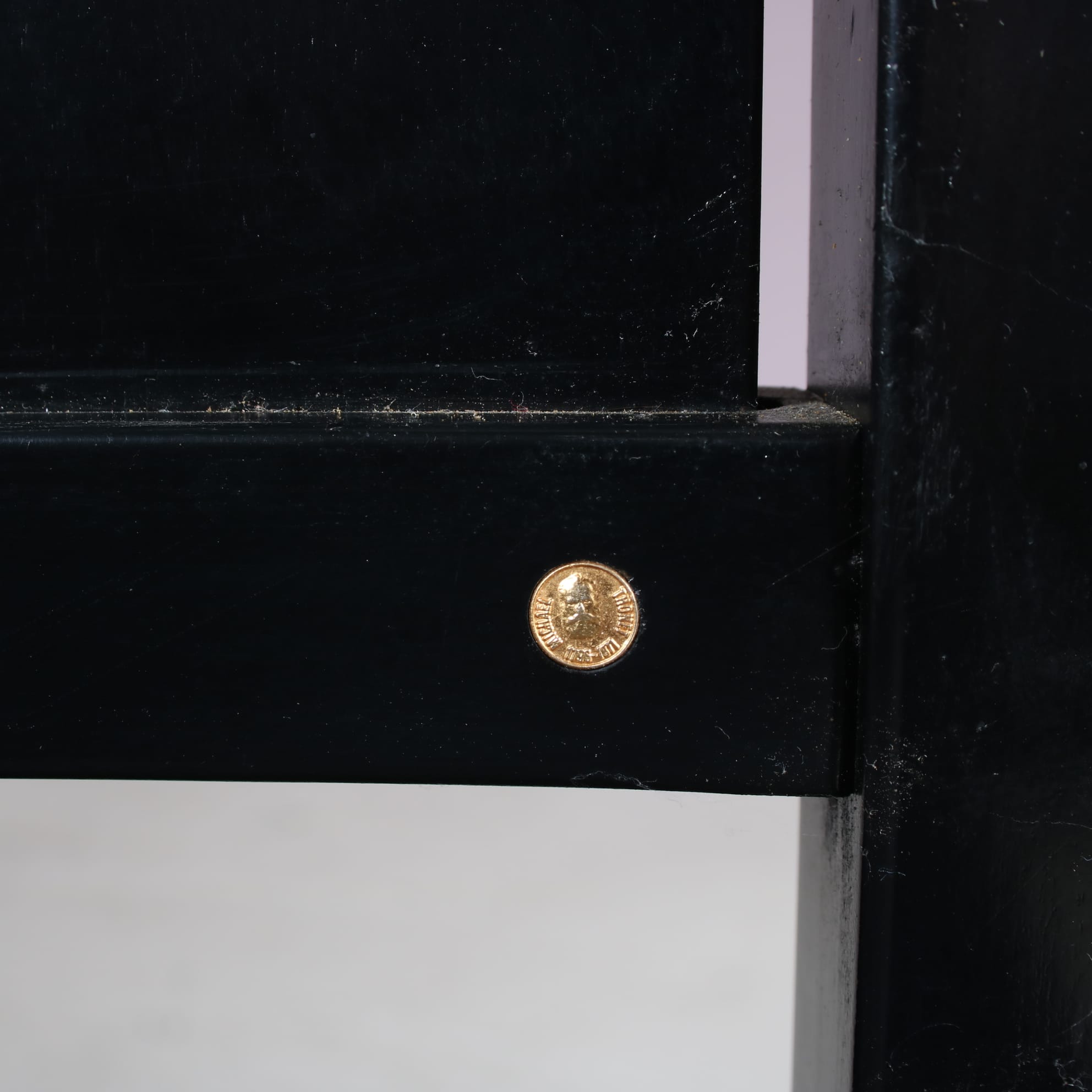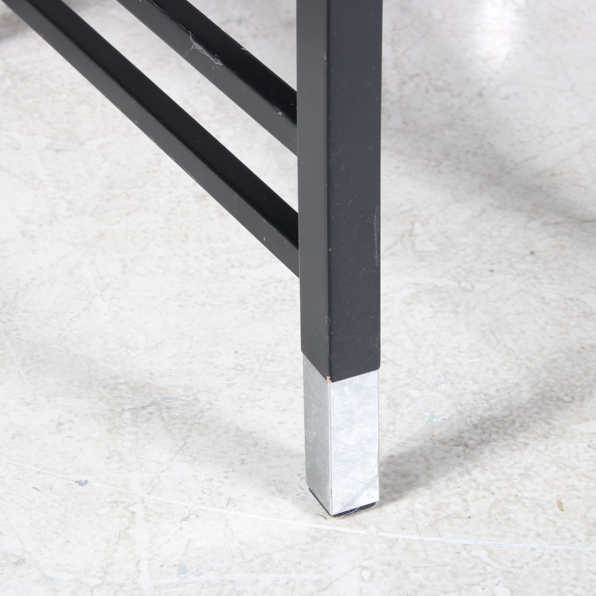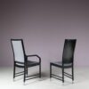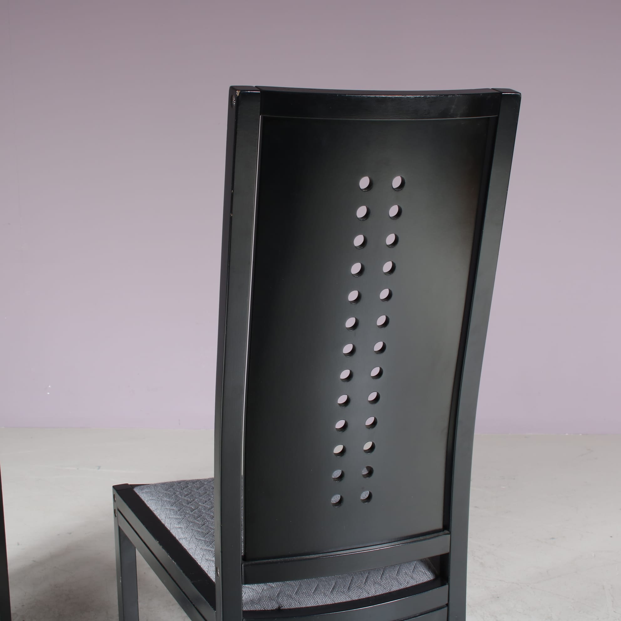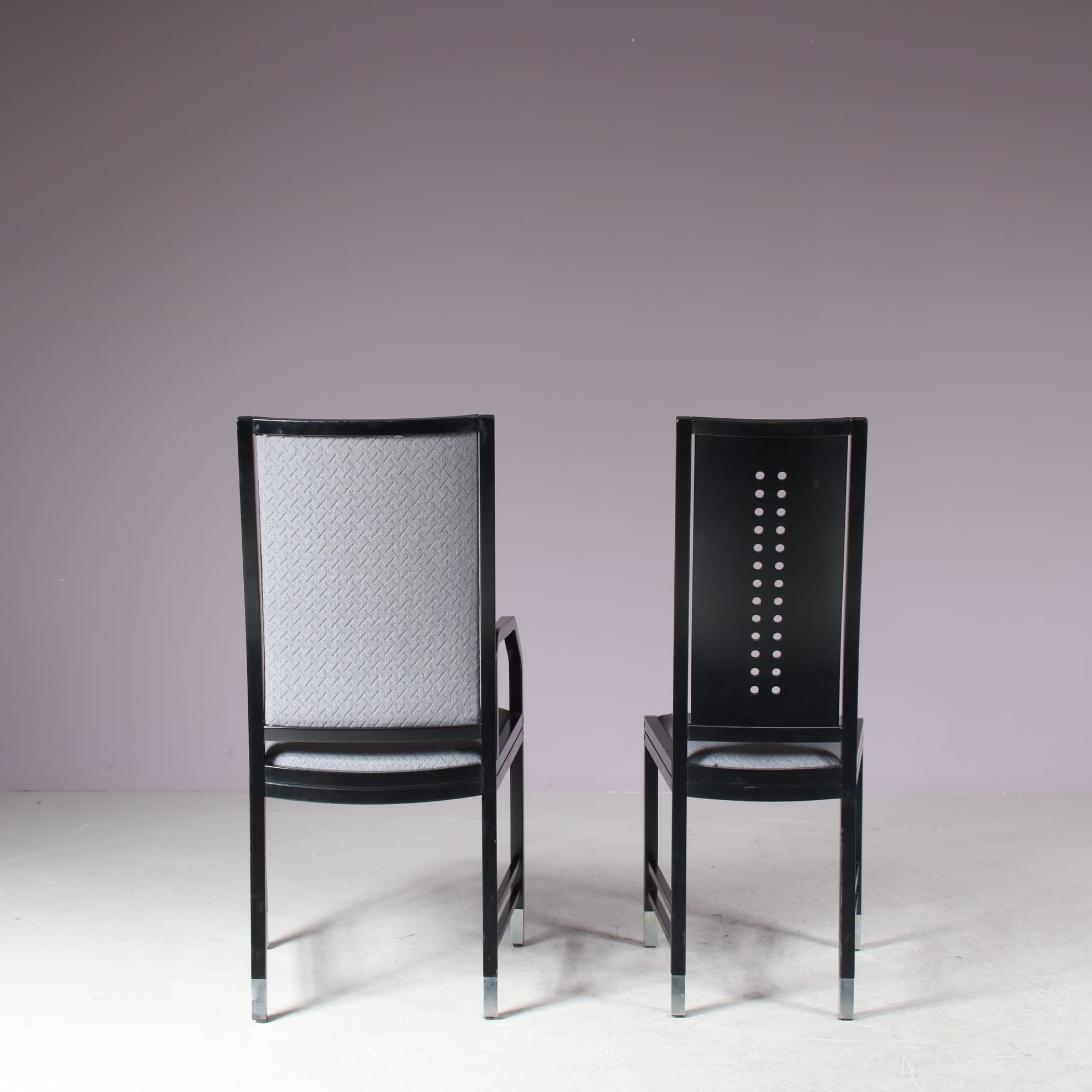 This eye-catching set is made of high quality black wood. The chairs have chrome plated metal leg ends which accentuates the elegant style of the pieces! They are from the so called “Fine Forms” series by Thonet. The chairs are newly upholstered in grey fabric with a beautiful subtle patterns in the structure. This fits perfectly with the luxurious design and the colour also matches the details of the leg ends. Two of the chairs have armrests, making them perfectly suitable for the heads of the table!